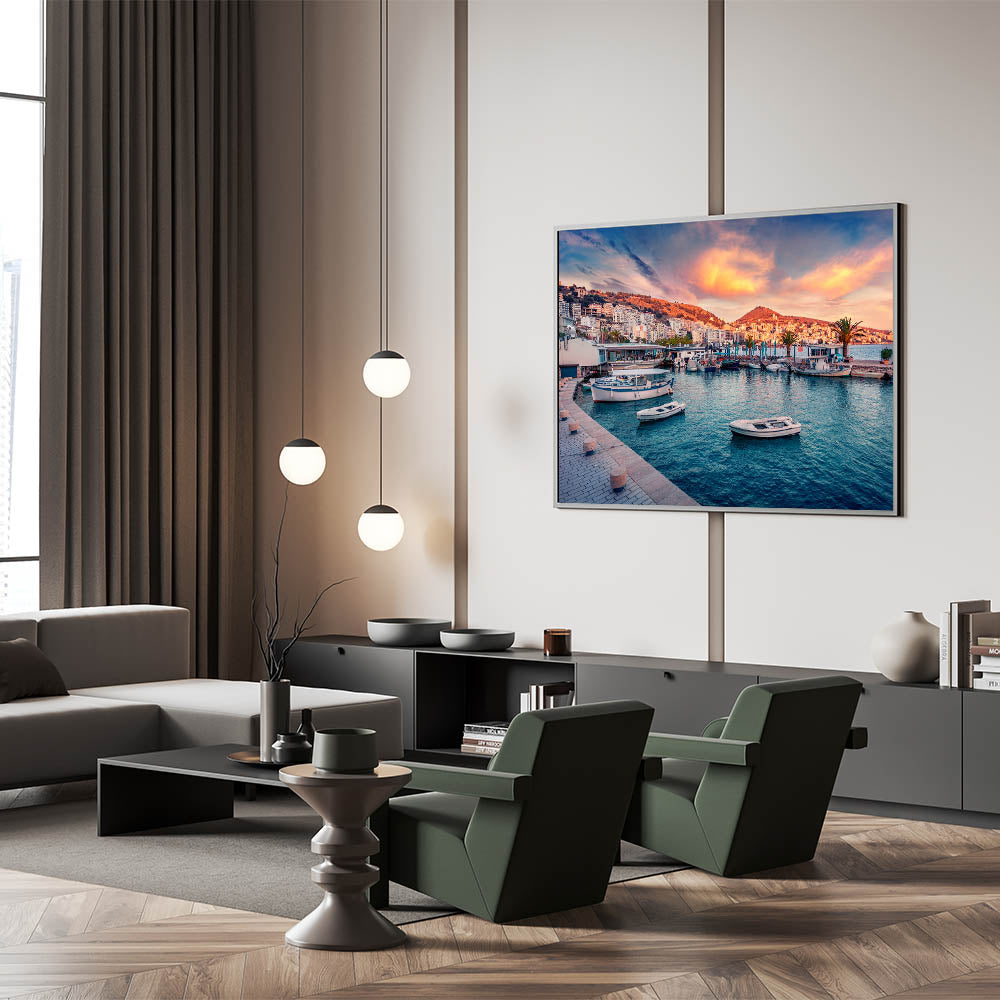 - Albanian Travel Poster: Showcasing the sunset-lit harbor of Saranda, this piece is ideal for beach or coastal-themed interiors.
