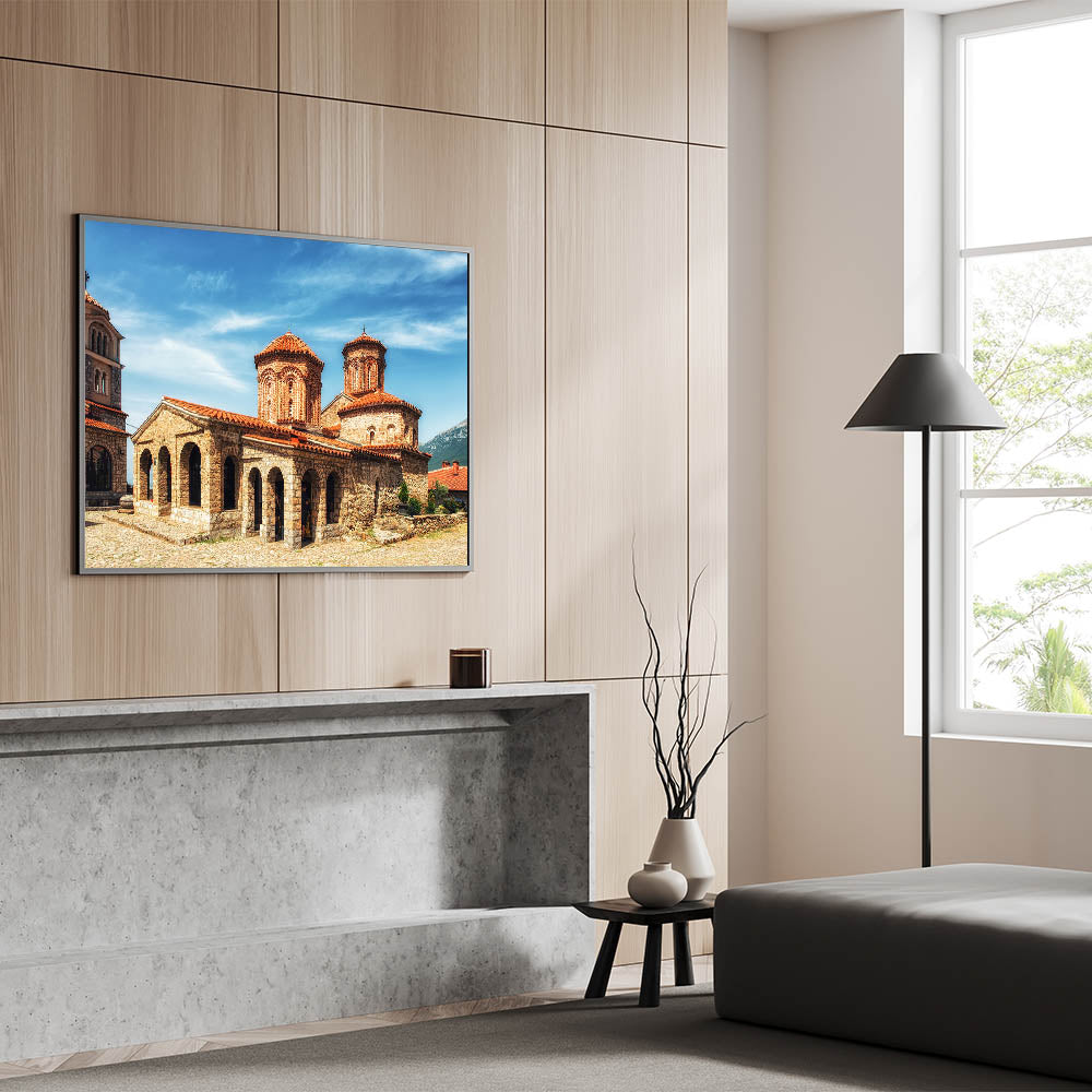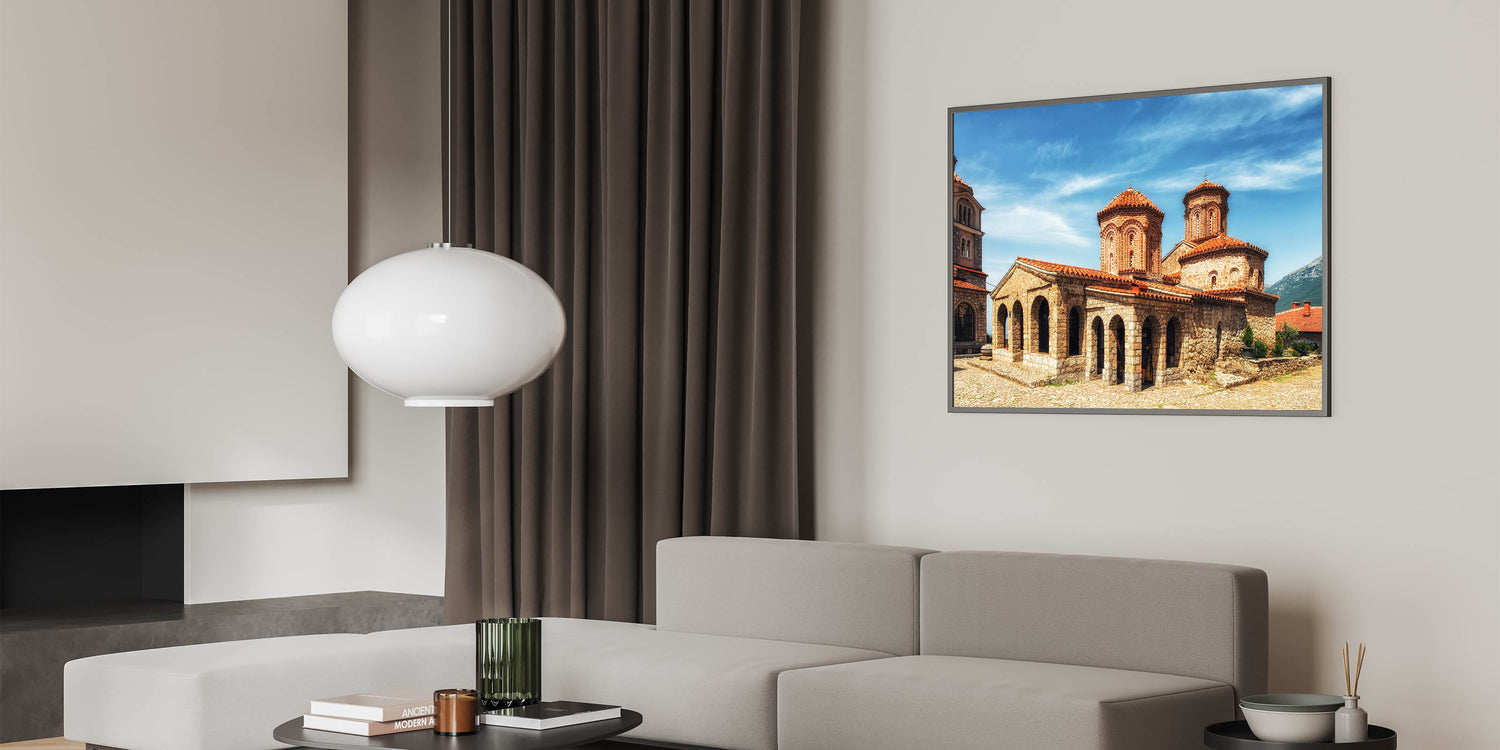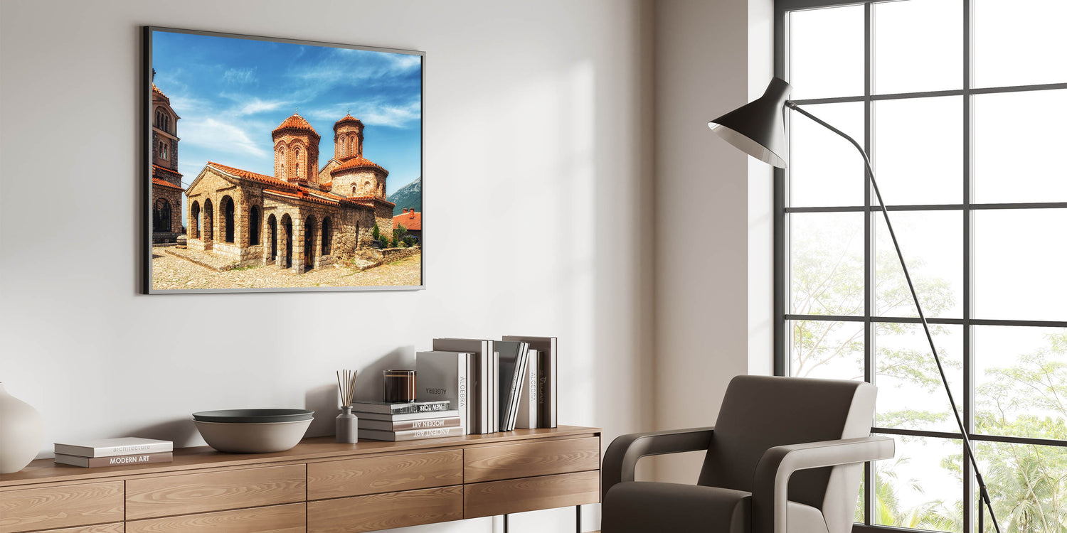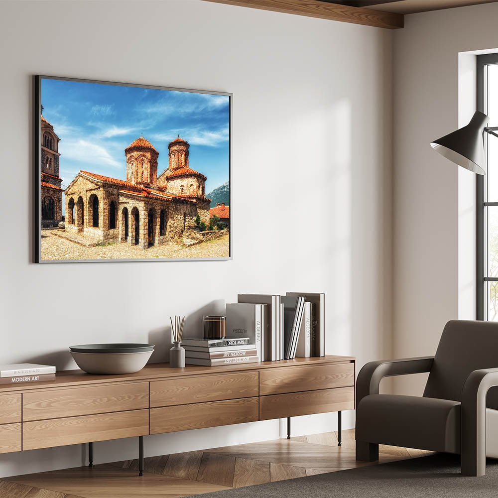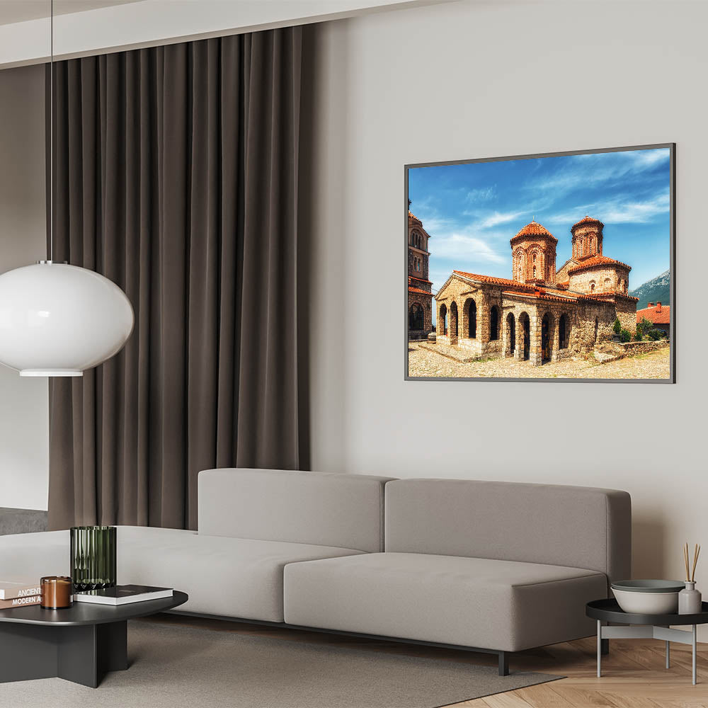 This stunning Albanian Landscape Print captures the beauty and serenity of a historic church set in the peaceful Albanian countryside. With its intricate stonework and iconic Byzantine architecture, this Albania Canvas Art is a perfect reflection of Albania’s rich cultural heritage. The red-tiled roofs and stone structures stand proudly against a backdrop of blue skies, making this Scenic Albania Art an ideal addition to any home or office decor.