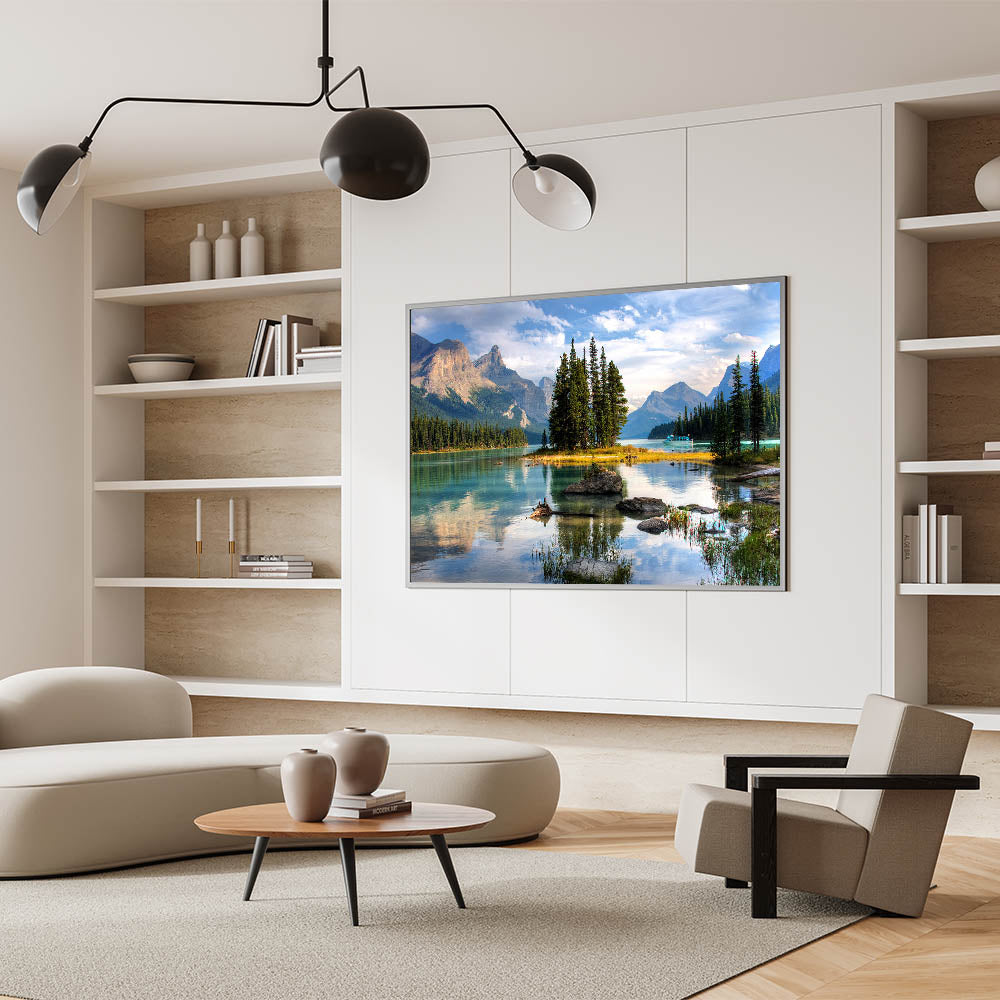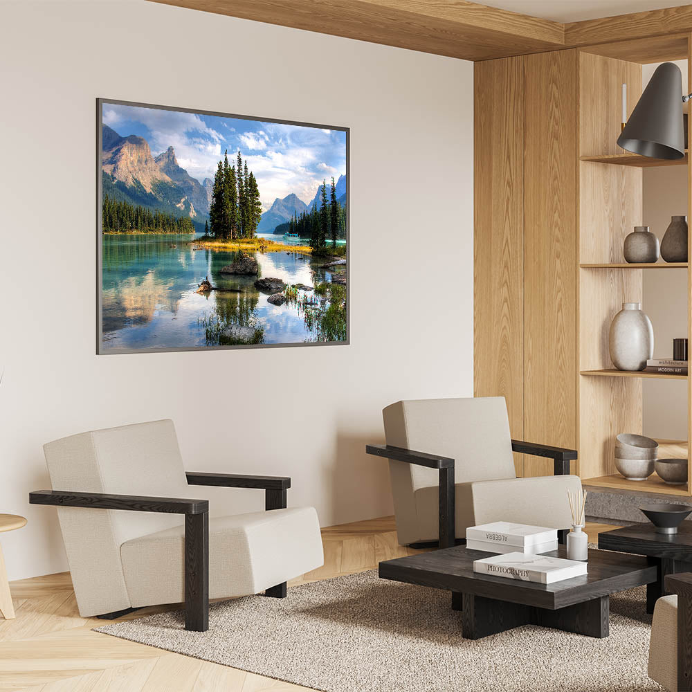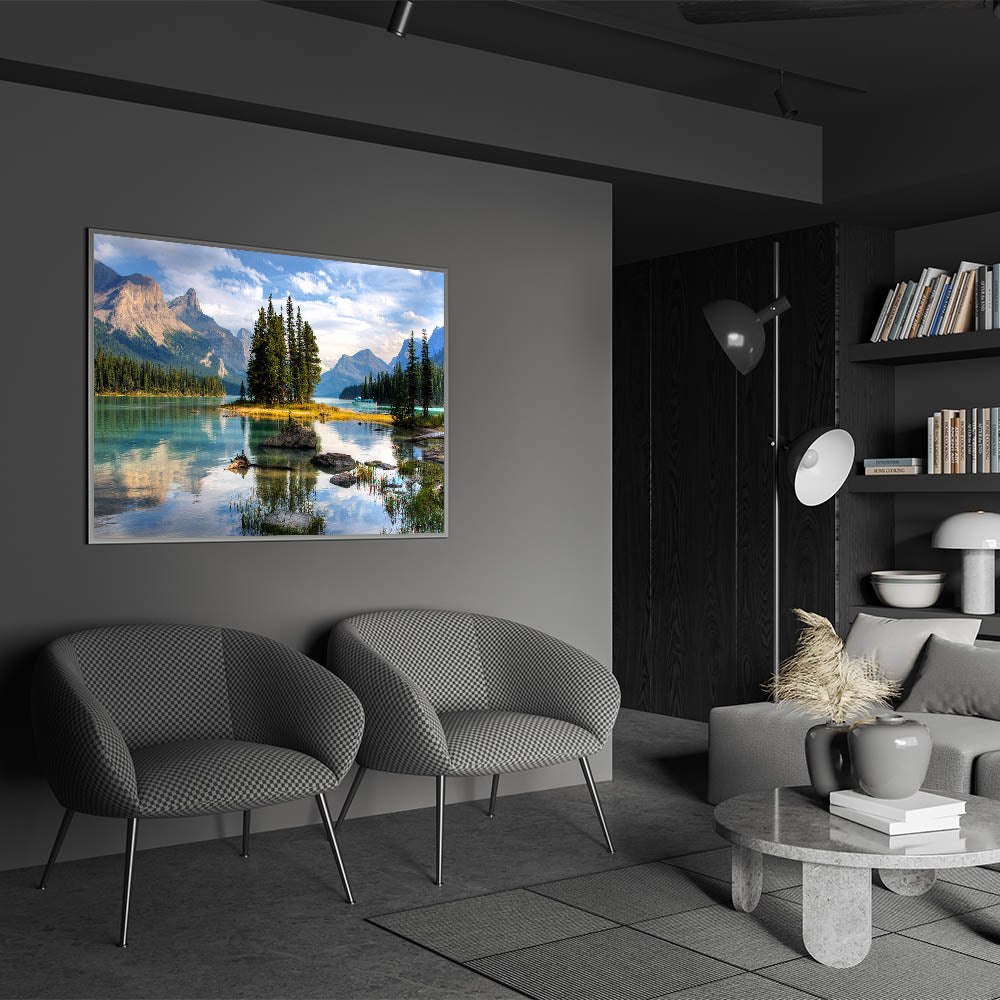 Experience the breathtaking beauty of Alberta’s iconic Spirit Island on Maligne Lake with this stunning wall art, showcasing the serene waters and majestic mountains of Jasper National Park. This Alberta Scenic Wall Art captures the tranquil scene of Spirit Island, surrounded by crystal-clear waters and framed by towering peaks. The lush greenery of the trees and the deep blues and greens of the lake create a vibrant and peaceful image that brings the essence of the Canadian Rockies into your home.