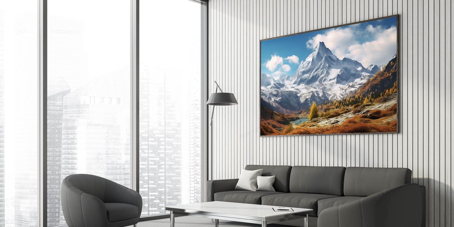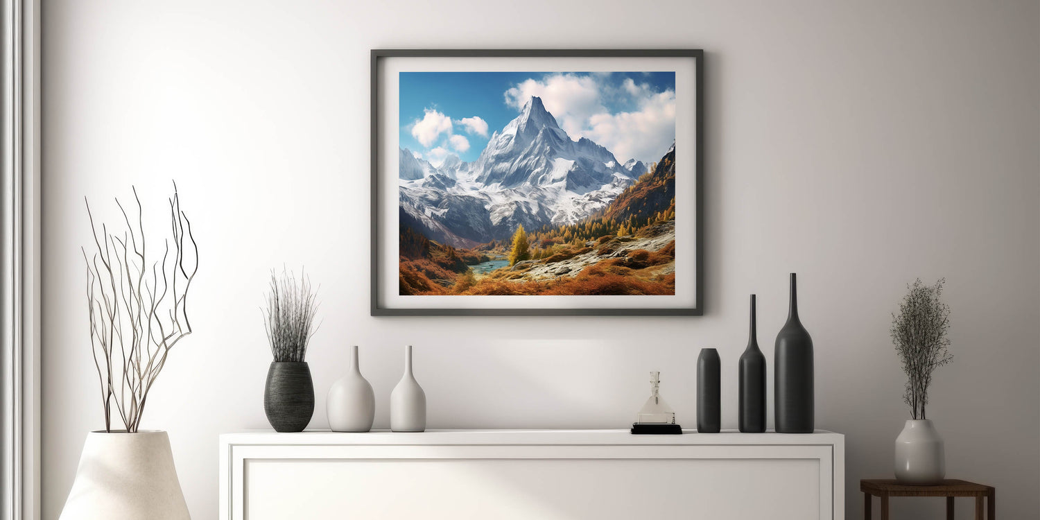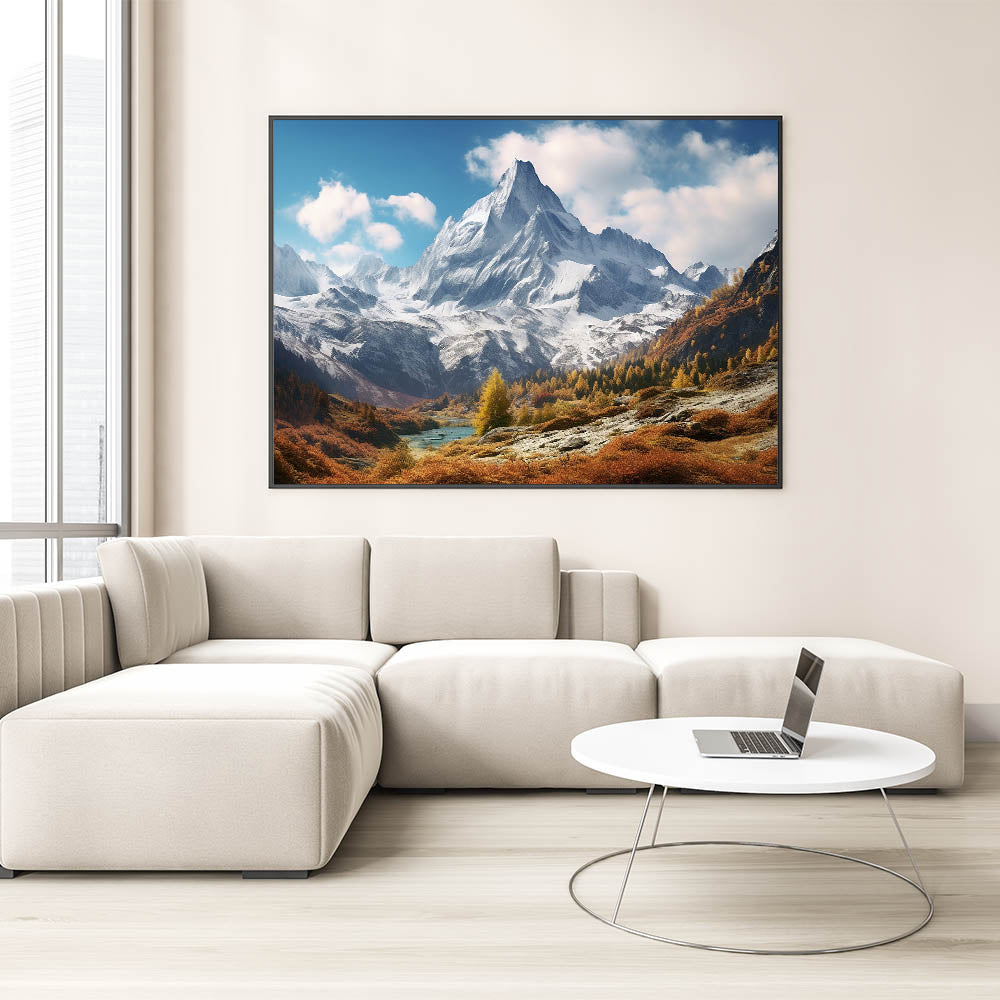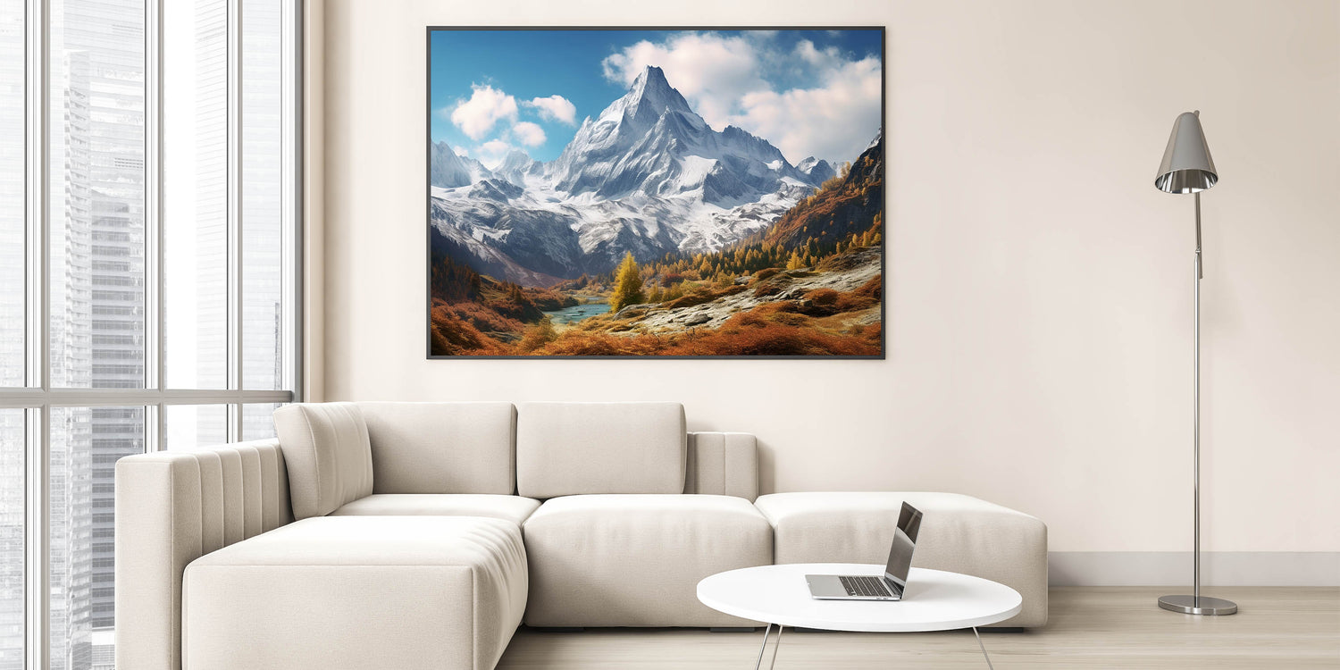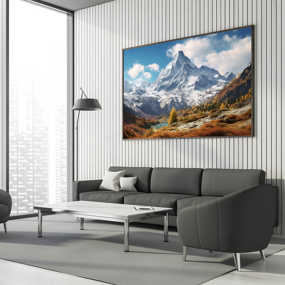 Transform your space with the majestic beauty of the French Alps through this stunning wall art. The towering snow-capped peak rises against the brilliant blue sky, while the autumn-hued valley below creates a rich contrast of colors. The golden foliage and crisp mountain air are perfectly captured, making this piece a breathtaking addition to any nature lover’s home. The intricate details of the alpine landscape offer a sense of tranquility and adventure, bringing the beauty of the outdoors into your living space.