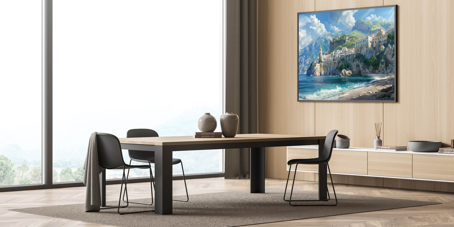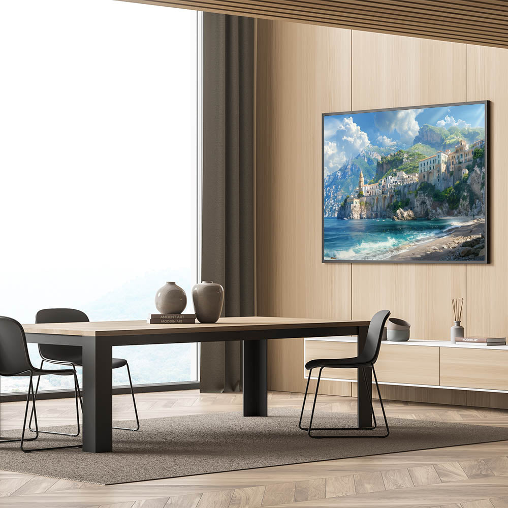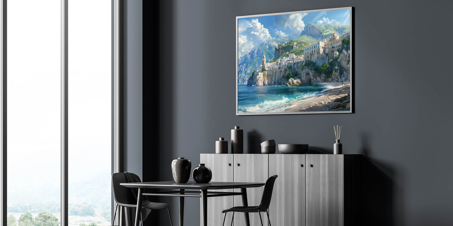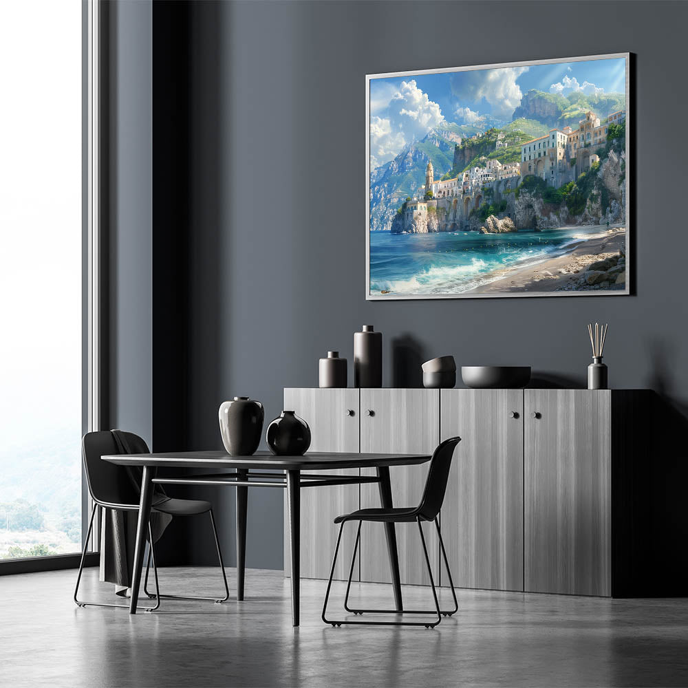 Immerse yourself in the breathtaking beauty of Italy’s Amalfi Coast with this stunning wall art featuring the dramatic cliffs and pristine waters of this iconic region. The intricate architecture of the hillside village, perched above the sparkling Mediterranean, creates a captivating contrast with the natural surroundings, making this a perfect addition to your home decor.