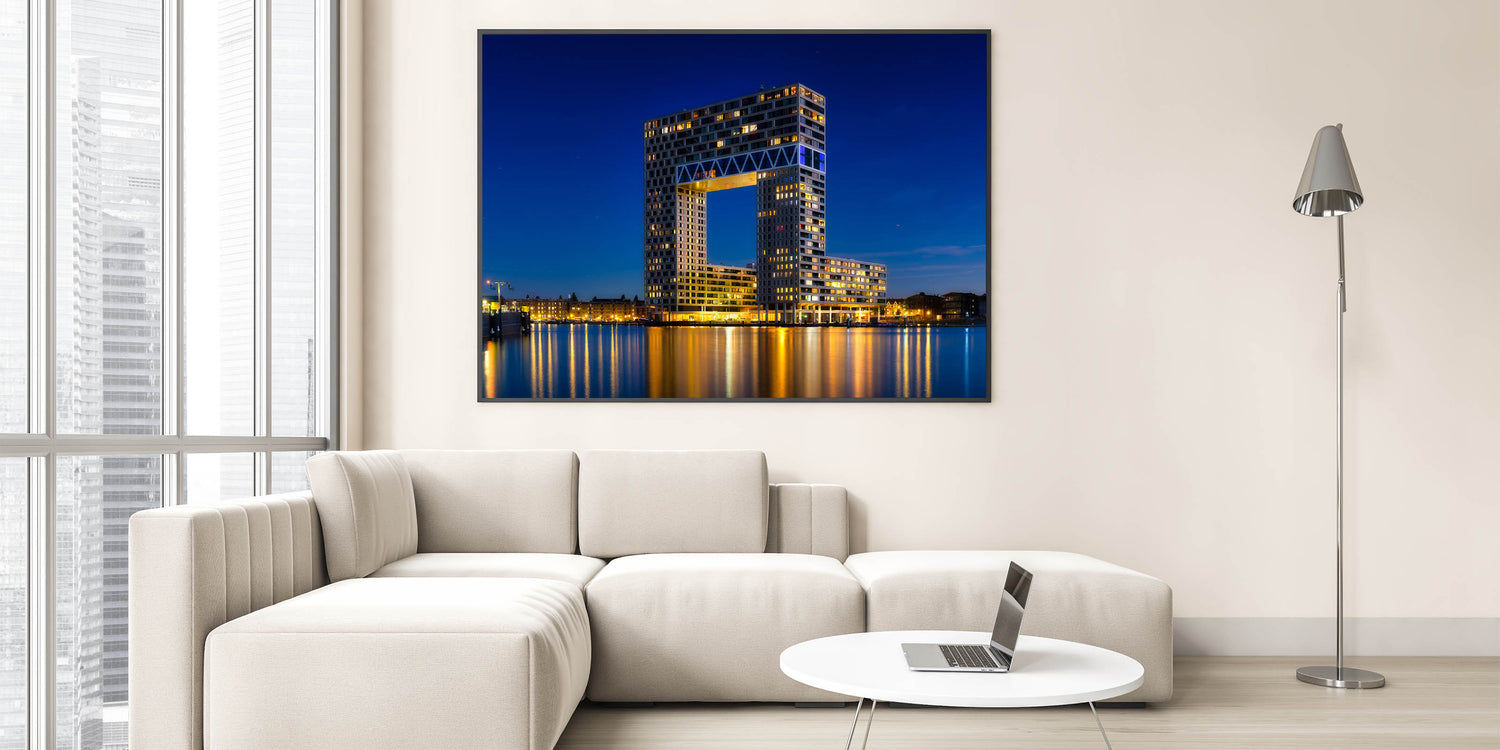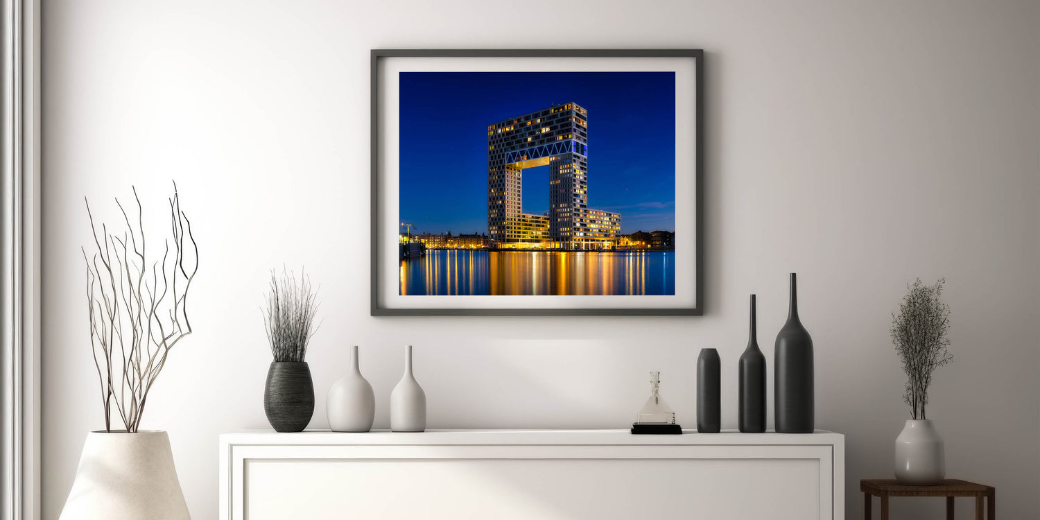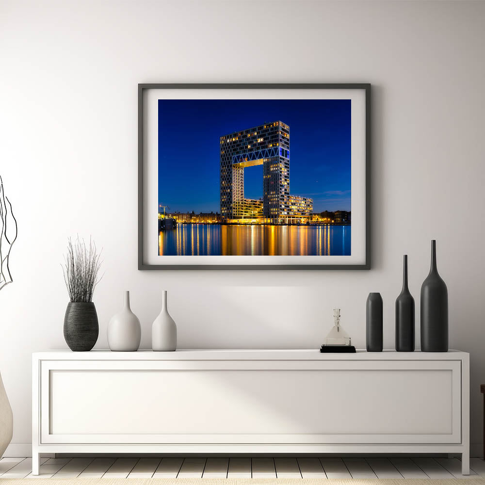 Add a touch of modern elegance to your space with this striking Amsterdam photography print, featuring a stunning architectural structure reflected in the calm waters of the city at night. This artwork from our Amsterdam art collection captures the sleek lines and glowing lights of iconic Amsterdam scenes, offering a breathtaking view of the city’s contemporary skyline.