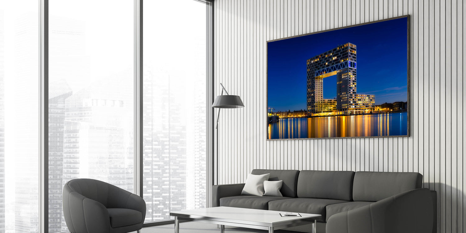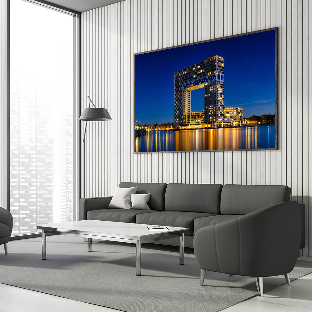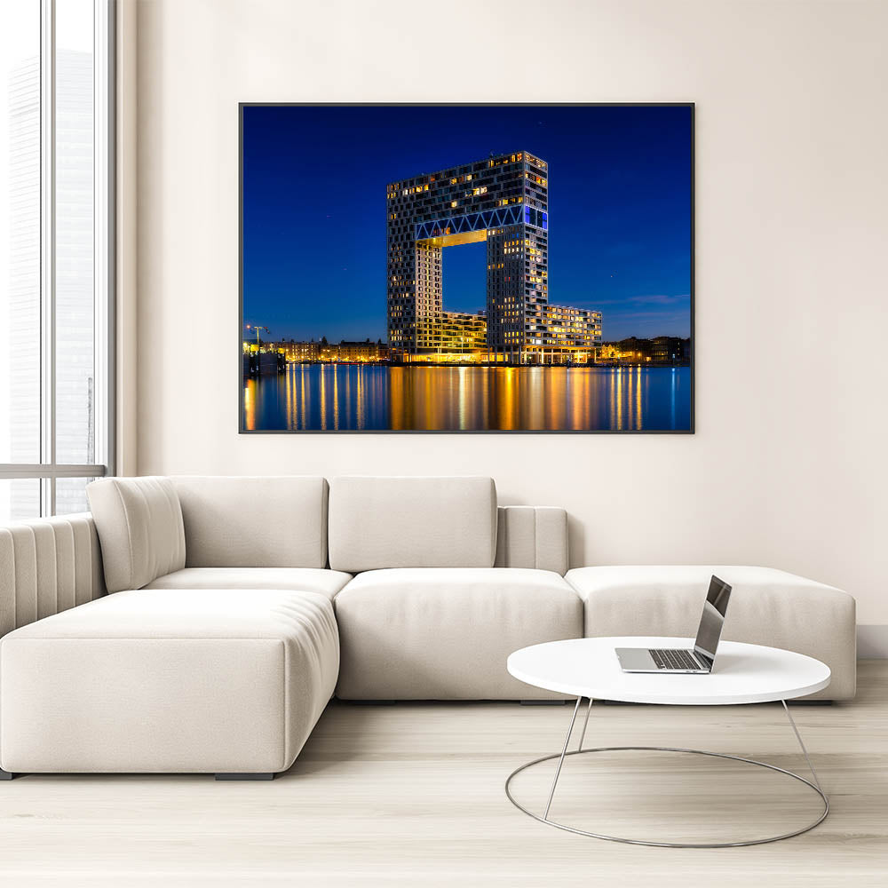 Add a touch of modern elegance to your space with this striking Amsterdam photography print, featuring a stunning architectural structure reflected in the calm waters of the city at night. This artwork from our Amsterdam art collection captures the sleek lines and glowing lights of iconic Amsterdam scenes, offering a breathtaking view of the city’s contemporary skyline.