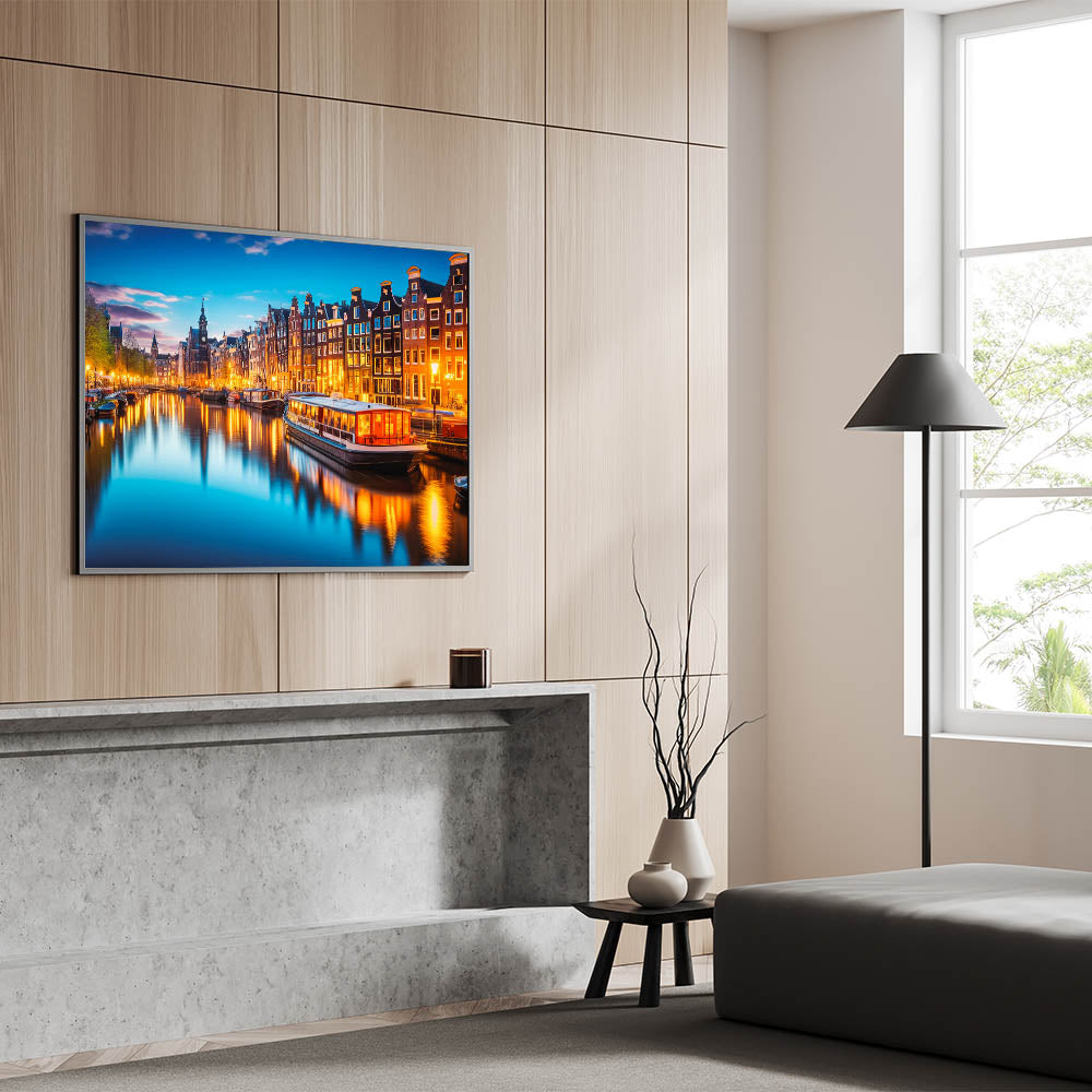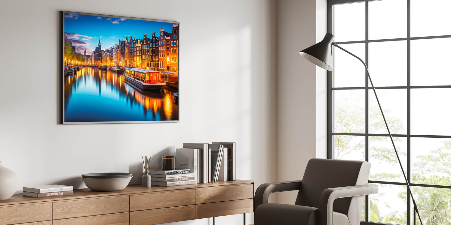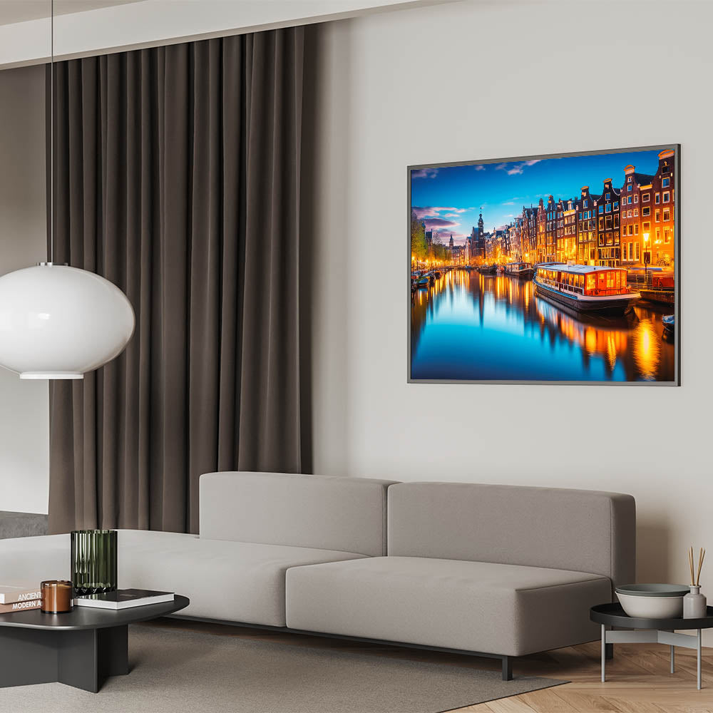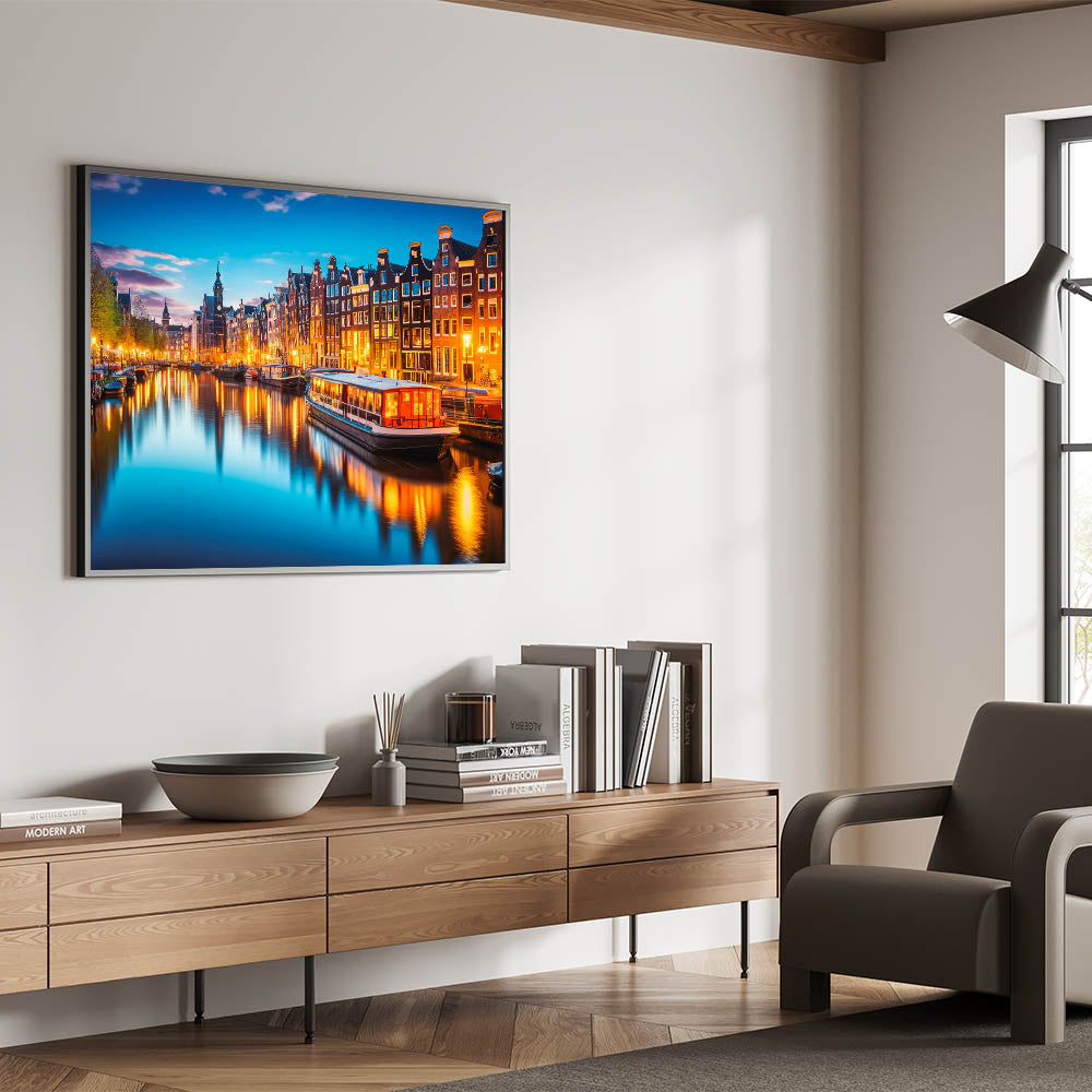Transform your space with this captivating Amsterdam scenic print, featuring the glowing lights of the city’s famous canals and the stunning reflections on the calm water. This artwork from our Amsterdam art collection beautifully captures the essence of the city during the golden hour, making it a perfect addition to any home.