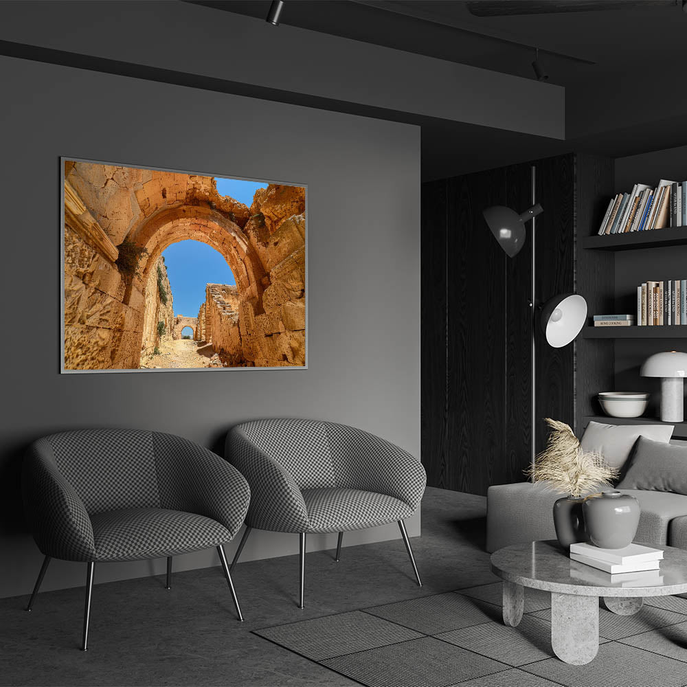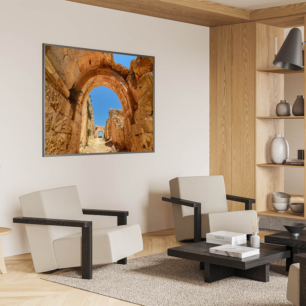 Step back in time with this breathtaking depiction of ancient Ethiopian architecture. This stunning wall art captures the grandeur of historic Ethiopian archways, bathed in the golden glow of sunlight against a clear blue sky. The intricate stonework and weathered textures tell a story of resilience and history, making this piece a perfect choice for anyone passionate about African culture and history.