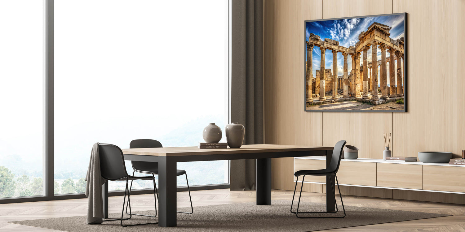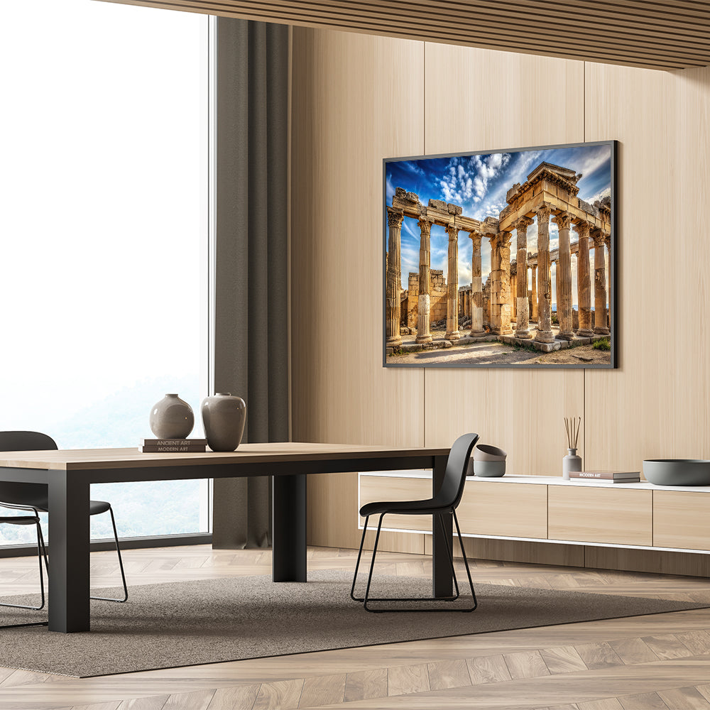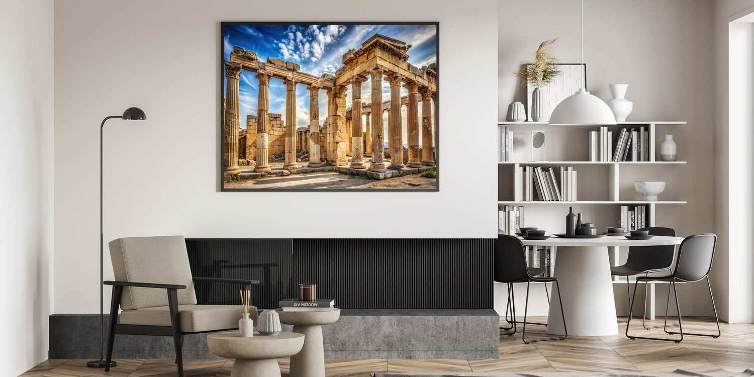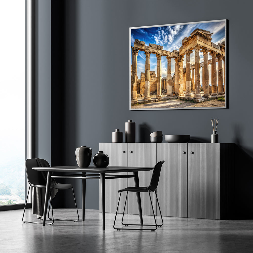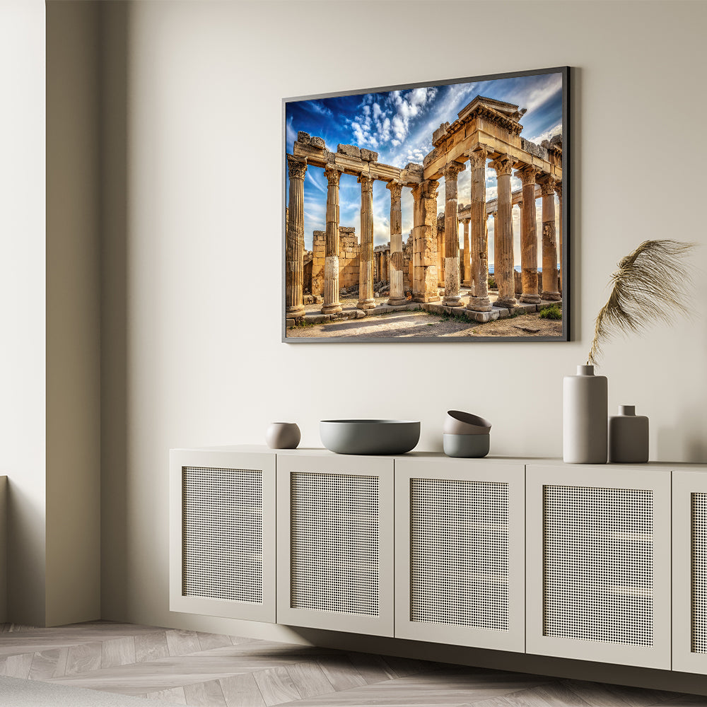 Bring the timeless beauty of antiquity into your space with this "Ancient Ruins Columns Art." This striking artwork captures the grandeur of ancient stone columns set against a dramatic, cloud-filled sky. The warm hues of the stone contrast with the vibrant blues and whites of the sky, creating a powerful visual that evokes a deep sense of history and timelessness. Perfect for lovers of classical architecture, this piece adds a majestic and historical touch to any room.