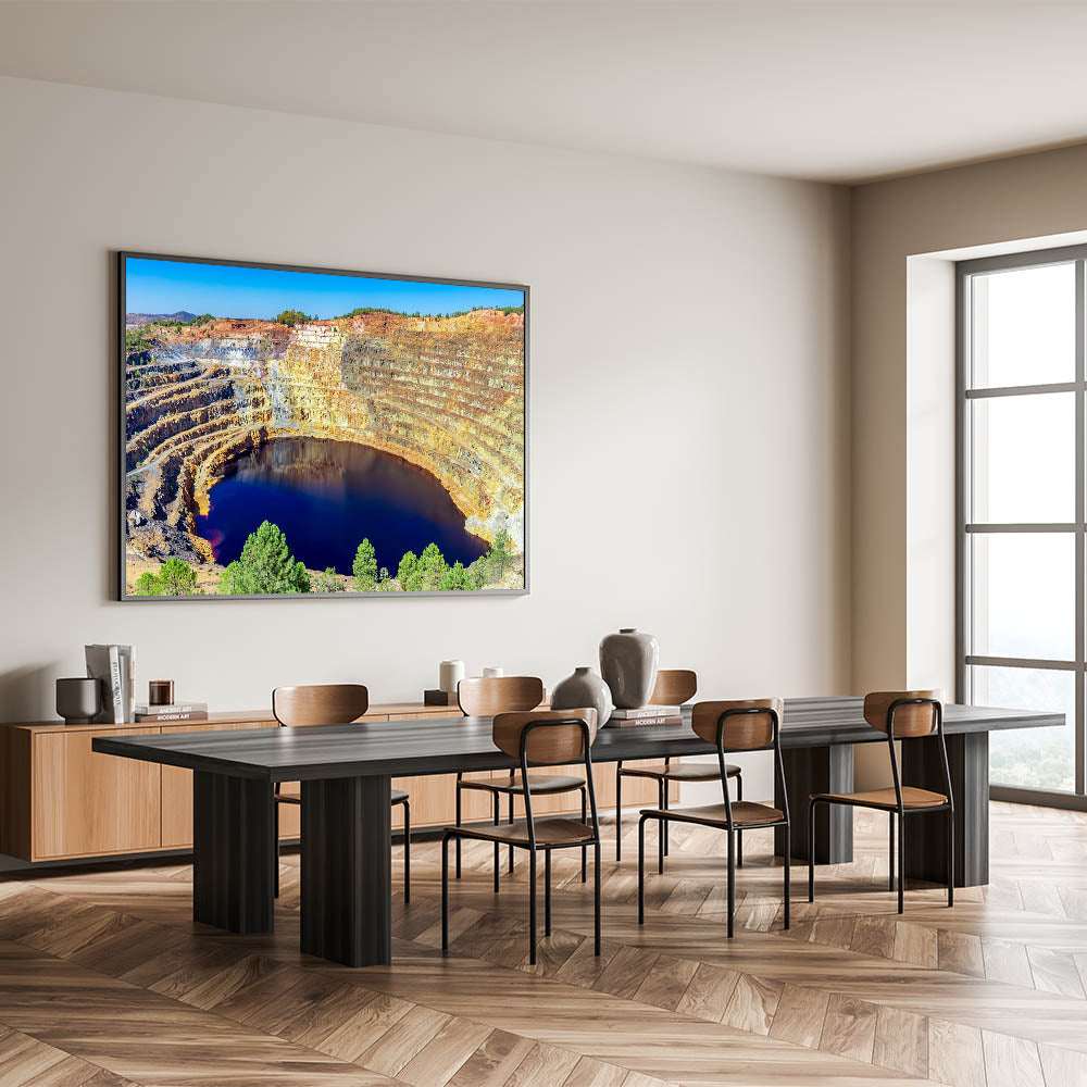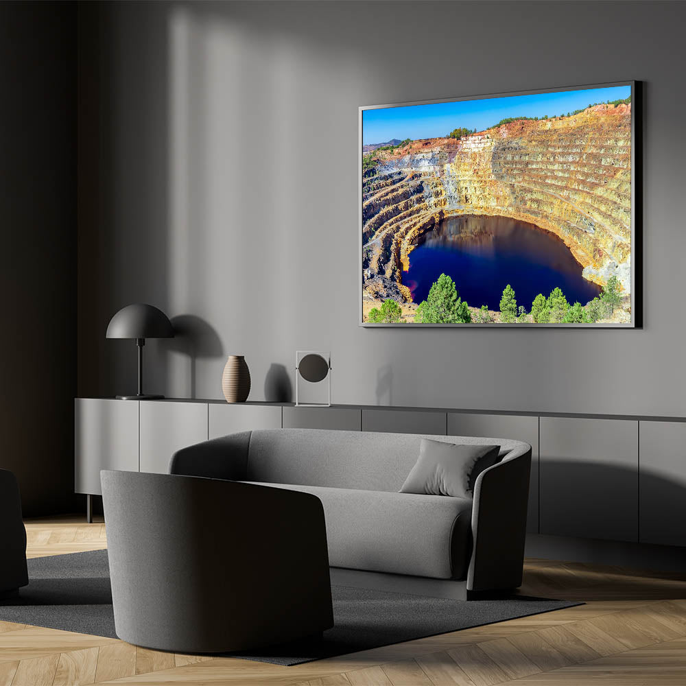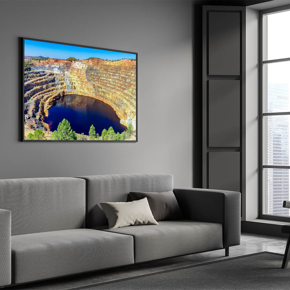 This breathtaking piece of Andalucía landscape art showcases the vibrant and otherworldly Río Tinto Mine crater. Known for its rich mineral deposits and colorful layers of earth, this unique landscape offers a stunning view of geological history. The deep blue water at the base of the crater contrasts with the golden and reddish tones of the surrounding rock, creating a visually striking and dramatic scene that is perfect for nature and geology enthusiasts.