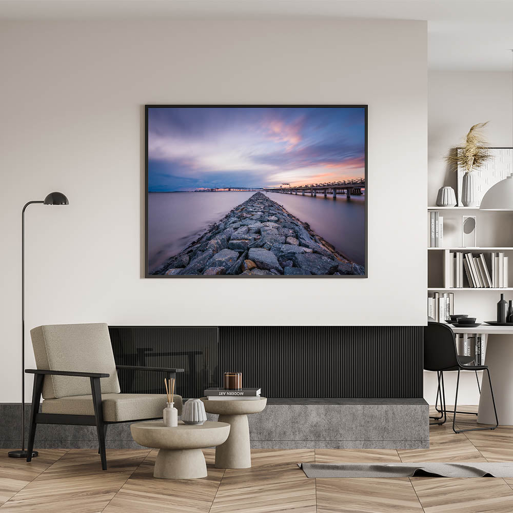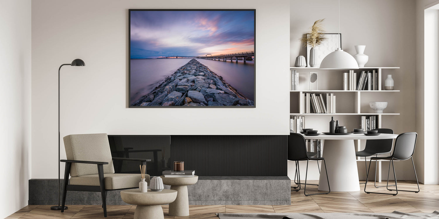 Enhance your space with this high-quality Annapolis wall art, showcasing a serene view of the Chesapeake Bay Bridge during sunset. This captivating piece perfectly captures the calm waters and vibrant sky, making it a beautiful addition to any room. Whether you're a lover of coastal scenery or looking for unique Annapolis artwork, this print is sure to impress.