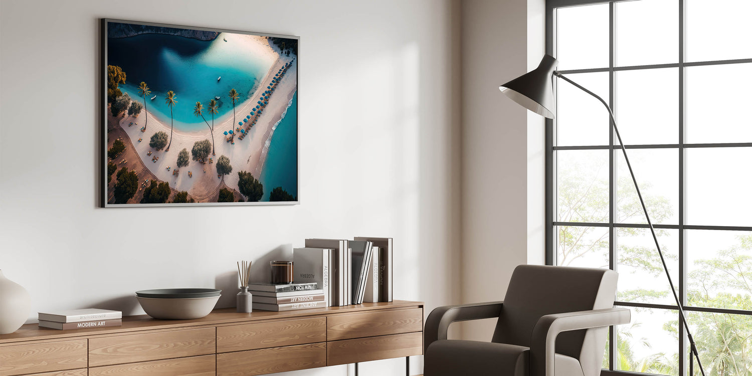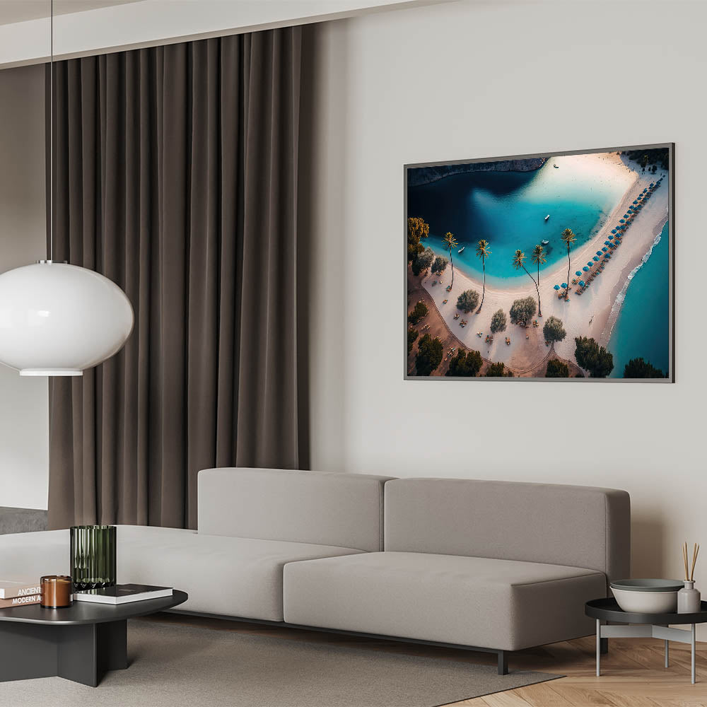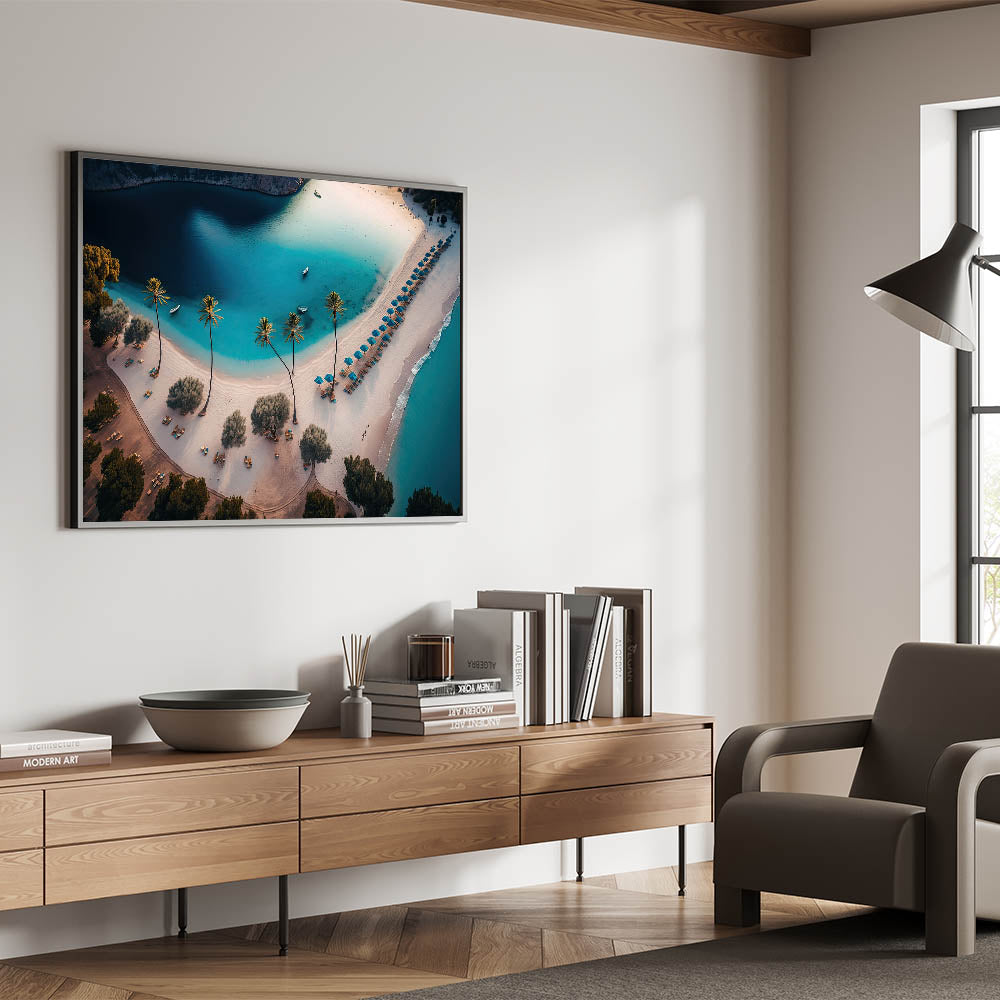 • High-quality print highlighting the vibrant blues and serene beach layout, perfect for coastal-themed interiors.