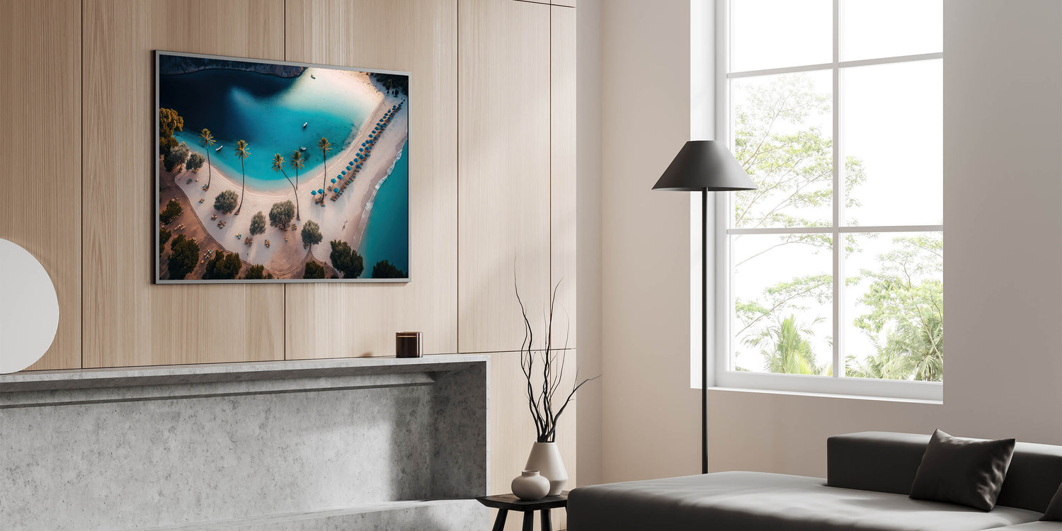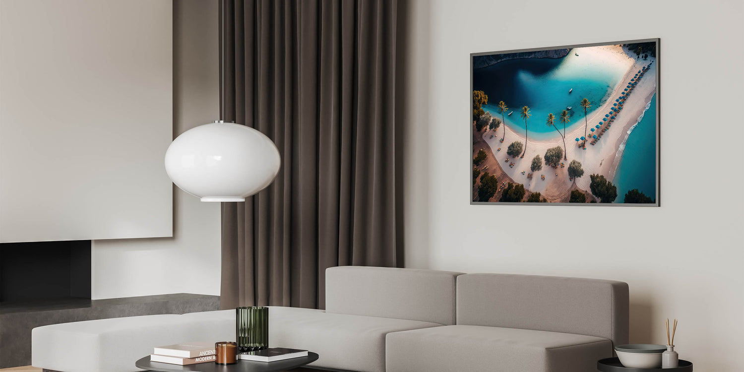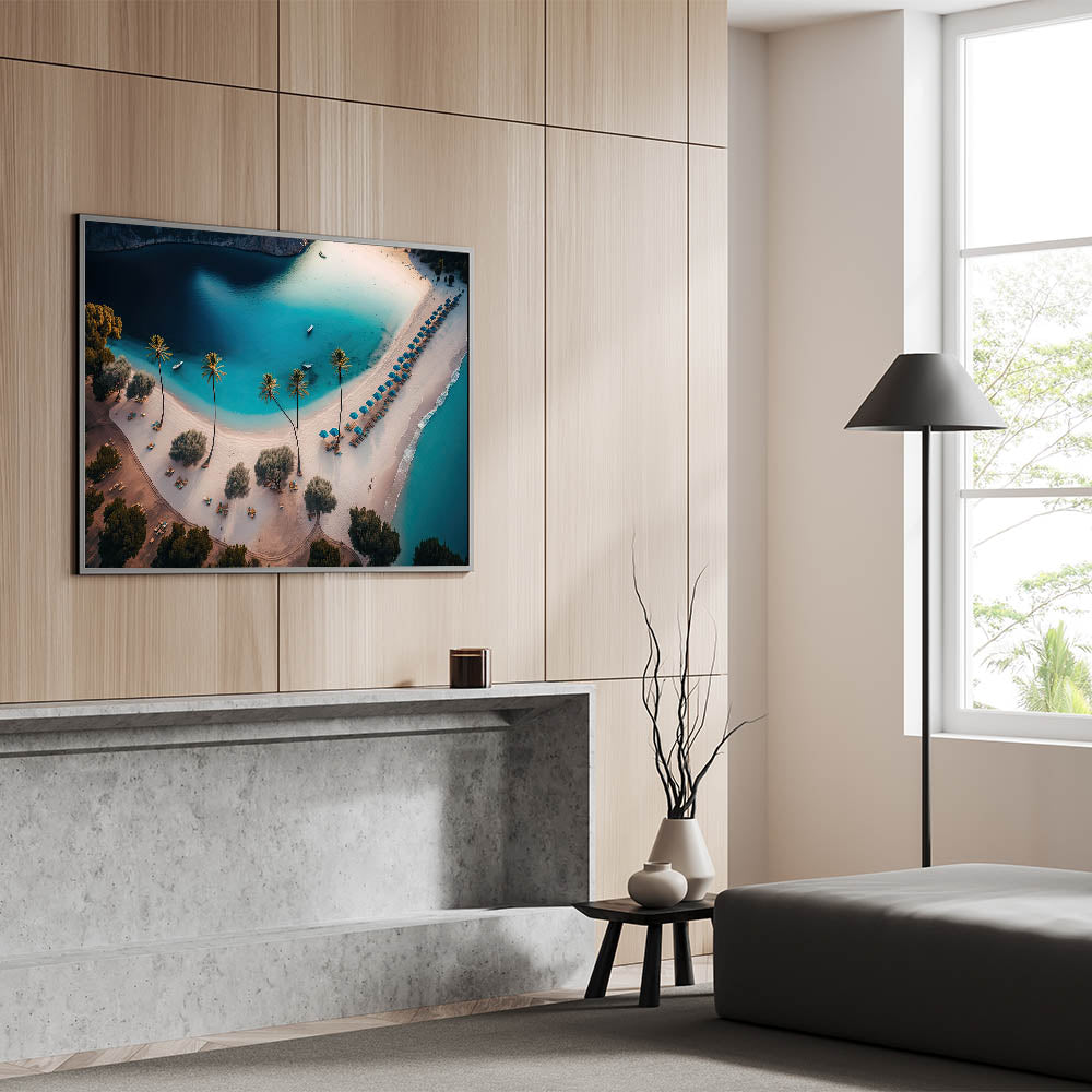 • High-quality print highlighting the vibrant blues and serene beach layout, perfect for coastal-themed interiors.