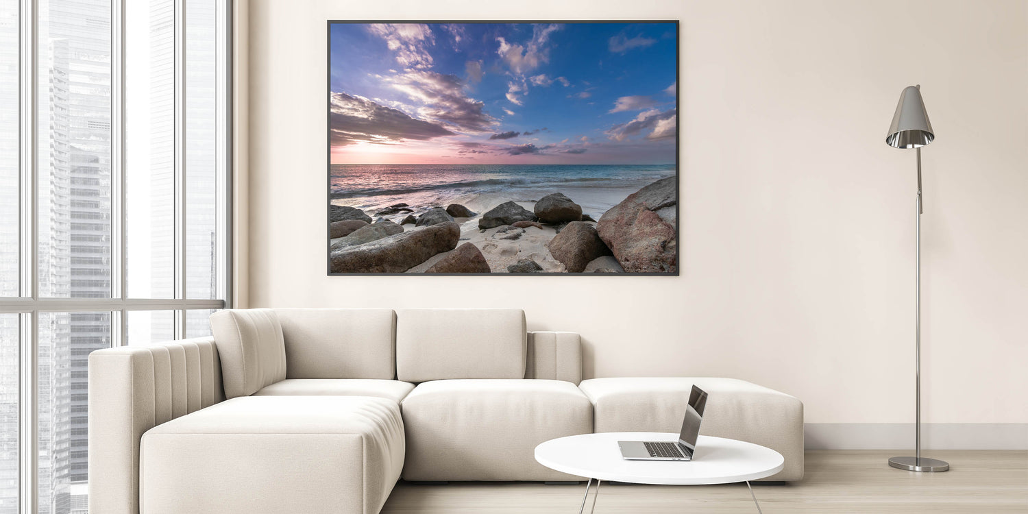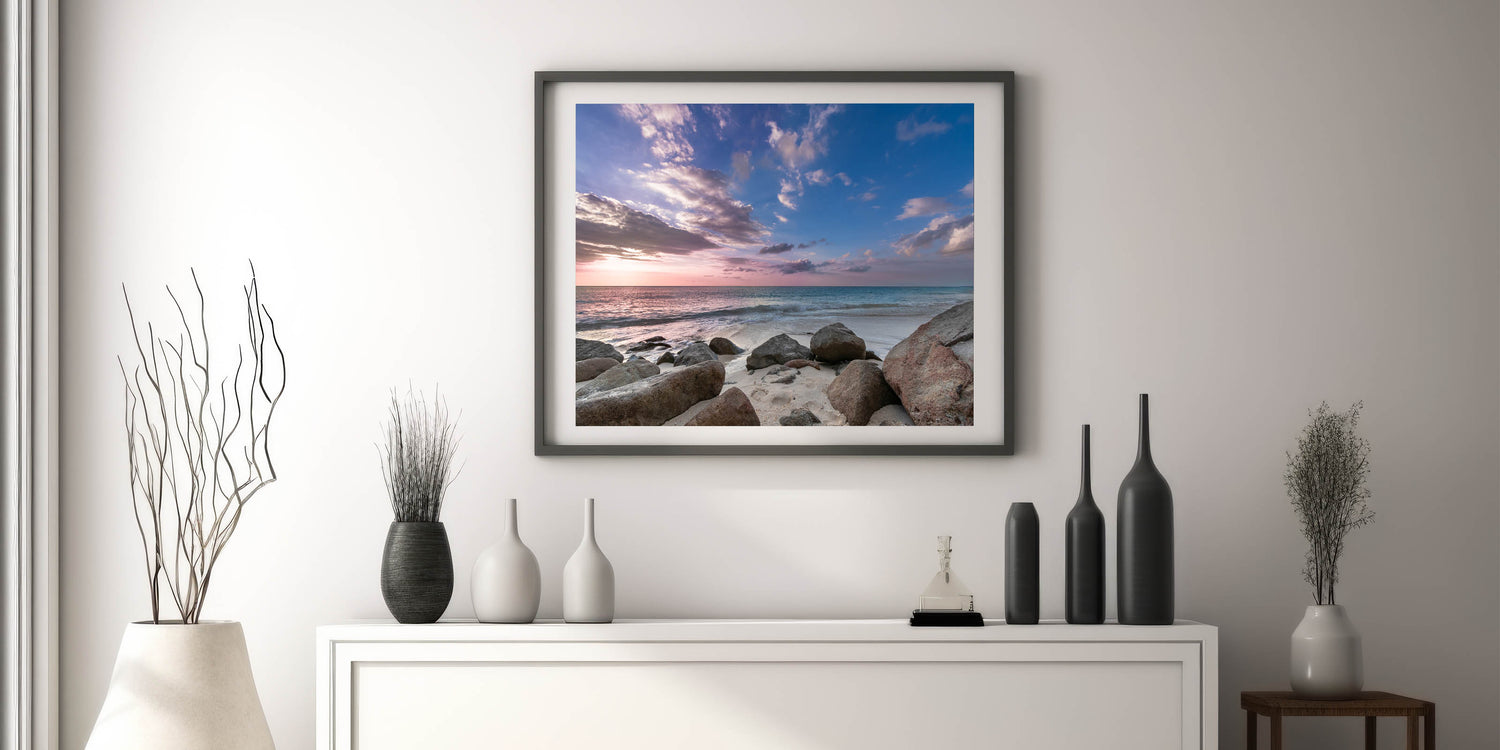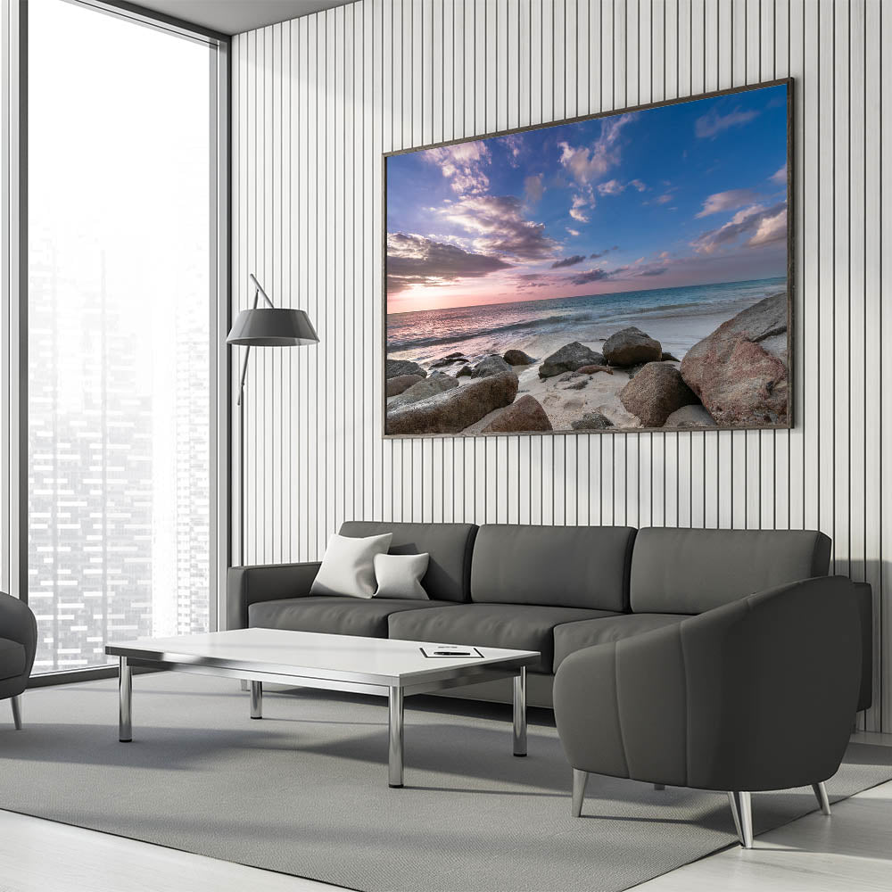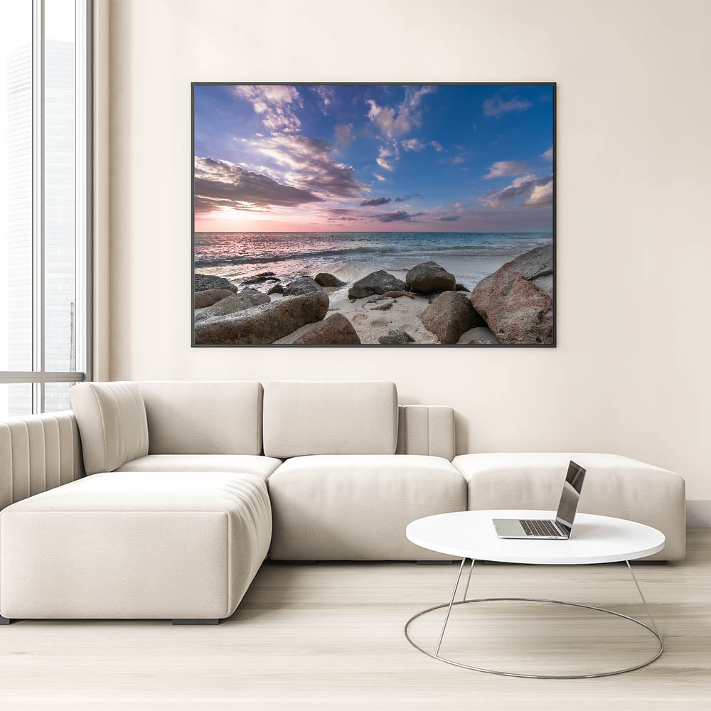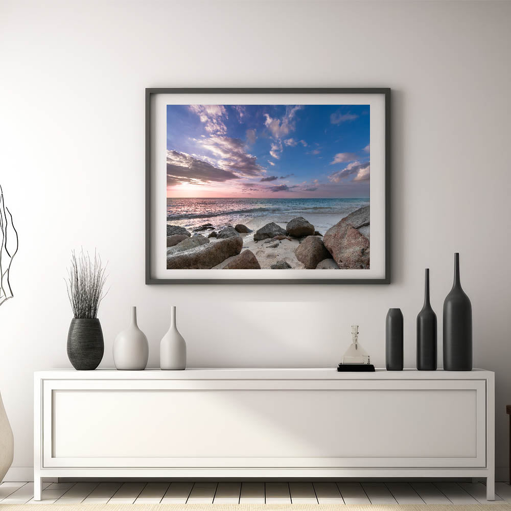 • High-quality print showcasing the beautiful blend of sky colors and the serene, rocky beach setting.