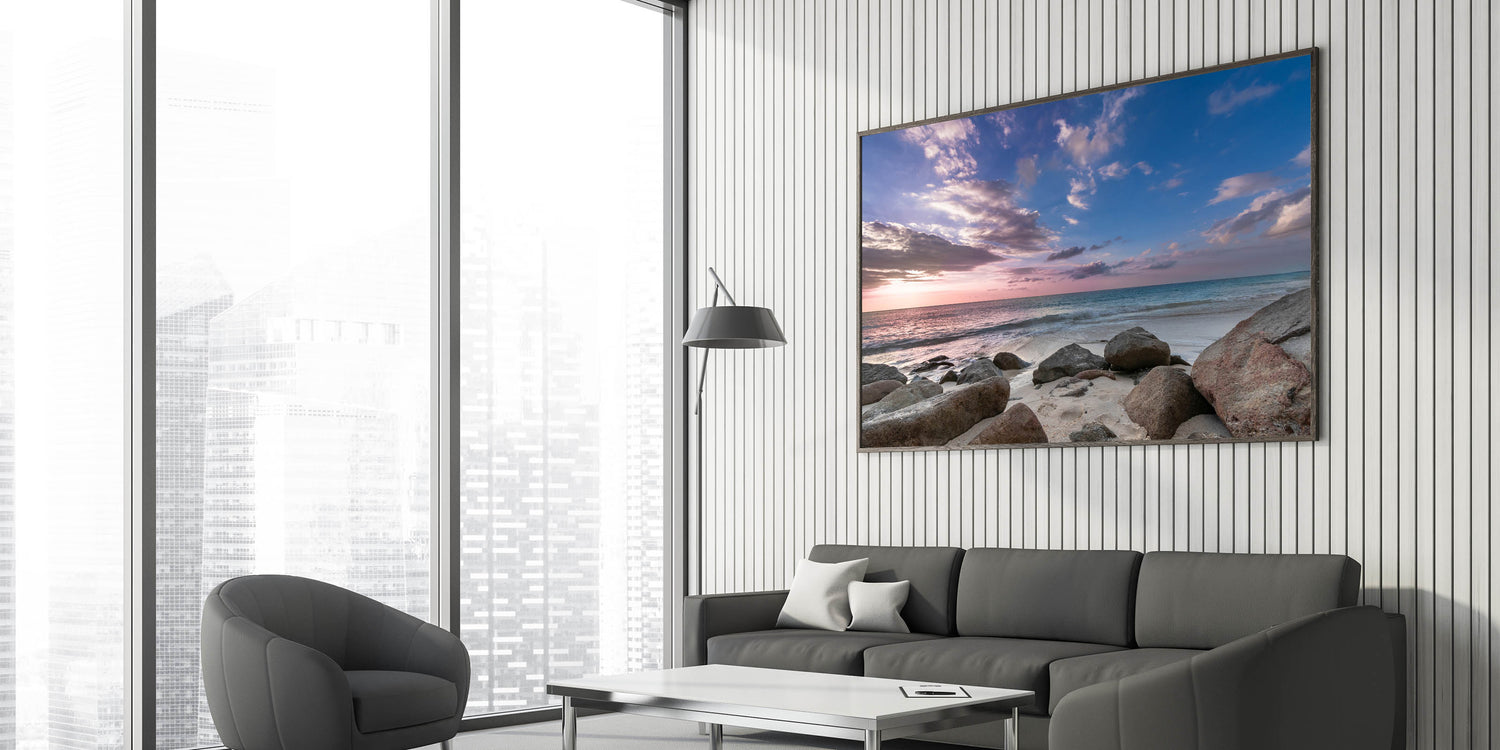 This serene depiction of Antigua’s rocky shores at dusk is perfect for those looking to bring a touch of coastal serenity into their home. Its calming colors and natural textures will enhance any room's decor.