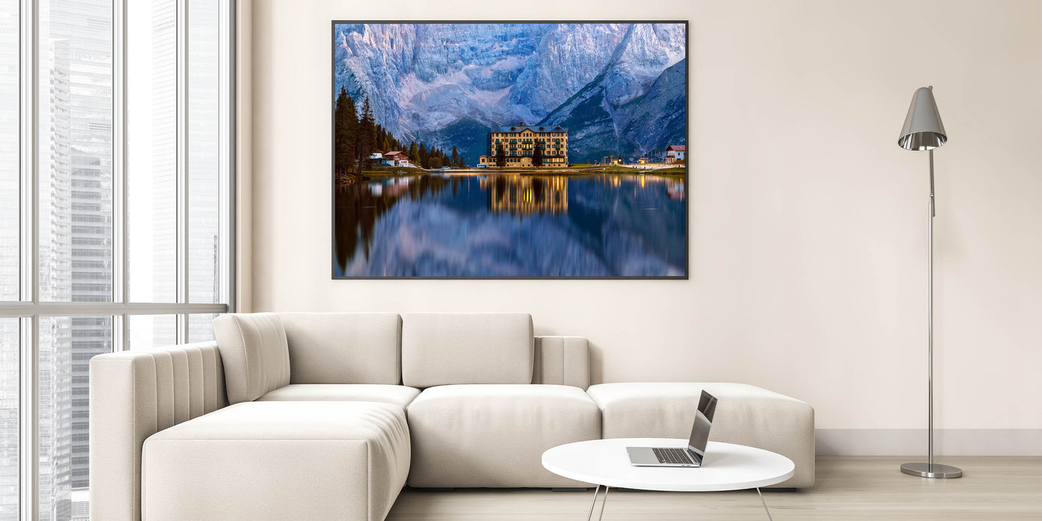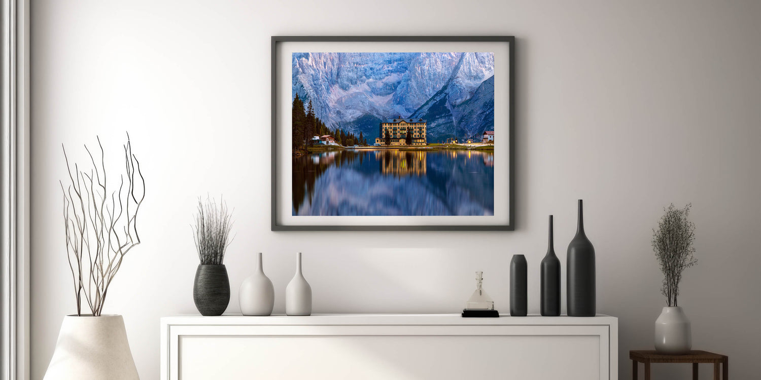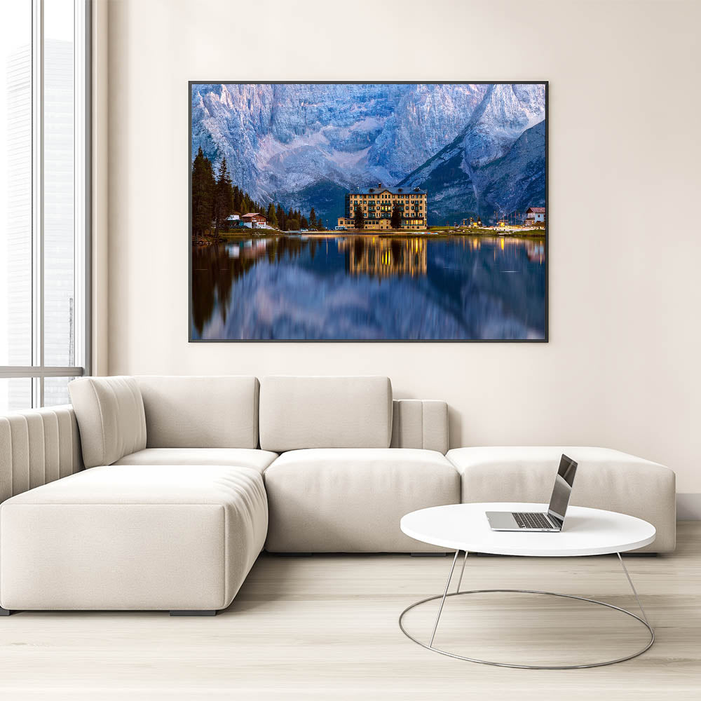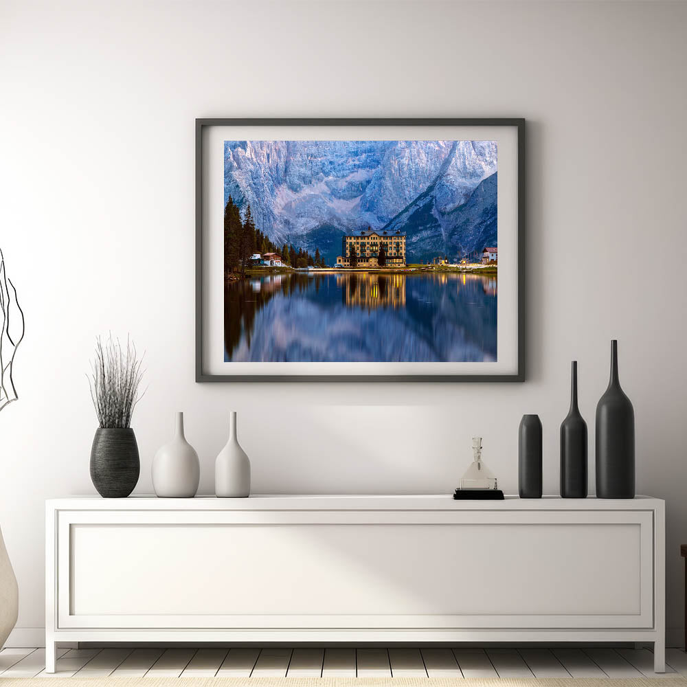 Immerse yourself in the stunning beauty of the Austrian Alps with this breathtaking Austria photography art, featuring a peaceful alpine hotel reflected on the still surface of a serene lake. Surrounded by towering mountains, this Scenic Austria print captures the tranquil atmosphere of the Austrian landscape, making it a perfect addition to any home or office space. The calm water and majestic mountain range create a visually striking and calming centerpiece for your decor.