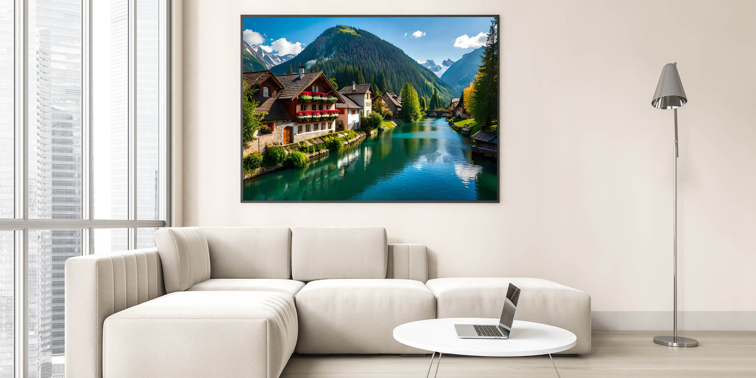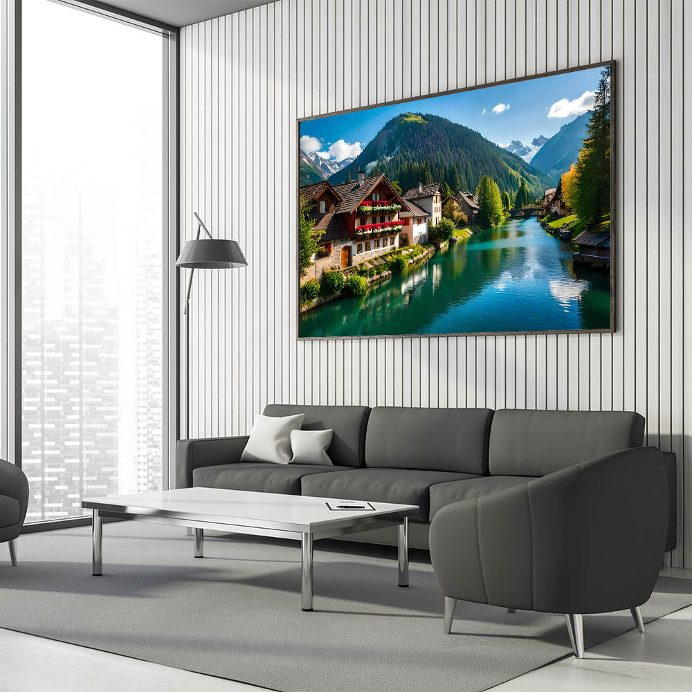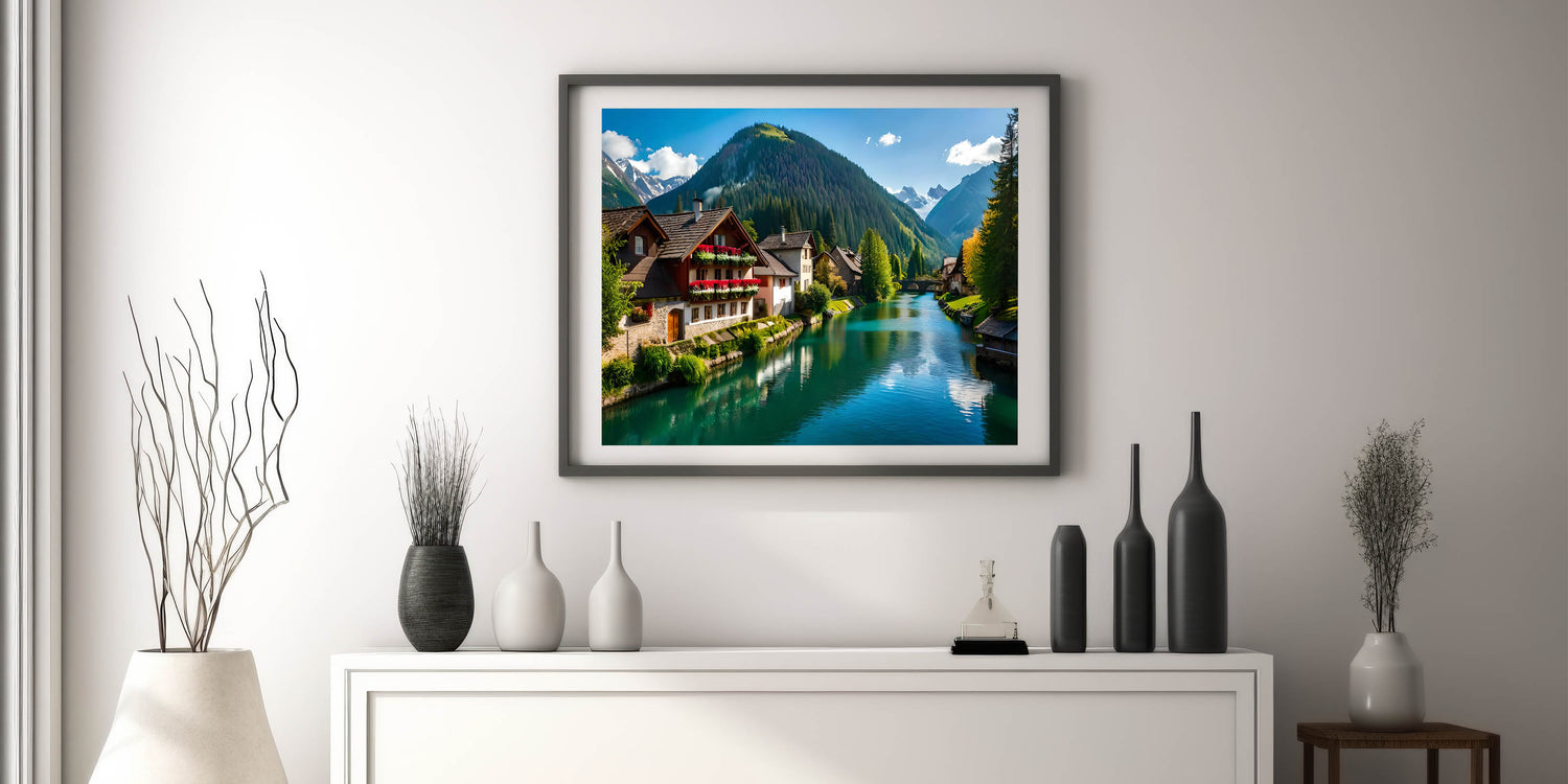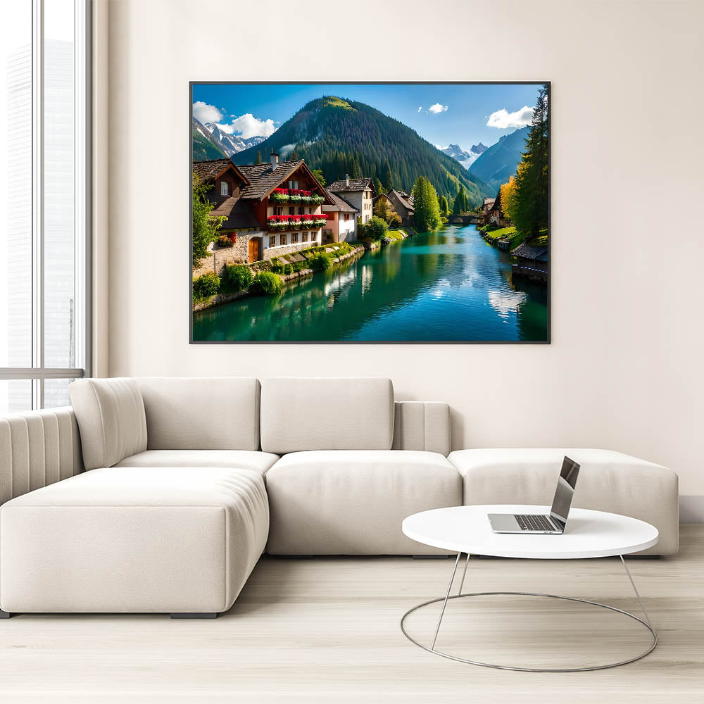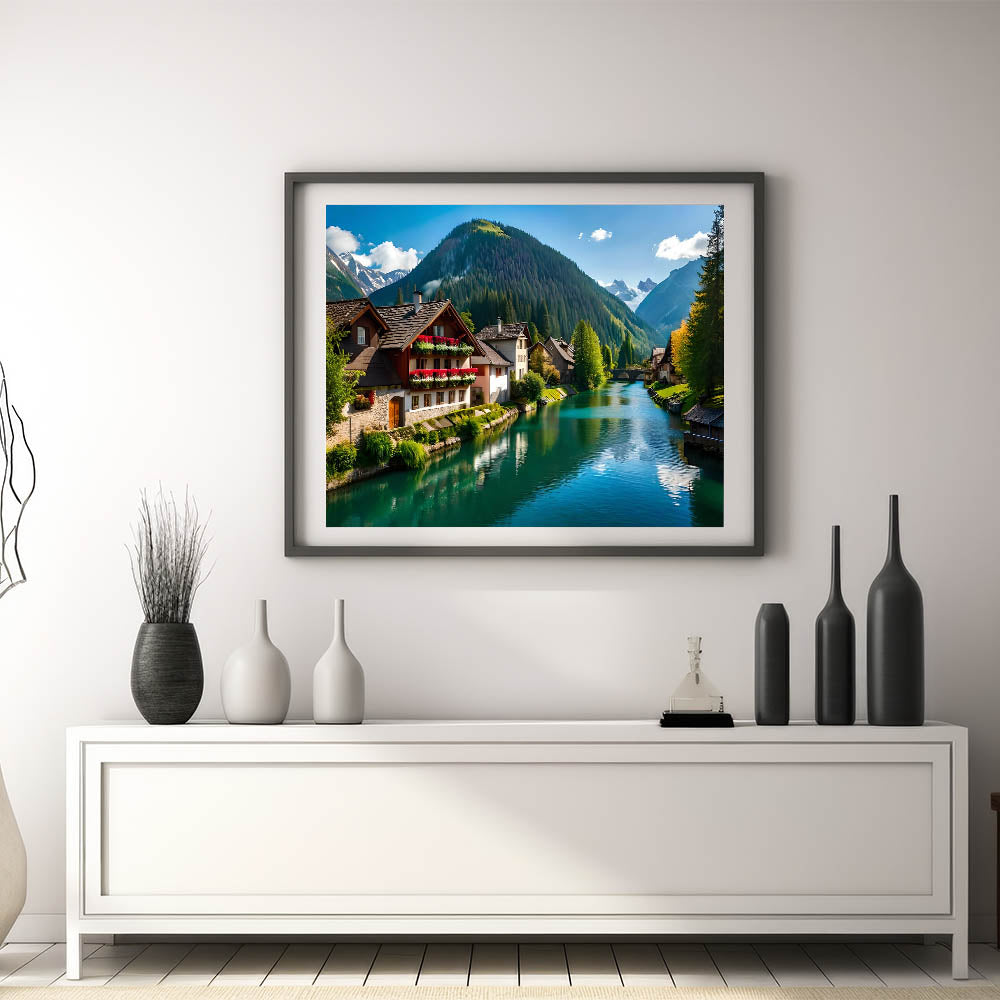 Capture the tranquil beauty of Austria's alpine landscapes with this stunning wall art featuring a serene village by a river, framed by majestic mountains. This artwork showcases the natural beauty and peaceful atmosphere of Austrian countryside life, with charming homes, vibrant flowers, and crystal-clear waters. It’s the perfect piece for anyone who appreciates scenic Austria travel art prints and the calming essence of nature.