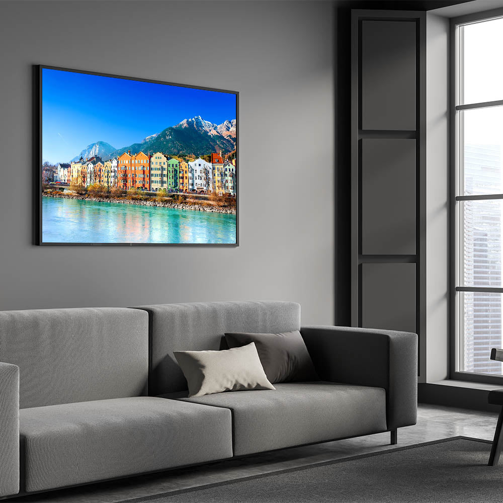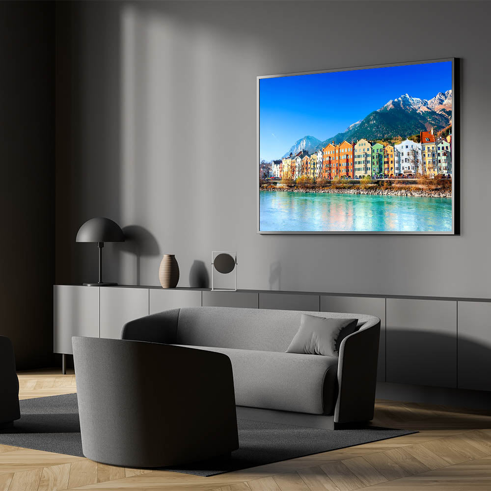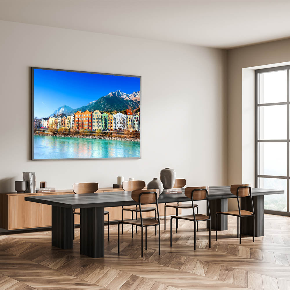 Bring the charm of Austria into your home with this breathtaking Austria wall art showcasing the colorful houses of Innsbruck against the majestic backdrop of the Austrian Alps. This captivating piece of Austrian landscape art highlights the harmony between the vibrant city architecture and the surrounding natural beauty.