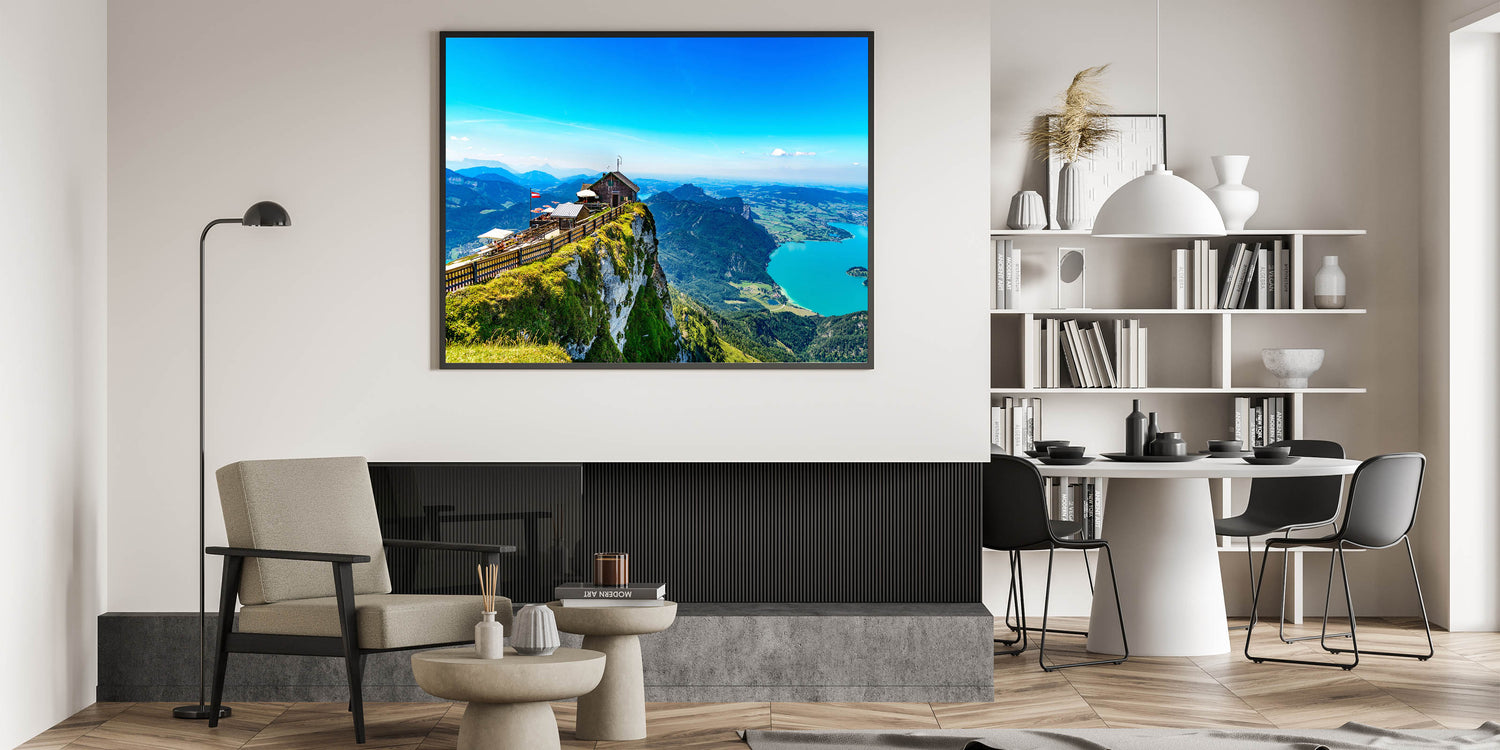 Whether you are looking to add a statement piece to your living room, office, or bedroom, this Austria wall art will transform your space into a scenic Austrian retreat. The rich blues of the sky and lake, combined with the greenery of the mountains, evoke feelings of calm and inspiration.