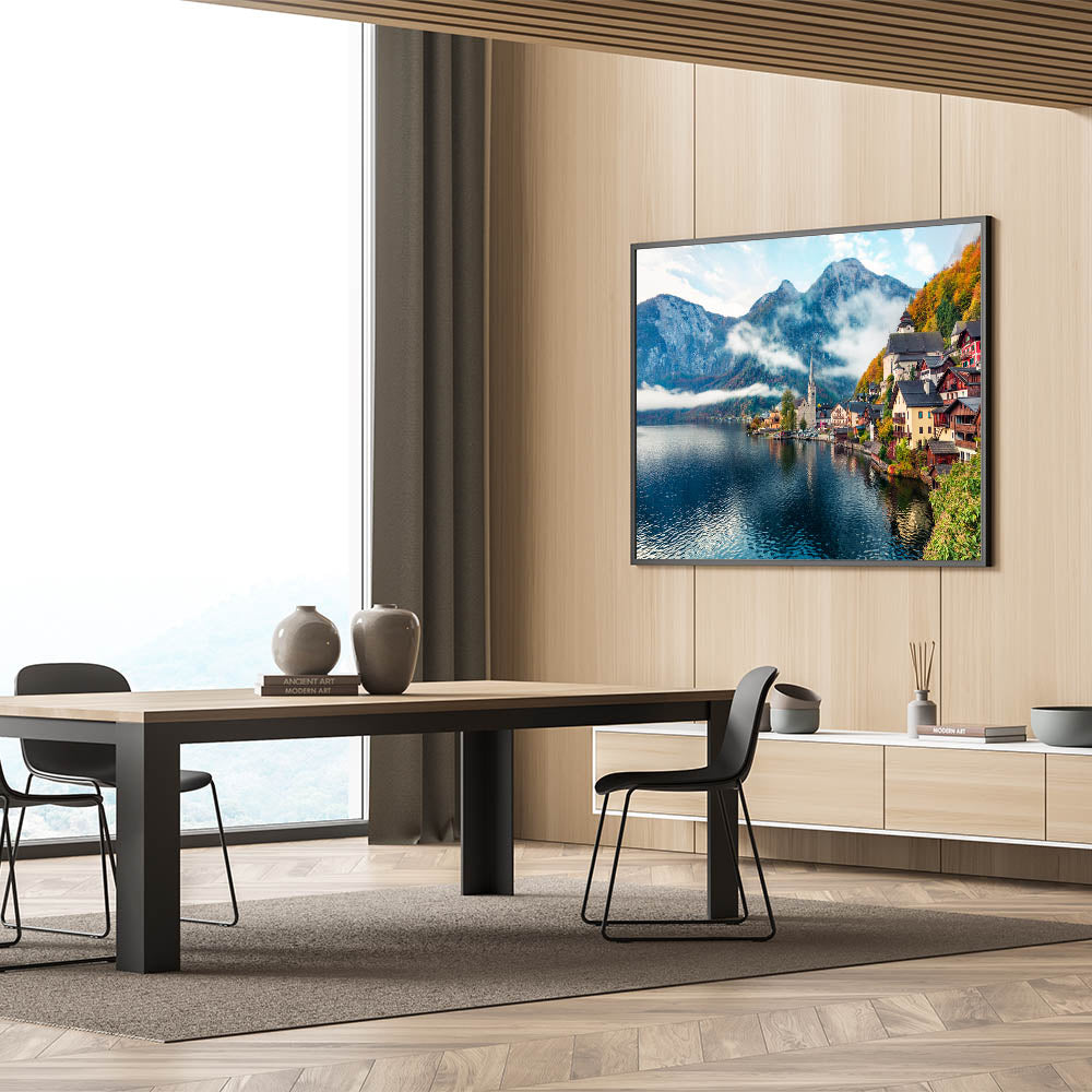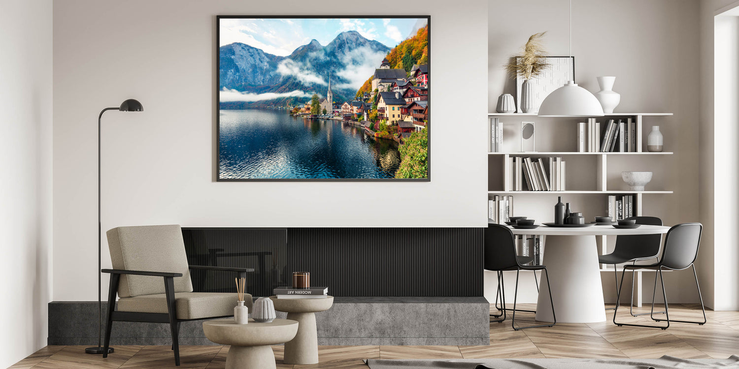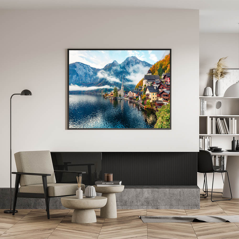 Transform your space with this breathtaking Austrian landscape art showcasing the enchanting village of Hallstatt. Nestled between a serene lake and the towering Austrian Alps, this Scenic Austria print captures the tranquil beauty of one of Austria’s most iconic locations. The mist rising from the water and the autumn hues of the surrounding trees bring a magical, peaceful atmosphere into any home or office.