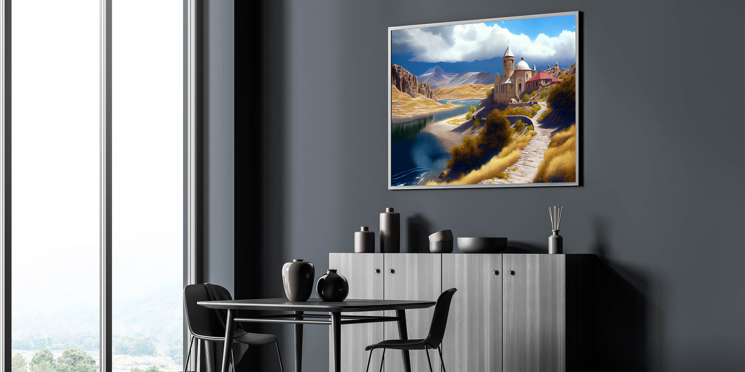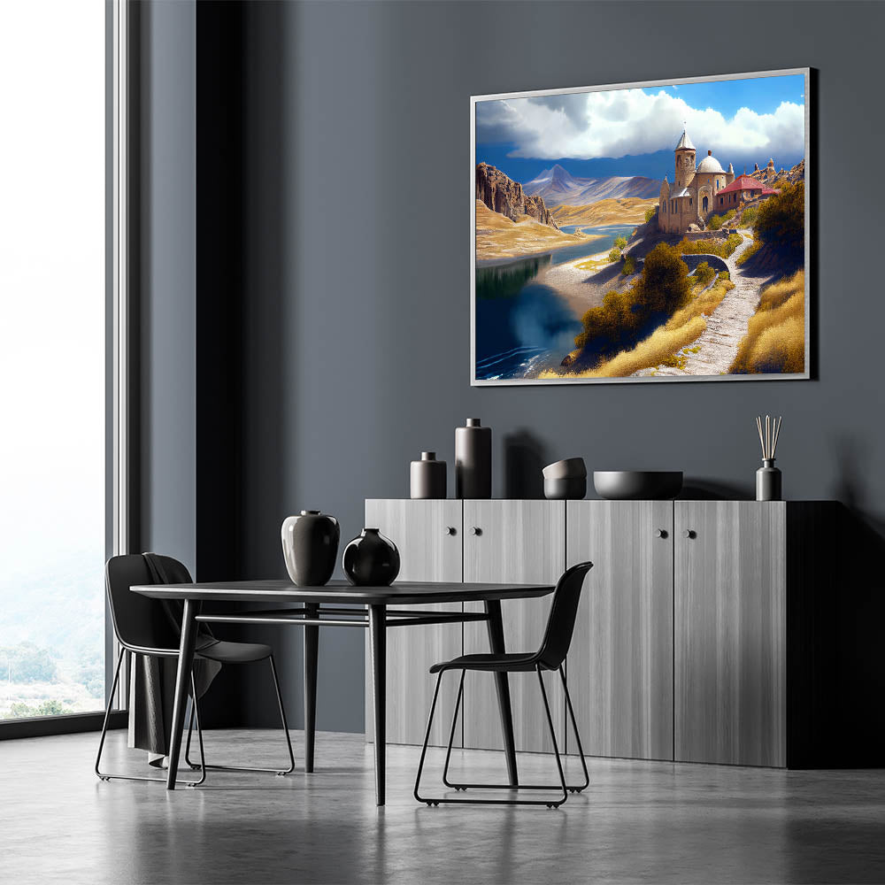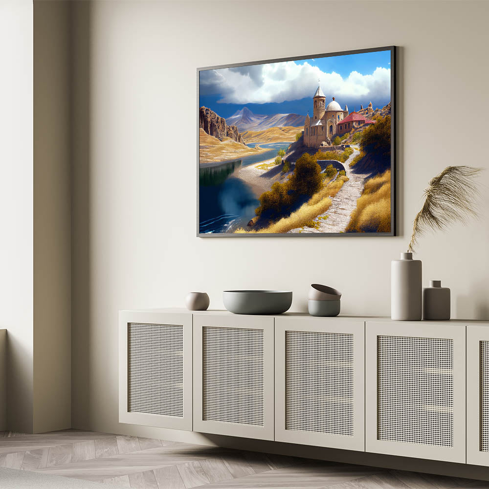 Discover the tranquil beauty of Azerbaijan with this breathtaking wall art featuring a picturesque mountain church set against a serene lakeside backdrop. The winding path leading to the church invites the viewer to explore the peaceful surroundings, where the golden tones of the landscape blend harmoniously with the deep blue waters of the lake. The distant mountains, shrouded in mist, add a sense of depth and majesty to the scene, creating a truly captivating piece of art.