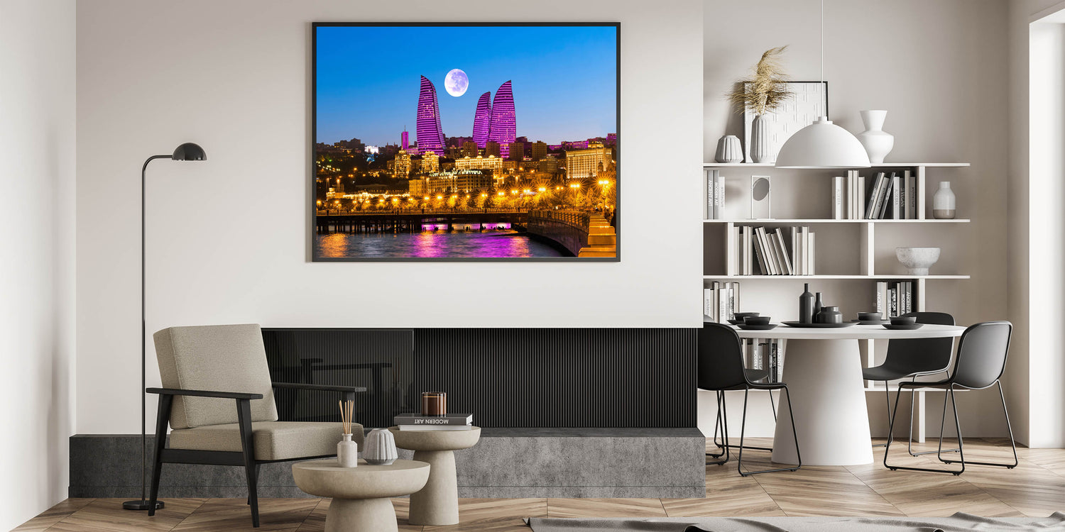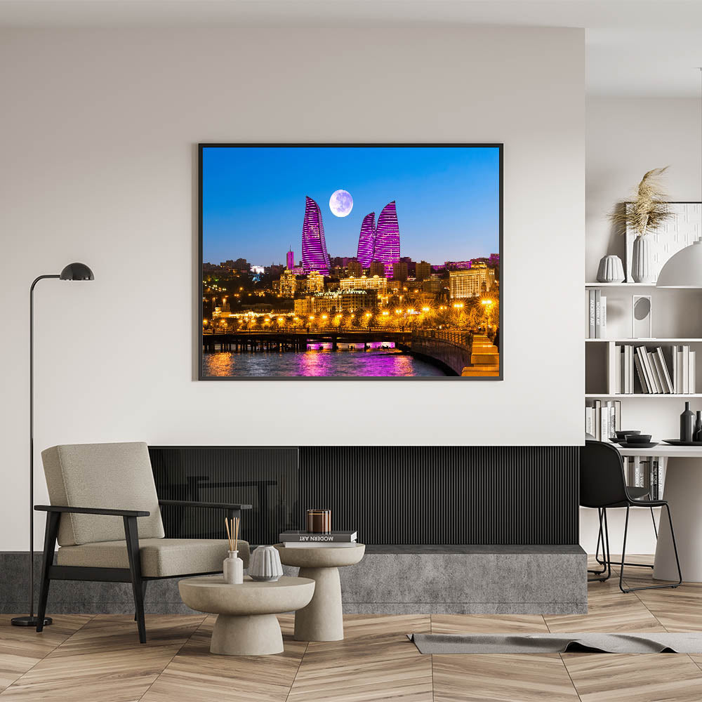 Illuminate your space with the vibrant energy of Baku’s iconic Flame Towers, captured in this stunning wall art. Set against the backdrop of a clear night sky, the towers glow with a striking purple hue, beautifully contrasted by the soft light of a full moon. The reflection of city lights on the water below adds an extra layer of depth and dimension, making this piece a captivating focal point for any room. This artwork embodies the modern elegance and dynamic spirit of Azerbaijan's capital, making it a perfect addition to contemporary decor.