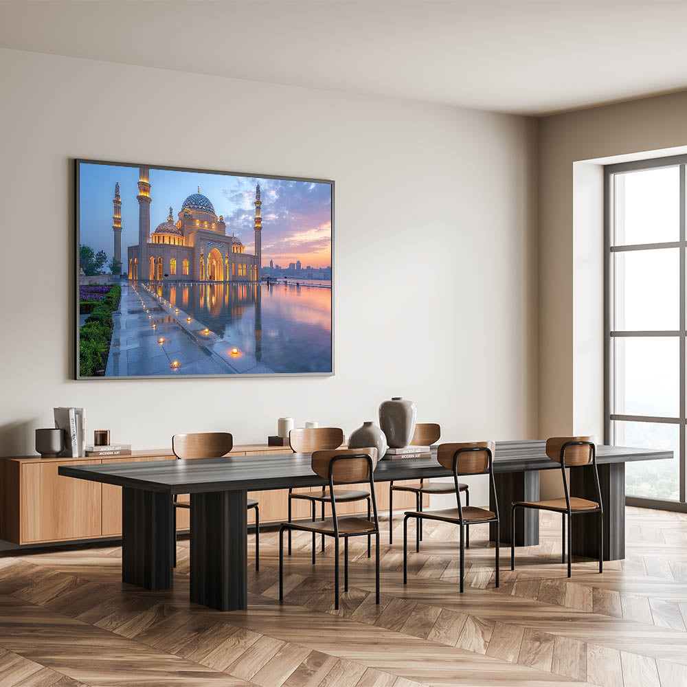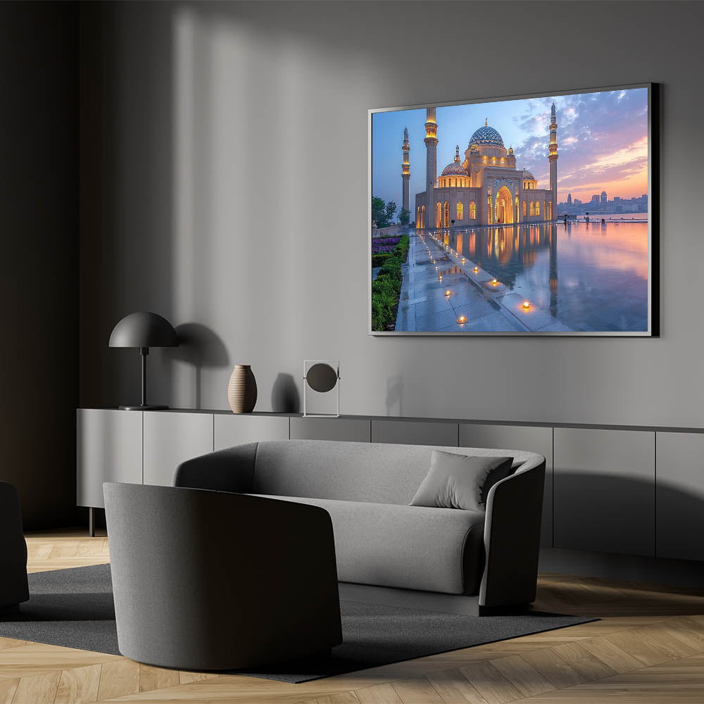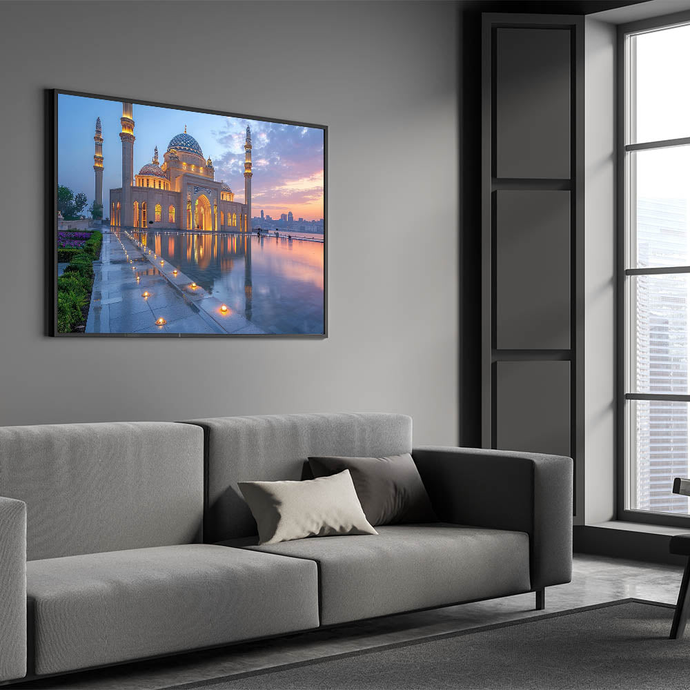 Capture the serene beauty of Baku at dusk with this exquisite wall art, featuring the mesmerizing reflection of a grand mosque against the soft colors of a setting sun. The delicate interplay of light and shadows, combined with the intricate architectural details, creates a scene of profound tranquility and spiritual elegance. The perfectly still waters of the reflecting pool enhance the symmetry and add a magical quality to the artwork, making it a captivating addition to any space.