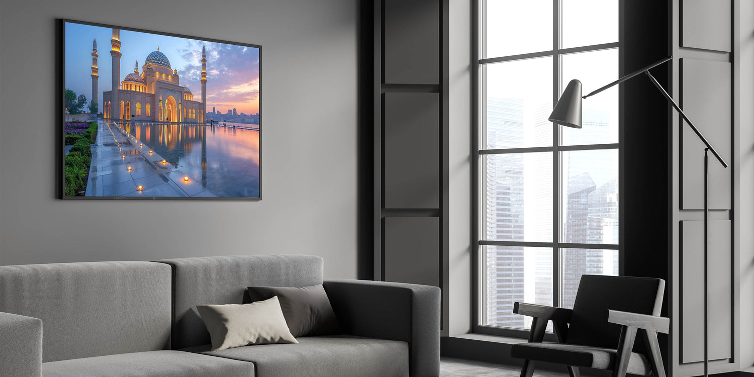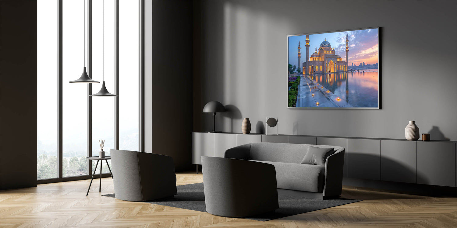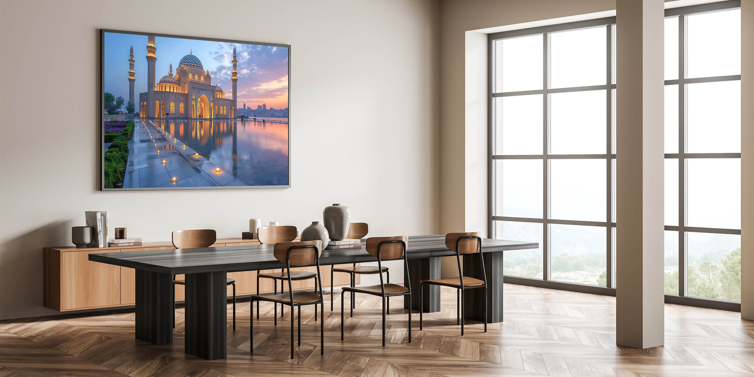 Capture the serene beauty of Baku at dusk with this exquisite wall art, featuring the mesmerizing reflection of a grand mosque against the soft colors of a setting sun. The delicate interplay of light and shadows, combined with the intricate architectural details, creates a scene of profound tranquility and spiritual elegance. The perfectly still waters of the reflecting pool enhance the symmetry and add a magical quality to the artwork, making it a captivating addition to any space.
