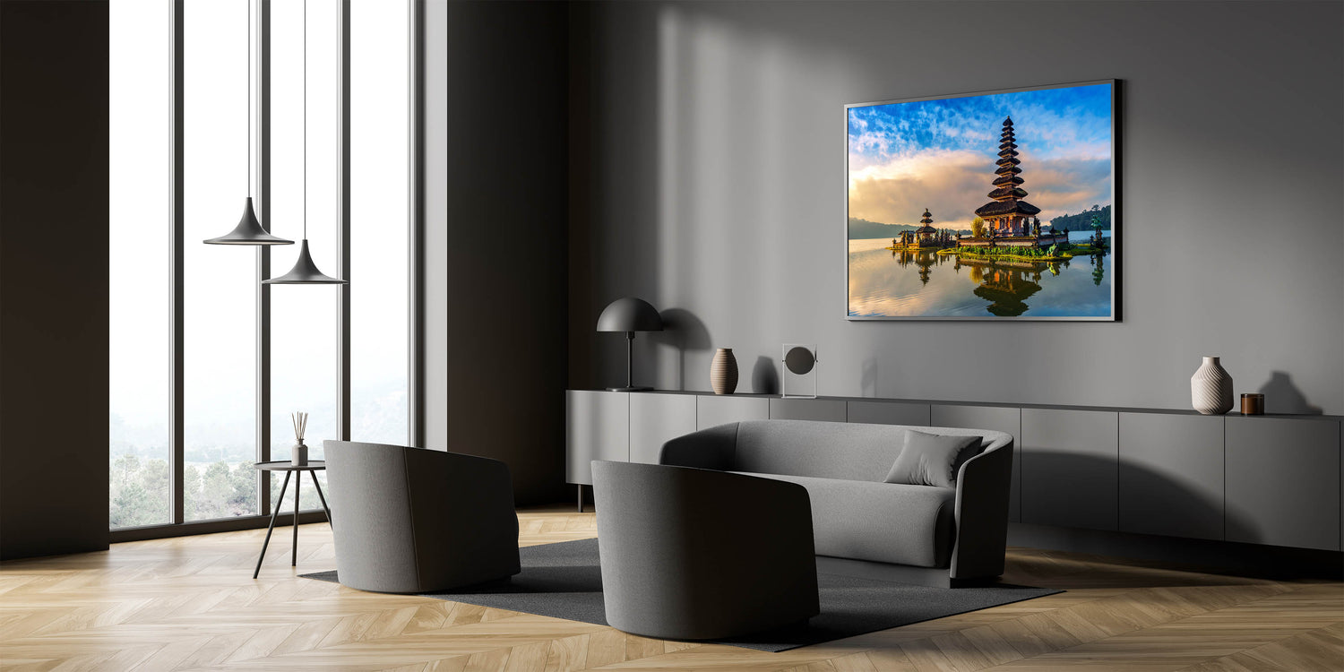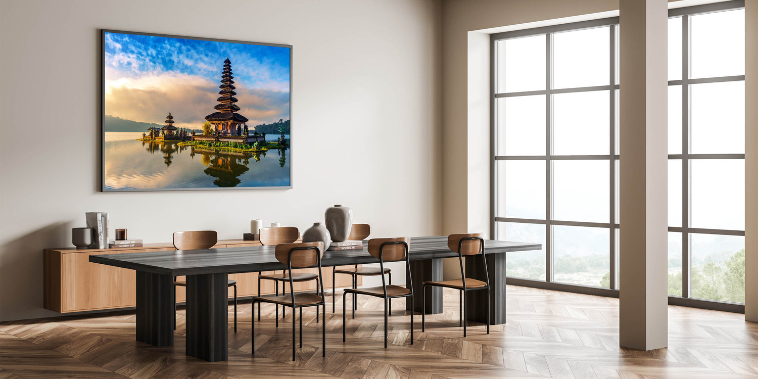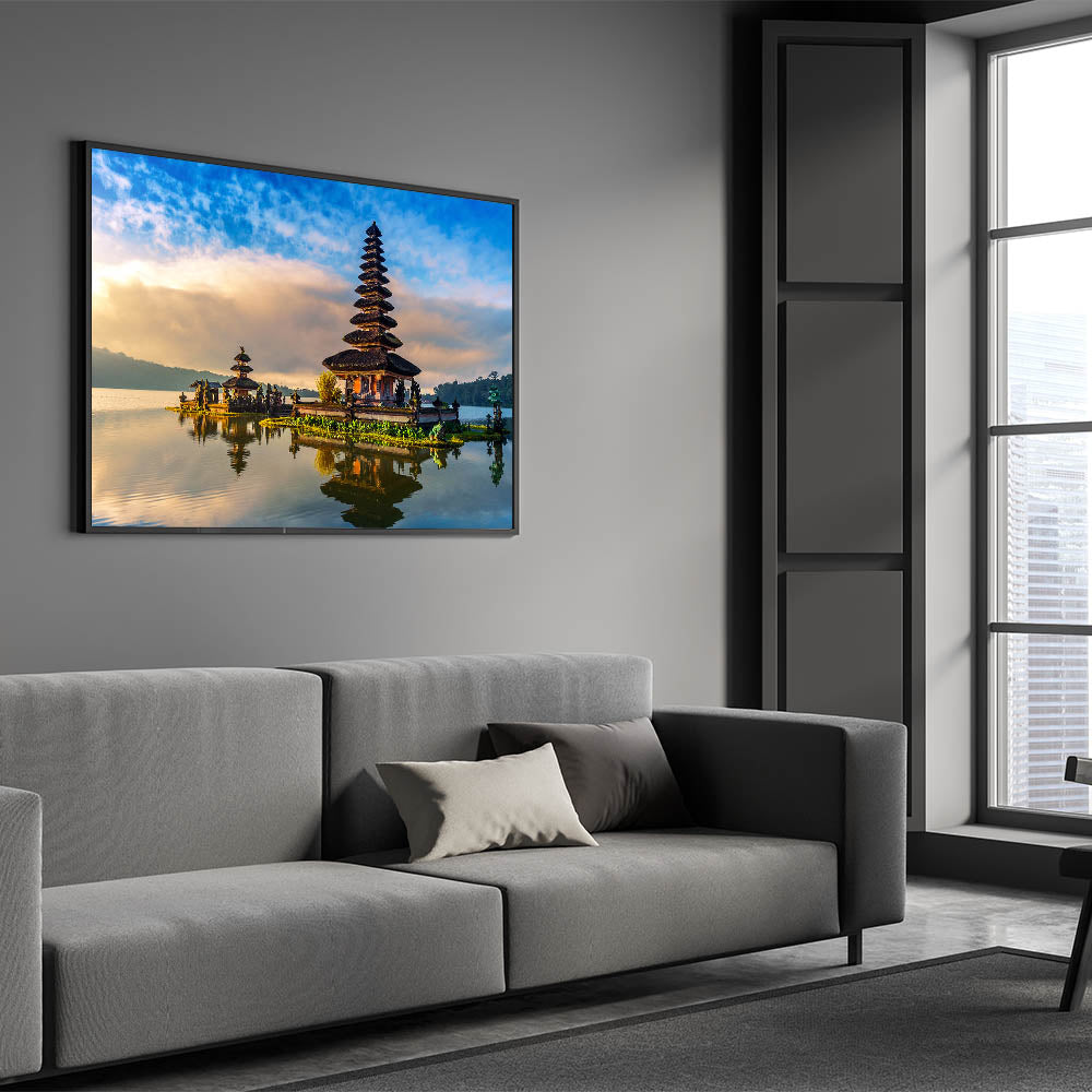 Step into the serene world of Bali with this stunning wall art, featuring a traditional Balinese temple beautifully reflected on calm waters. This captivating scene combines the peaceful atmosphere of a quiet morning with the rich cultural heritage of Bali. The vibrant sky, coupled with the temple’s intricate architecture, creates a breathtaking composition that brings a sense of tranquility and cultural elegance to any space.