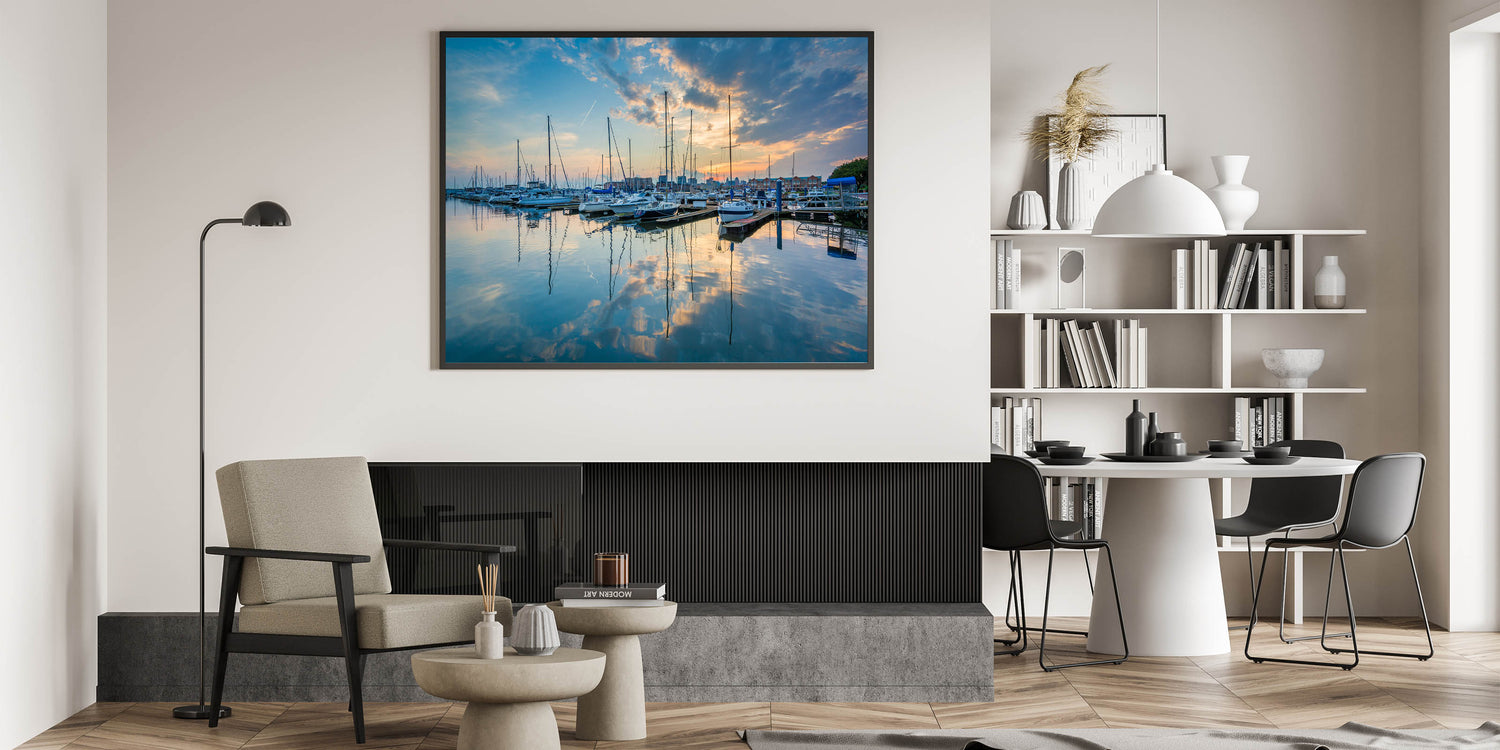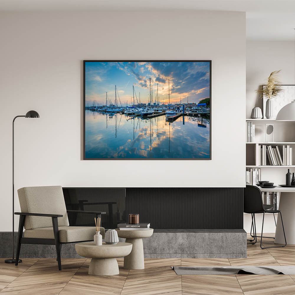 Bring the serene beauty of Baltimore’s waterfront into your space with this stunning Baltimore Harbor Canvas from our Baltimore Wall Art Collection. Featuring peaceful sailboats gently docked at sunrise, this Baltimore Scenic Print captures the calm, reflective waters and the vibrant colors of the sky as the city awakens. Perfect for those who love the tranquil charm of the harbor, this piece will add a soothing atmosphere to any room.