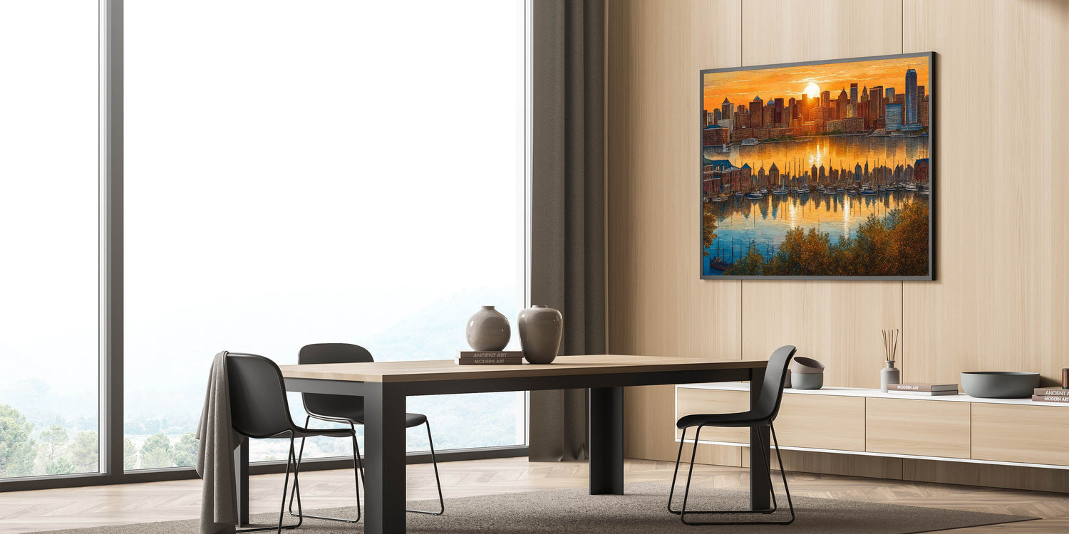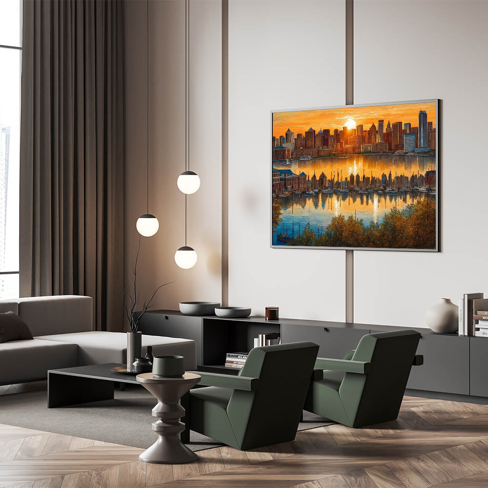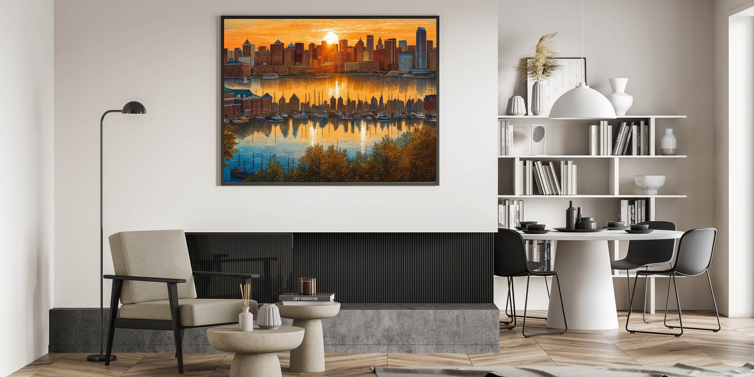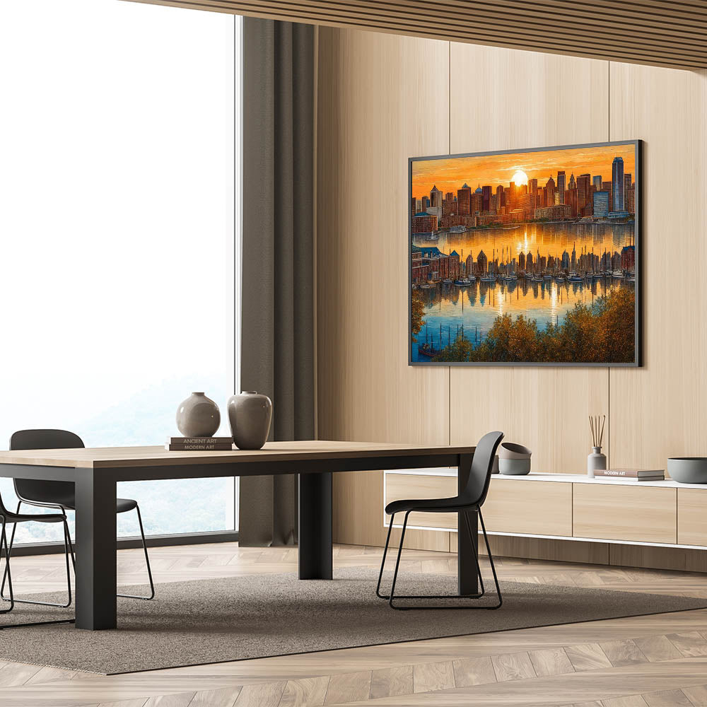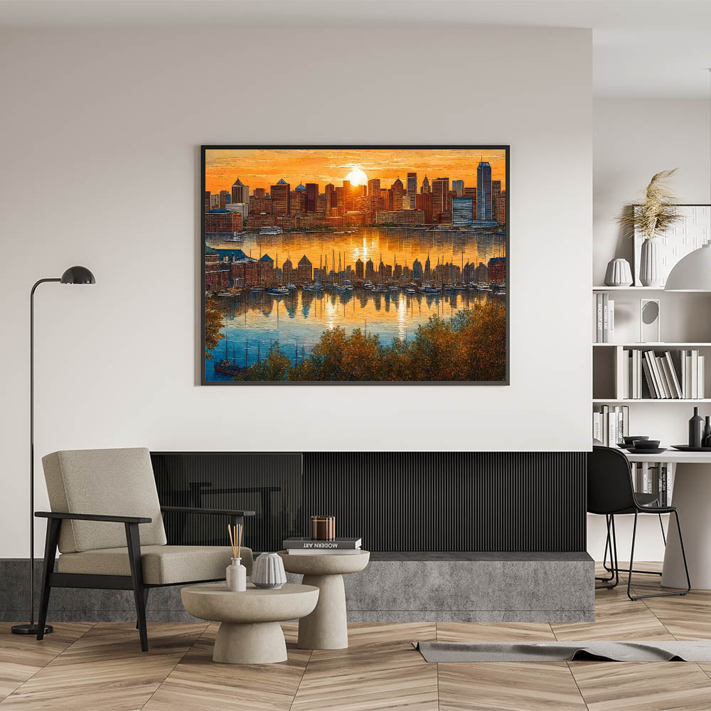 This Baltimore skyline decor is ideal for those looking to bring a piece of the city's charm into their space. The sunset tones and detailed reflections create a captivating focal point, making it a standout addition to any room.