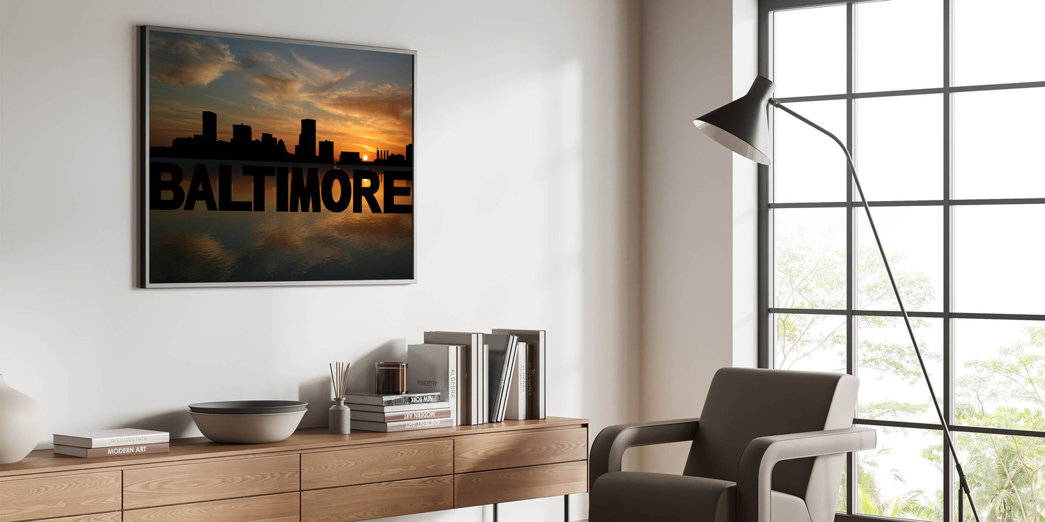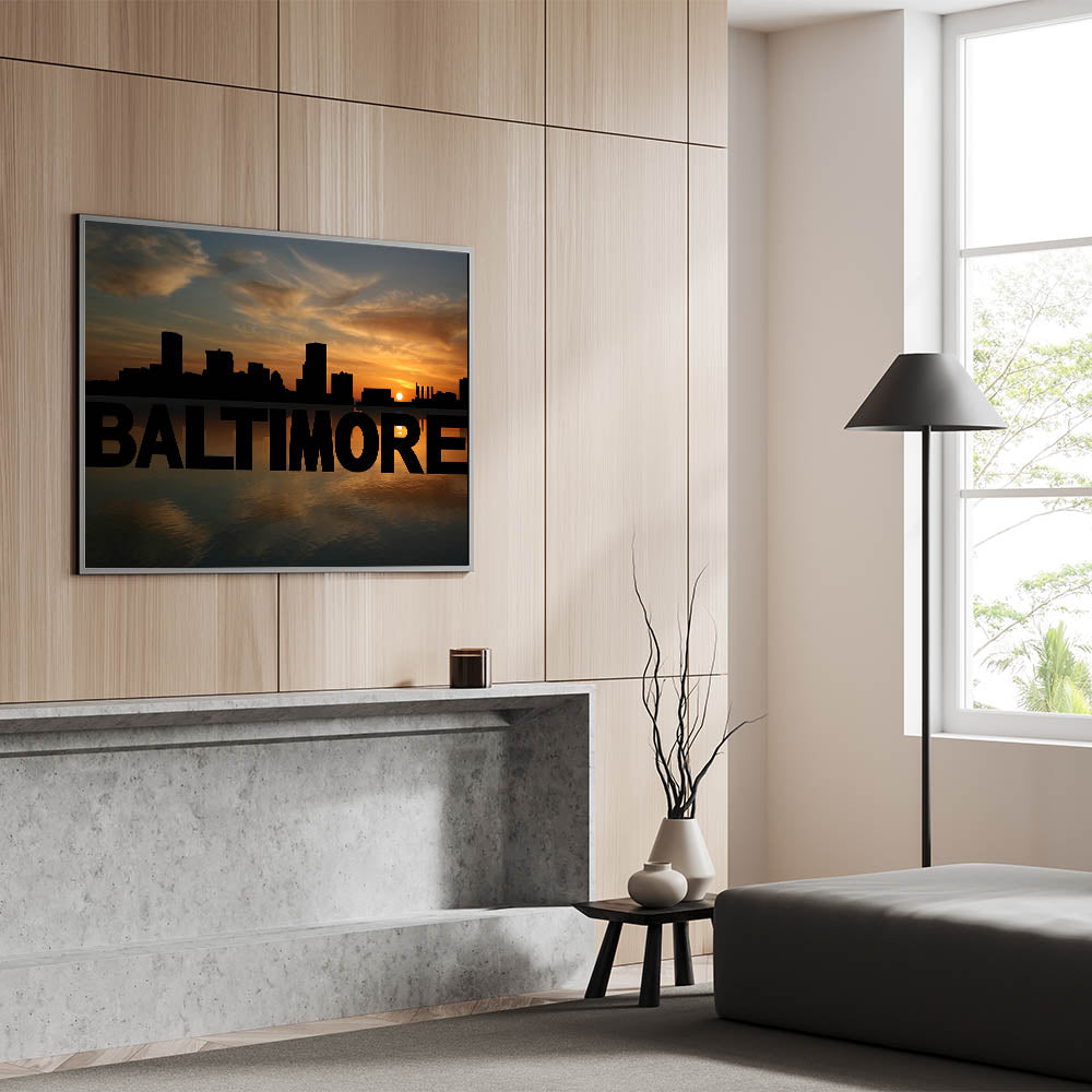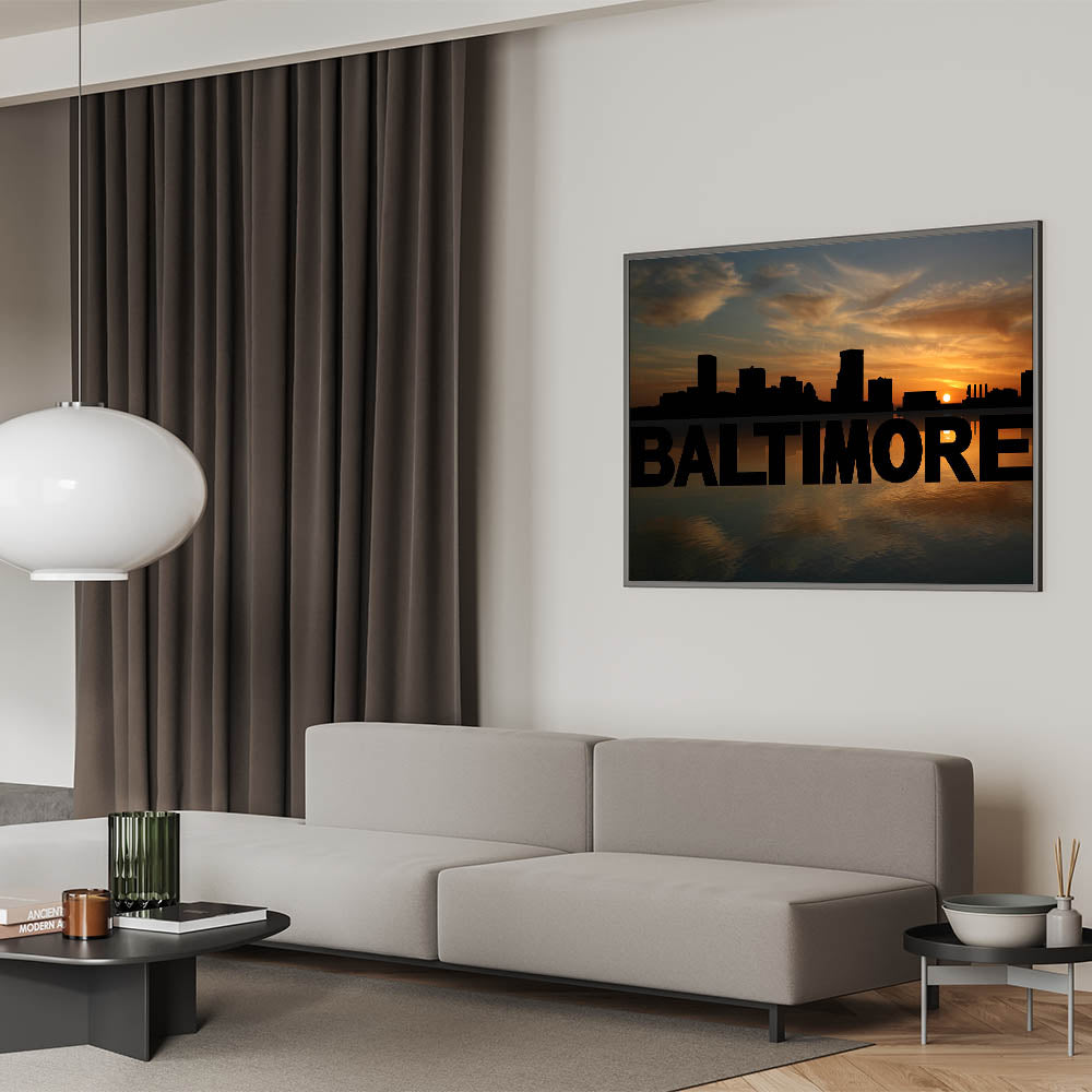 Capture the beauty of the city with this stunning Baltimore Wall Art Collection piece, showcasing a mesmerizing sunset over the Baltimore skyline. The silhouette of the city against the vibrant, warm sky creates an unforgettable scene that any art lover will appreciate. This Baltimore Skyline Canvas is perfect for anyone looking to enhance their space with a touch of Baltimore’s scenic artwork.