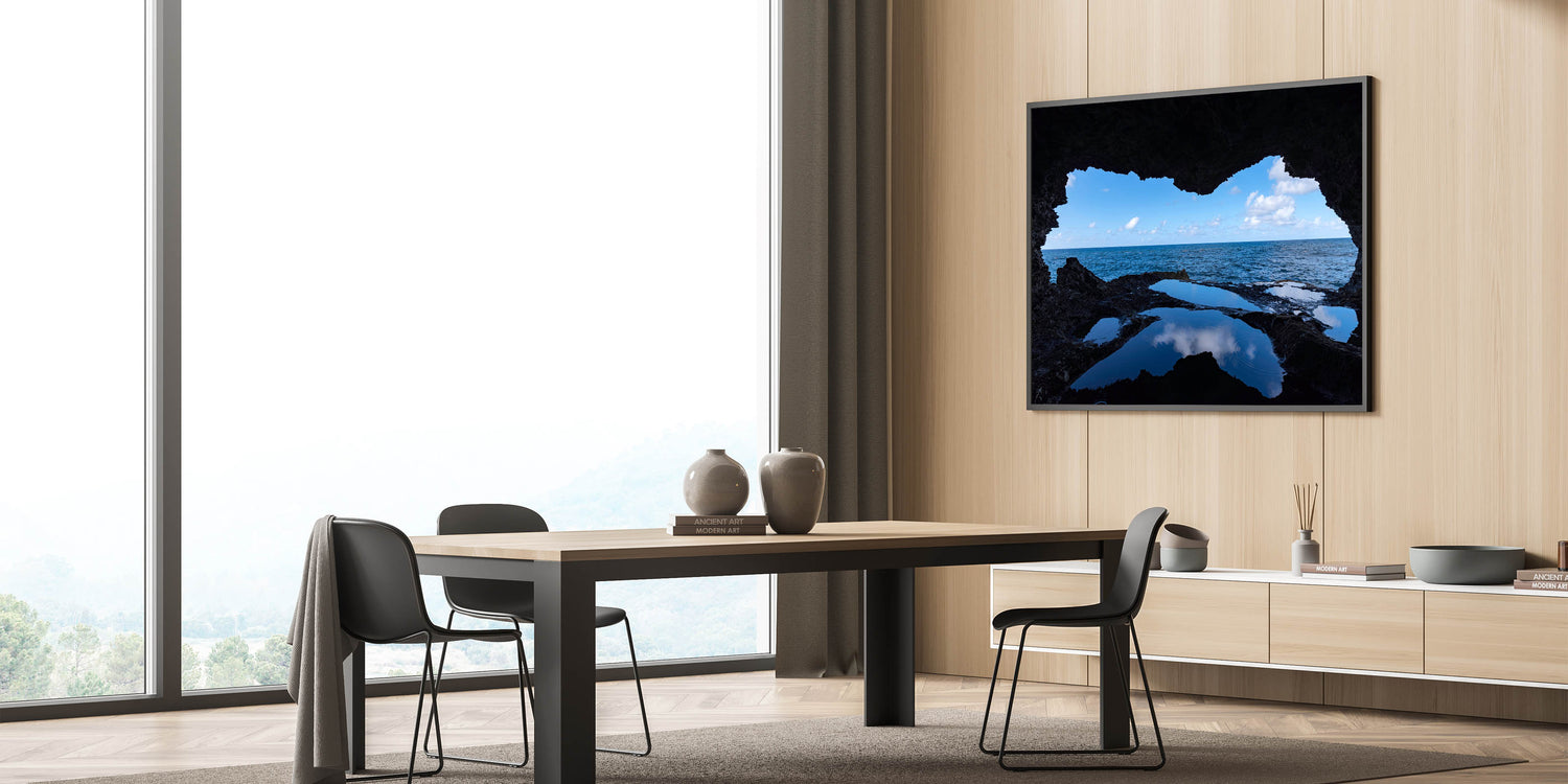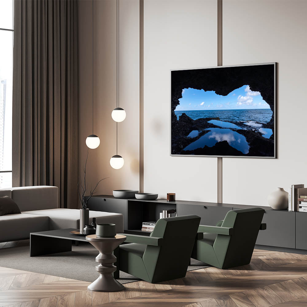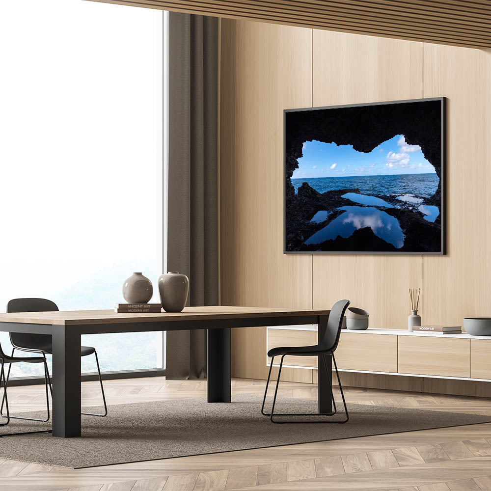 Bring the mystery and beauty of the Barbados coastline into your home with this stunning coastal wall art. The unique perspective of viewing the ocean through a cave adds a sense of adventure and wonder to your decor.
