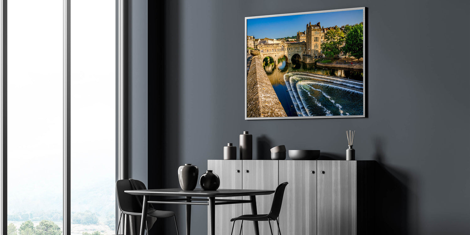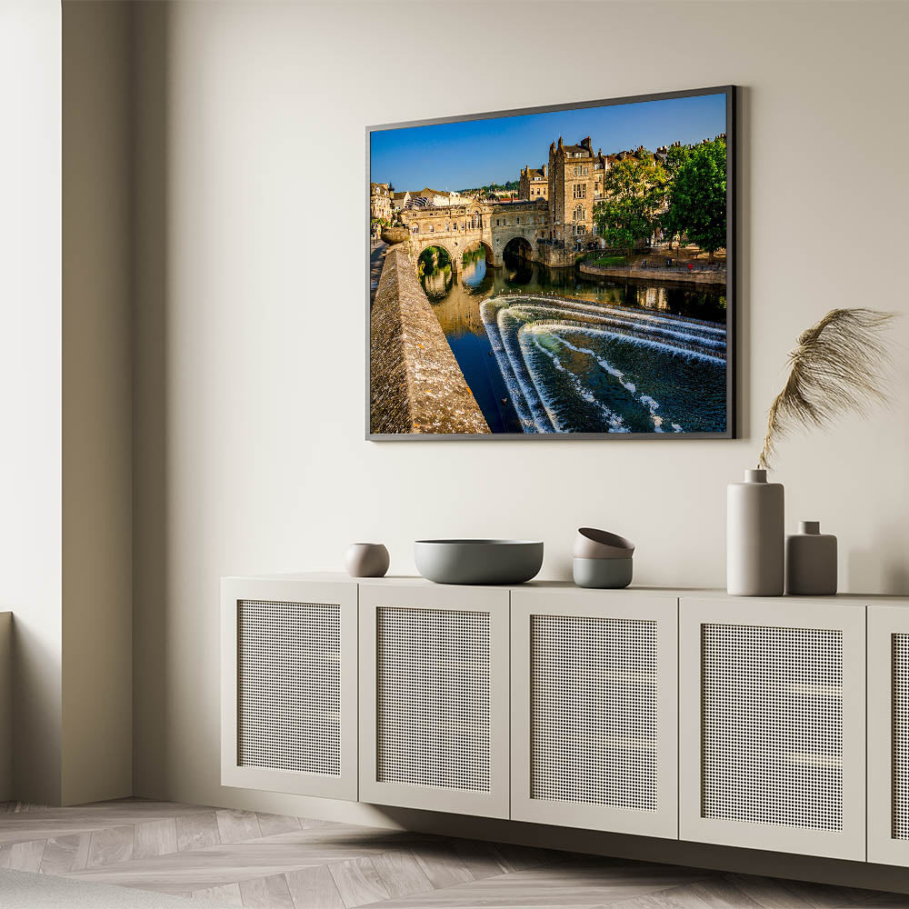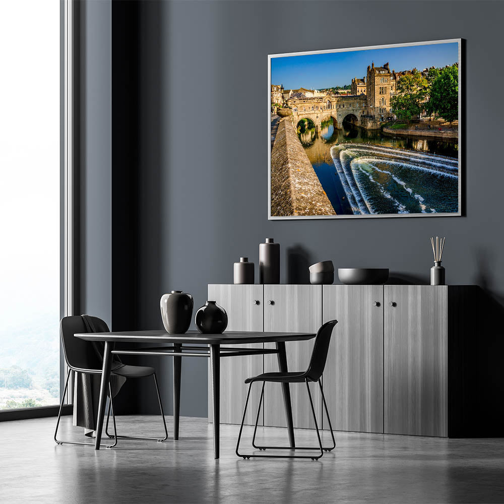 This vibrant Bath England wall art captures a stunning daytime view of the iconic Pulteney Bridge and the cascading weir below. The bright sunlight enhances the golden tones of the historic architecture, while the flowing water adds a dynamic element to the scene. The beautiful reflection of the bridge and surrounding greenery creates a serene yet lively atmosphere, making this artwork an ideal addition to any home or office space.