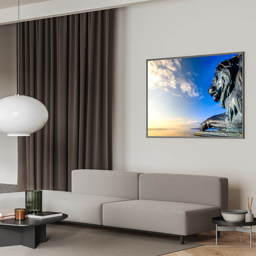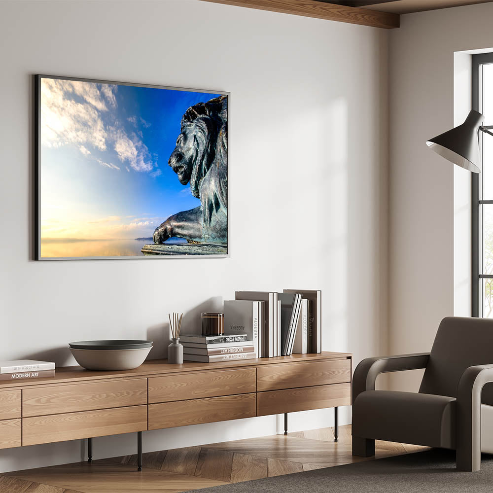 This powerful artwork features a detailed lion sculpture set against the peaceful backdrop of a calm lake and expansive sky. The contrast between the boldness of the lion and the serenity of the surrounding scenery creates a striking visual composition that captures the essence of Bavarian heritage and natural beauty. Ideal for those who appreciate the grandeur of both art and nature, this piece will bring a sense of strength and tranquility to any space.