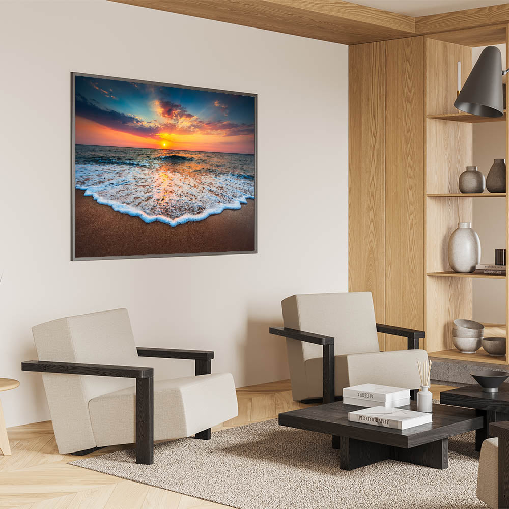 Transform your living space into a serene coastal retreat with this stunning beach landscape wall art. Capturing the mesmerizing beauty of a sunset over the ocean, this piece is perfect for bringing a touch of tranquility to your home. The gentle waves caress the sandy shore as the sky is painted in hues of orange, pink, and blue, creating a calming and picturesque scene.