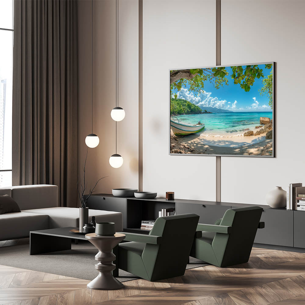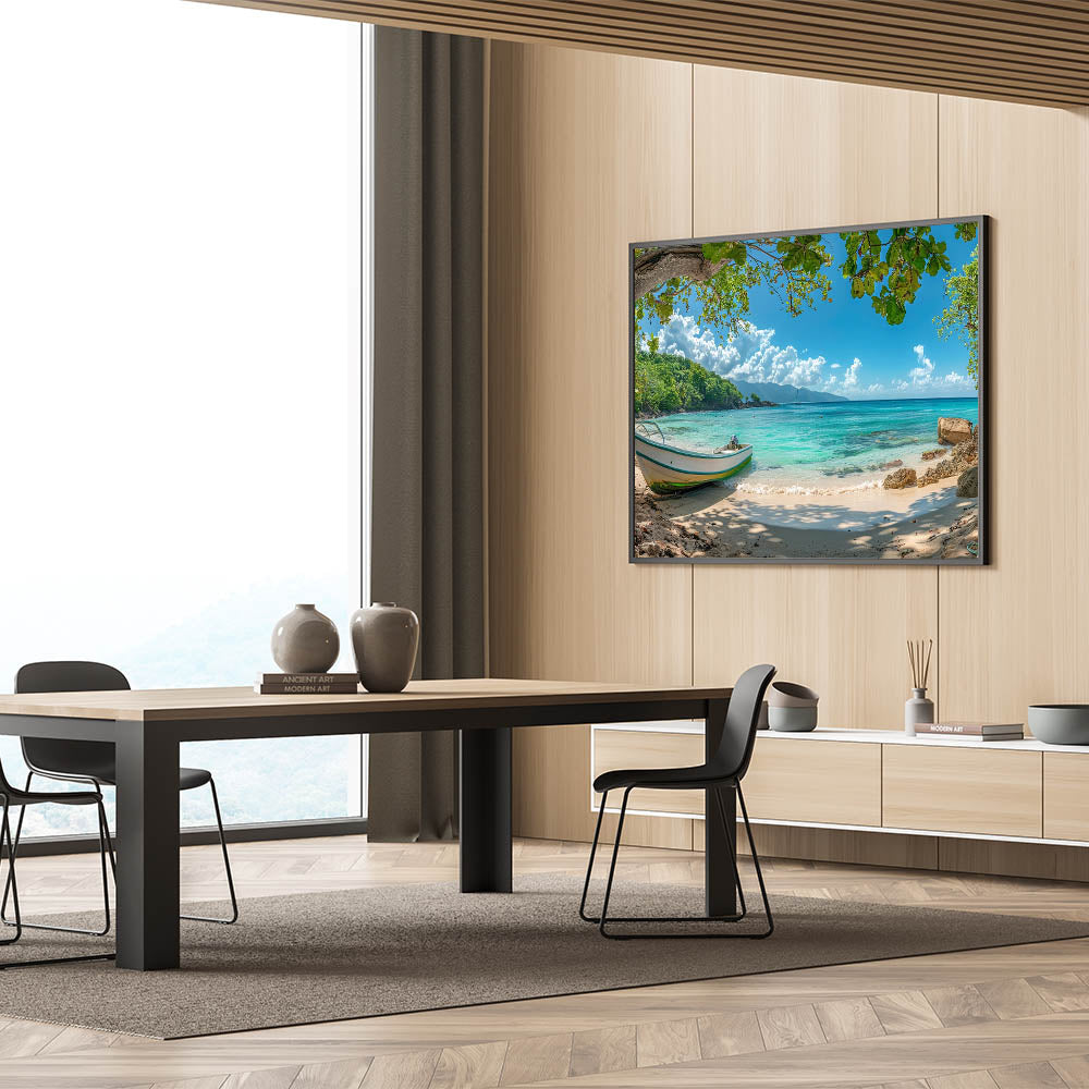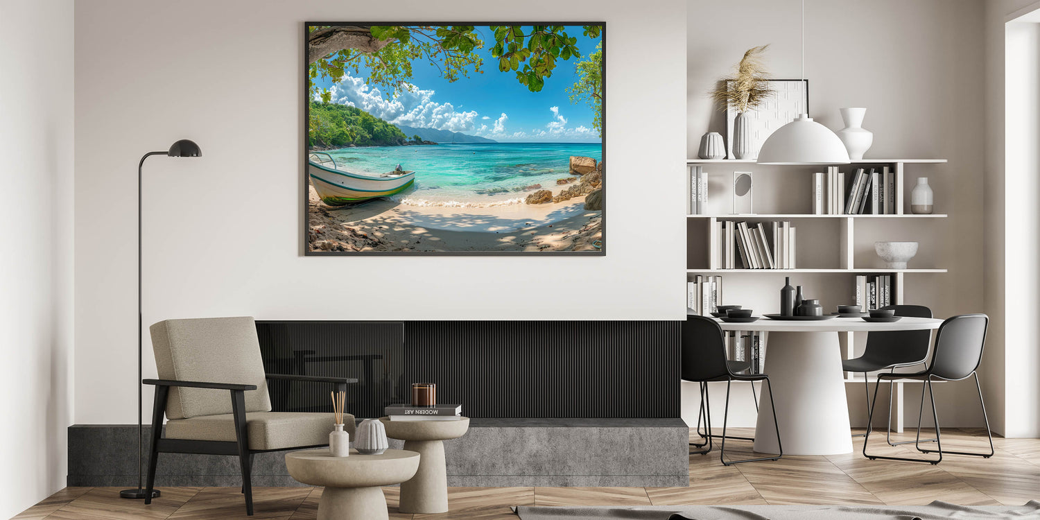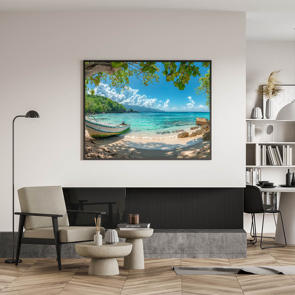 This stunning wall art transports you to the idyllic shores of Aruba, featuring a peaceful boat resting on the sandy beach, surrounded by lush greenery and vibrant turquoise waters. The calm ocean stretches out into the distance, framed by the majestic mountains and serene sky. Perfect for creating a tropical ambiance in any room, this artwork captures the tranquility and natural beauty of the Caribbean, offering a sense of relaxation and escape.