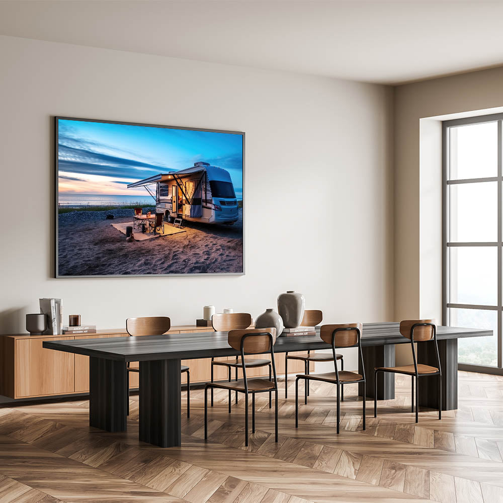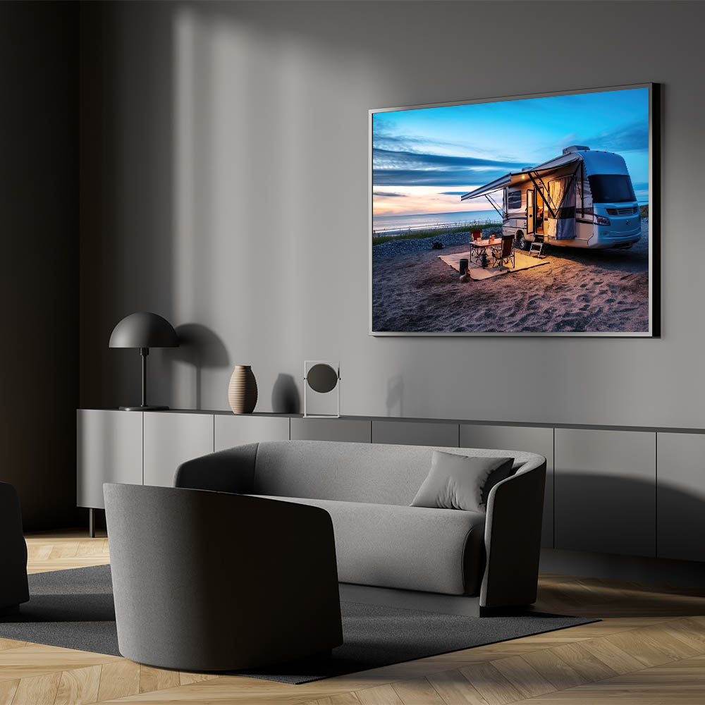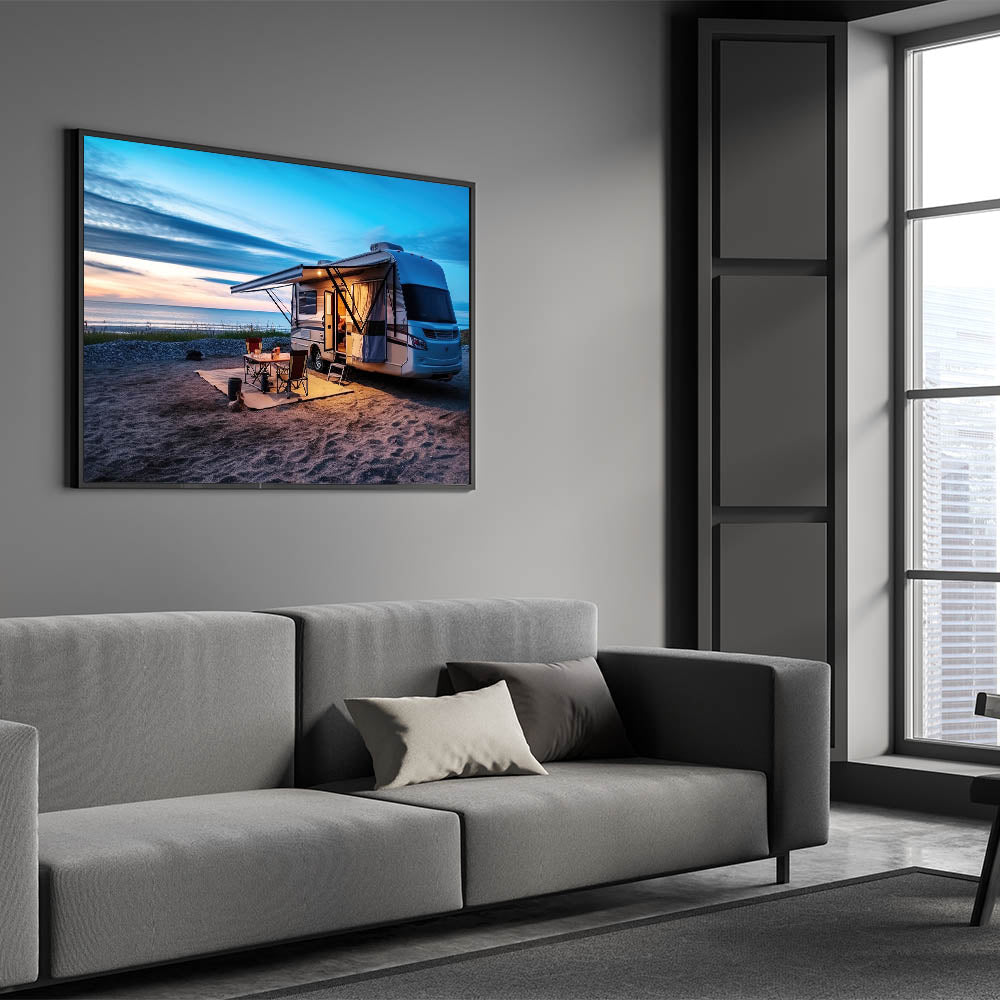 Beachside Camper at Sunset - Tranquil Coastal Camping Wall Art Print