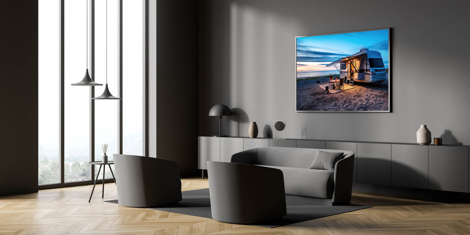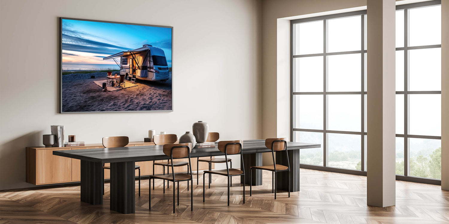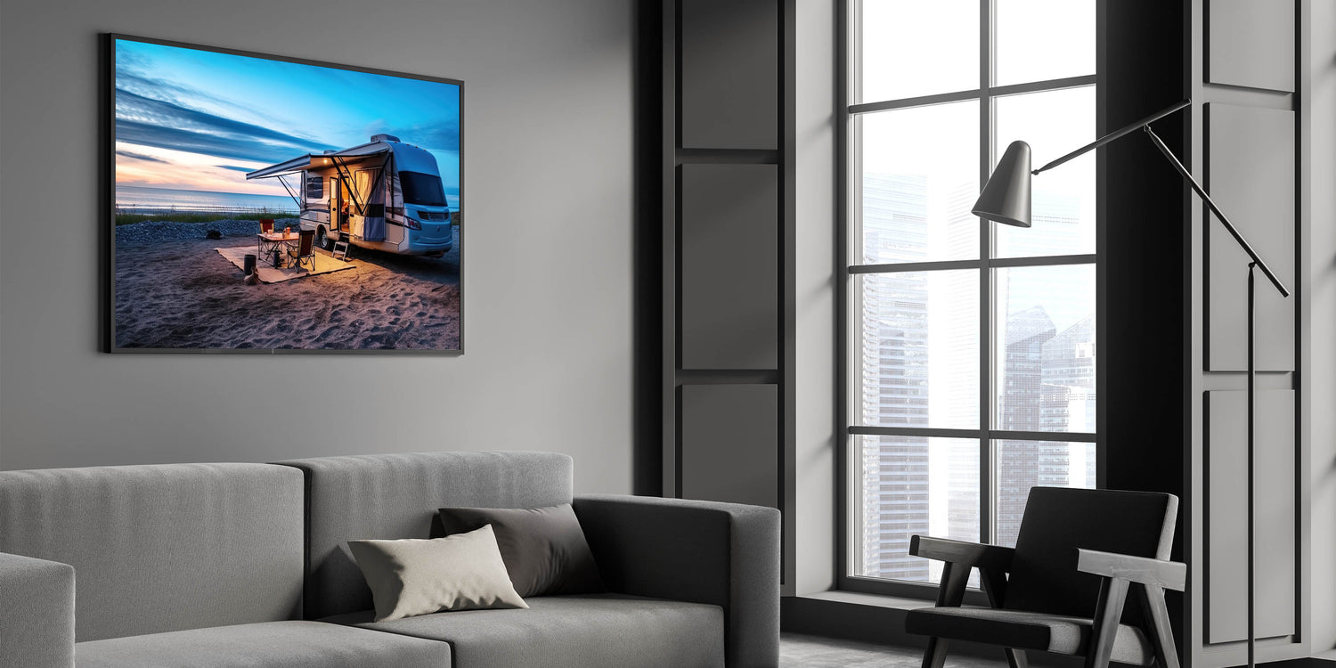 Beachside Camper at Sunset - Tranquil Coastal Camping Wall Art Print