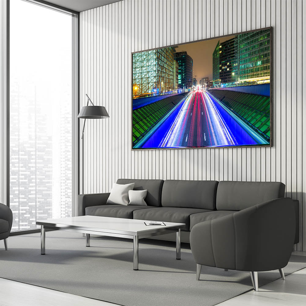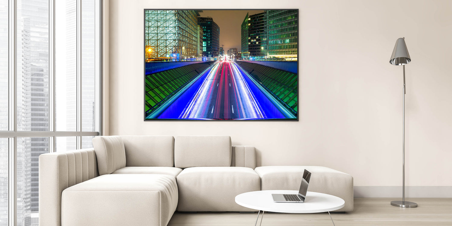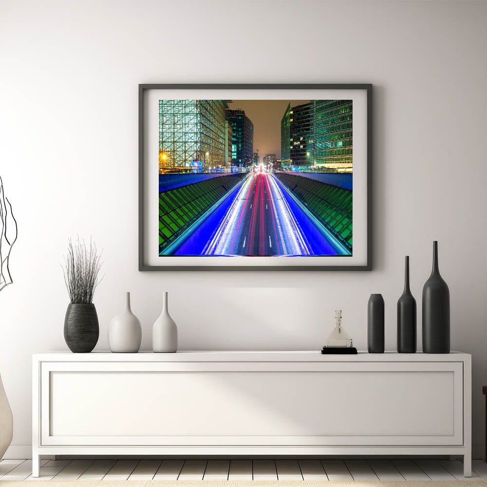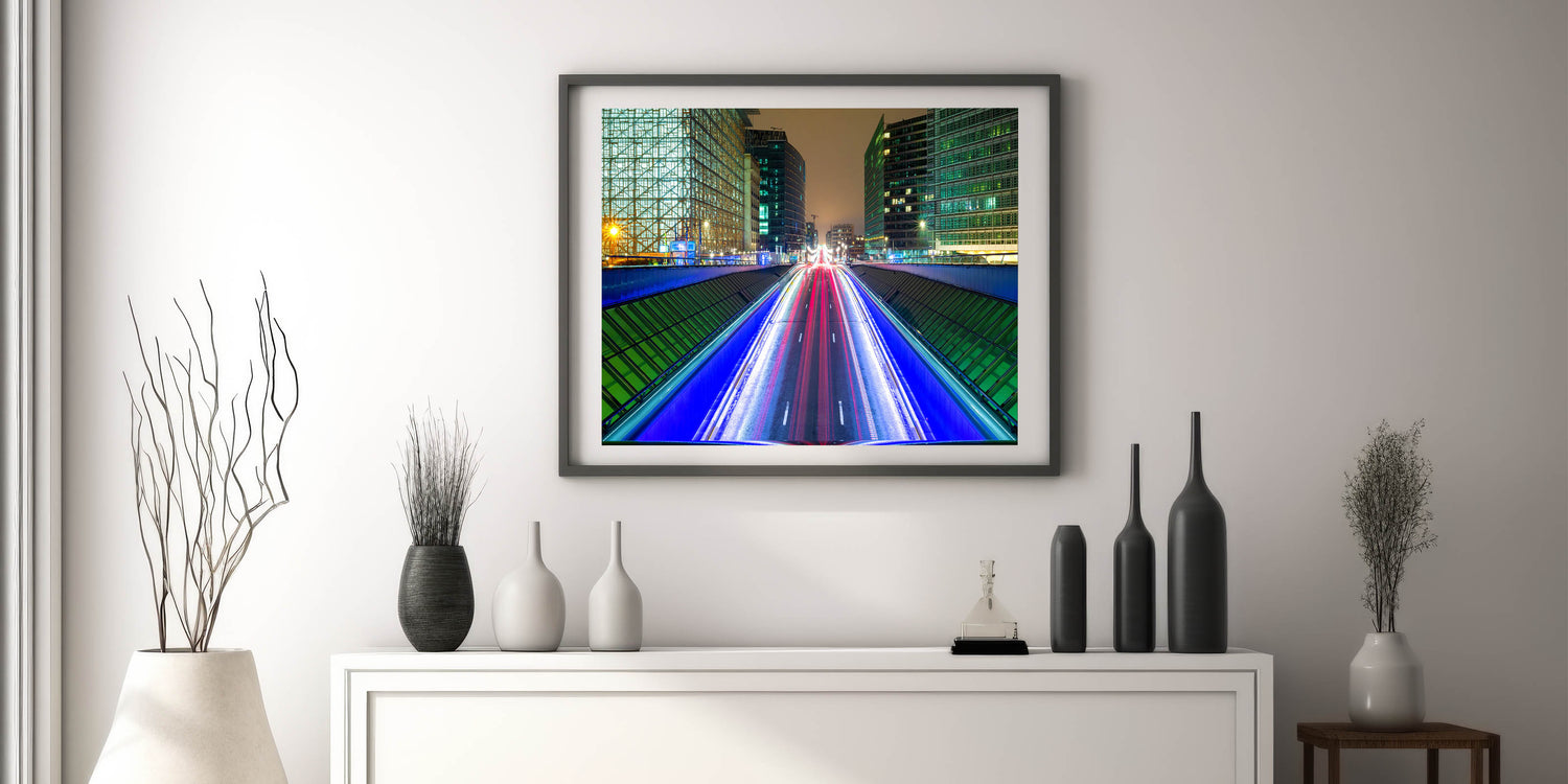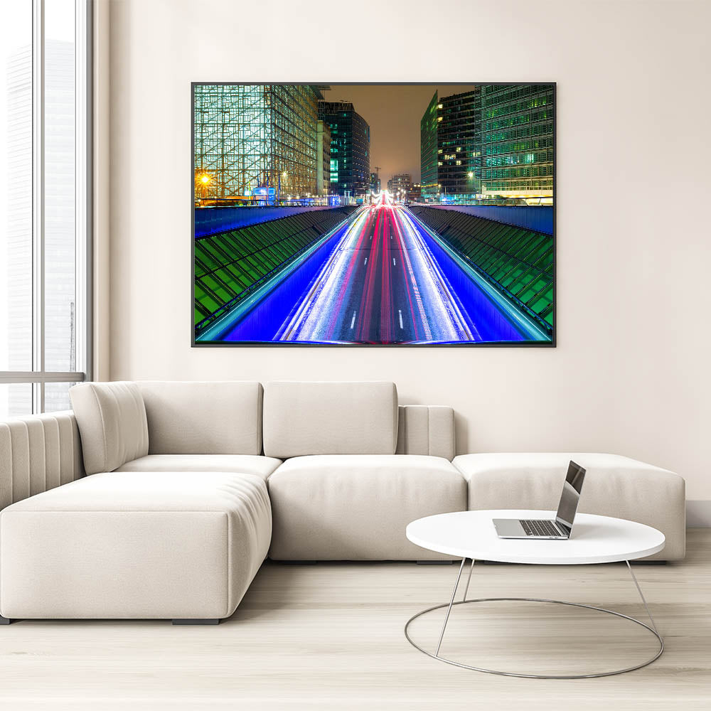 Enhance your home with the dynamic energy of this Belgium wall art, showcasing a mesmerizing display of light trails cutting through the modern skyline of Brussels. This Belgium canvas art captures the vibrant pulse of the city at night, offering a modern and striking visual that is perfect for contemporary spaces. The glowing lights and sleek architectural elements make this piece an ideal fit for those who appreciate urban landscapes and vibrant city scenes.