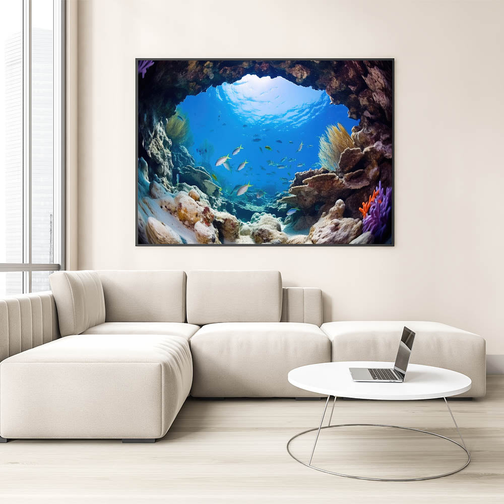 Dive deep into the heart of Belize's marine beauty with our "Underwater Coral Paradise Canvas" from the Belize Scenery by Region collection. This artwork captures a mesmerizing view from beneath the waves, showcasing a vibrant coral reef teeming with life.