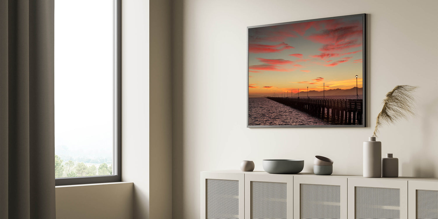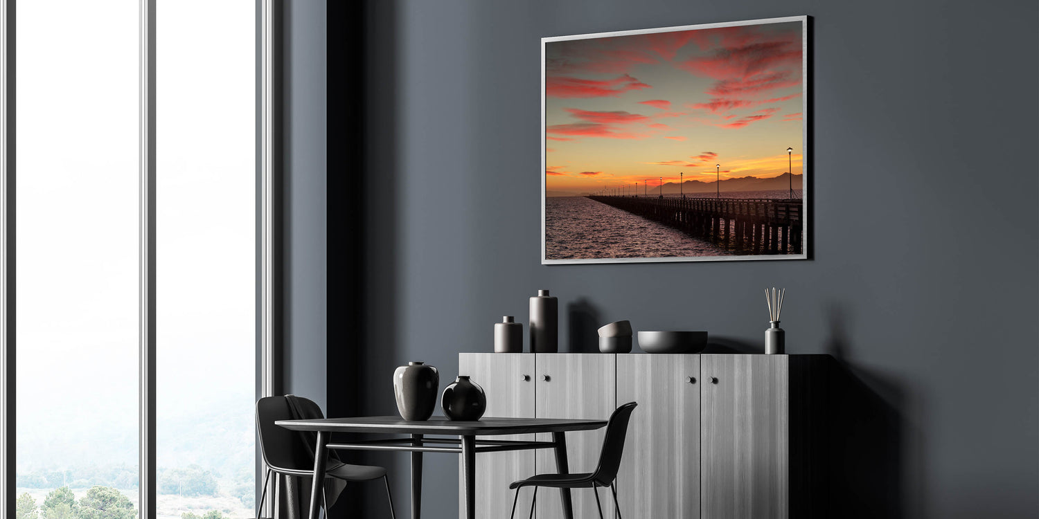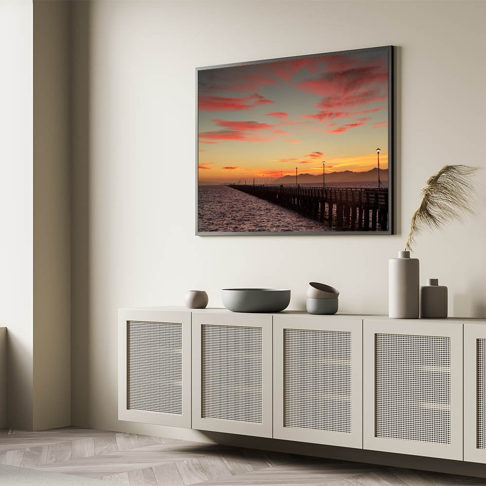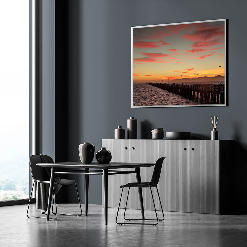Capture the serene beauty of Berkeley’s coastline with this stunning wall art featuring a glowing sunset over a peaceful pier. The vibrant hues of the evening sky reflect on the water, creating a tranquil scene perfect for adding warmth and relaxation to your space. This Scenic Berkeley print is ideal for those who love the calming presence of the ocean and the soft glow of sunset colors.
