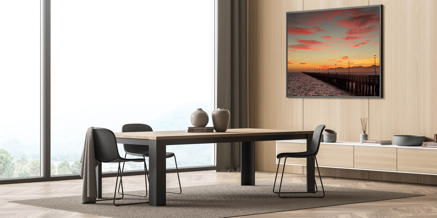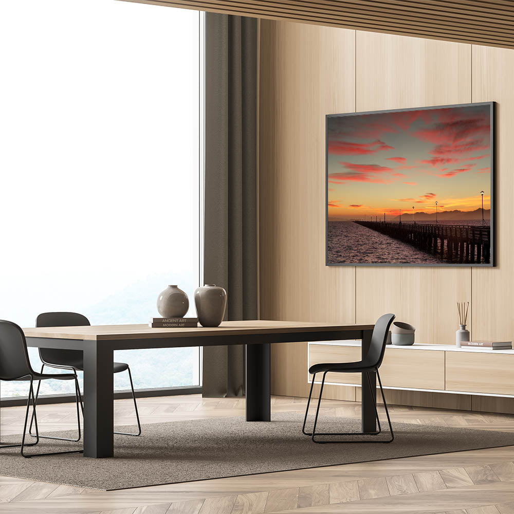- Brilliant, high-resolution print showcasing a peaceful pier at sunset with vivid orange, pink, and blue tones.