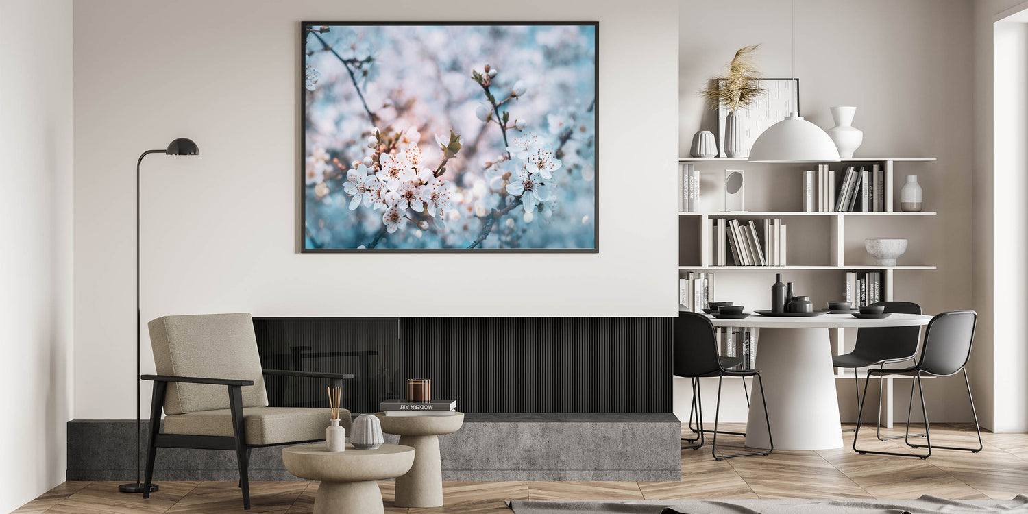 Celebrate the beauty of spring with this captivating floral wall art, showcasing a close-up of delicate cherry blossoms in full bloom. The soft blue and white tones, combined with a stunning bokeh effect in the background, create a dreamy and serene atmosphere. Perfect for bringing a sense of peace and renewal to your living room, bedroom, or office, this flower canvas art will add elegance and charm to any space.