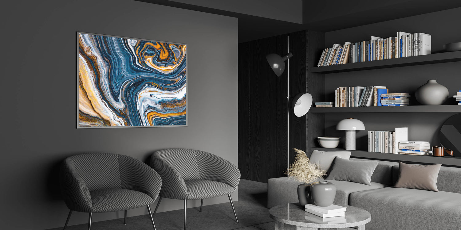 Perfect for a living room, office, or bedroom, this fluid abstract canvas adds a touch of luxury and artistic flair to any space. Its bold design and flowing colors will captivate and enhance your decor.
