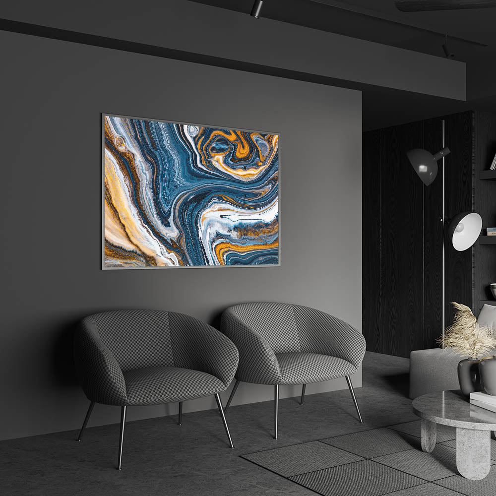 Immerse yourself in the mesmerizing flow of this Blue and Gold Fluid Abstract Canvas. This artwork captures the dynamic movement of swirling blues, golds, and whites, creating a captivating and energetic visual experience. The fluid design evokes a sense of motion and elegance, making it a perfect addition to modern and contemporary interiors. The rich color palette and intricate patterns make this piece a stunning focal point that will elevate any space.