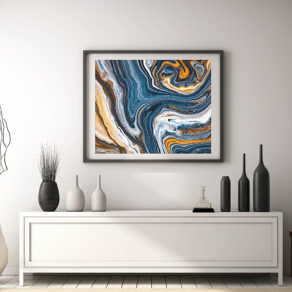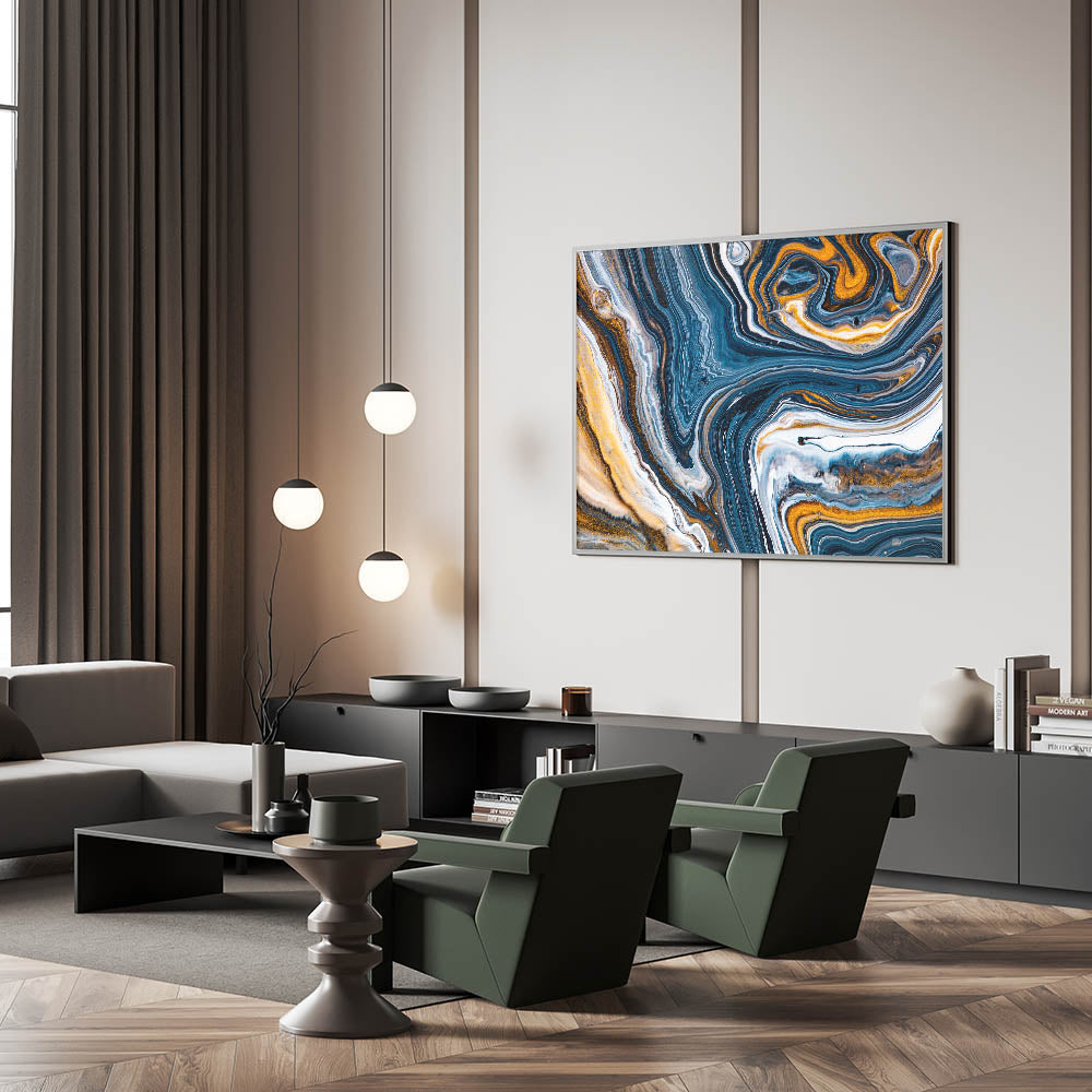 - Vibrant and Dynamic Design: The swirling blue and gold tones create a bold and captivating visual effect.