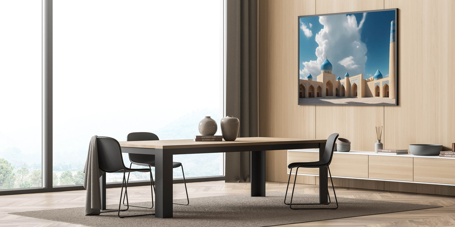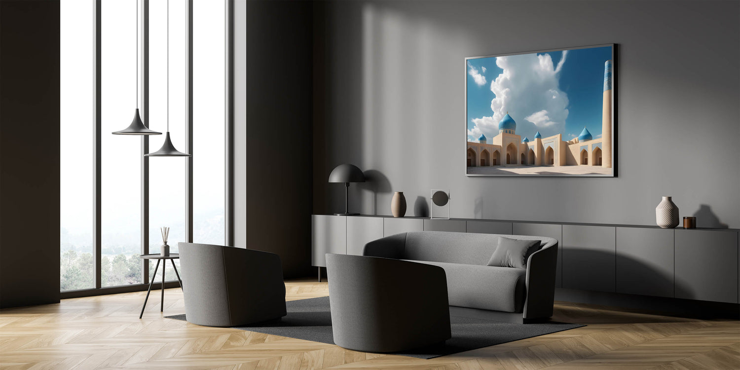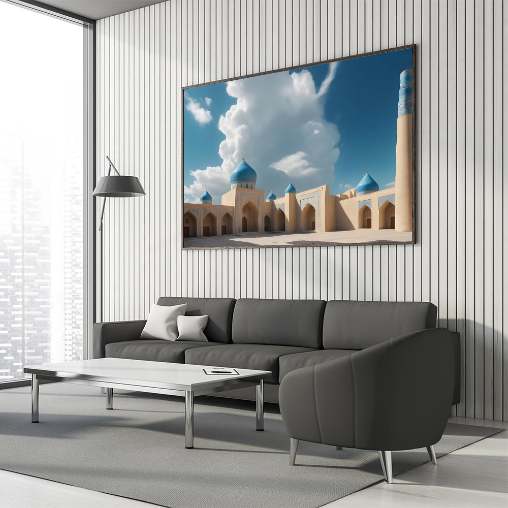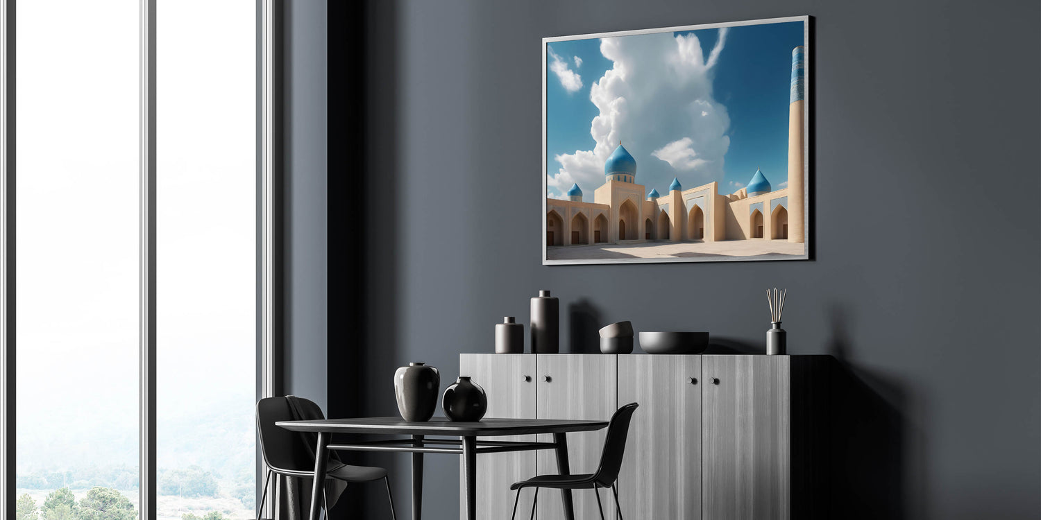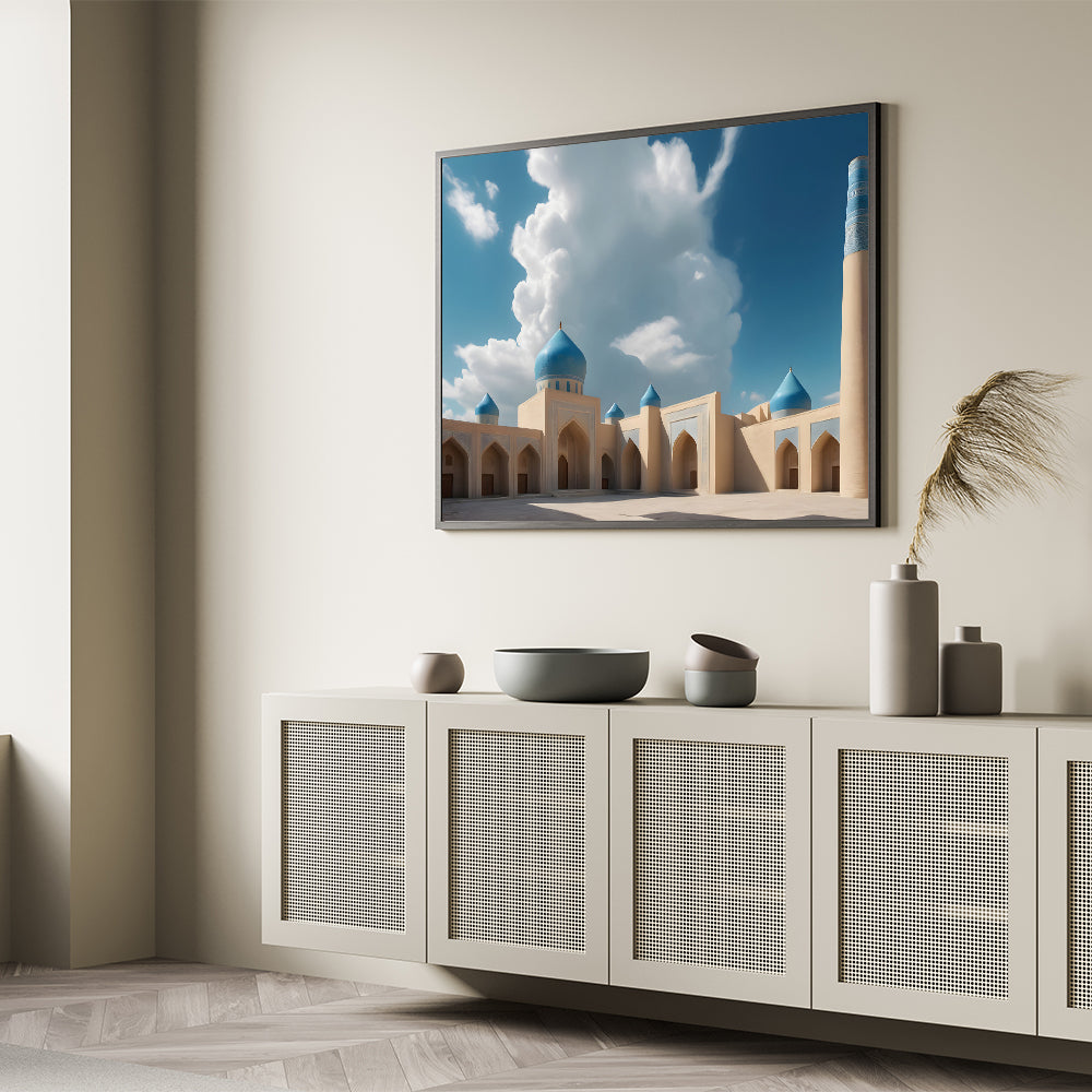 Bring the majestic beauty of Islamic architecture into your home with this stunning blue domes wall art. Featuring an impressive mosque with vibrant blue domes against a backdrop of soft clouds and clear skies, this artwork captures the tranquility and grandeur of traditional design. The intricate detailing and rich colors make this piece a captivating focal point for any room. Perfect for those who appreciate the beauty of sacred structures and cultural heritage, this print adds a touch of elegance and serenity to your decor.