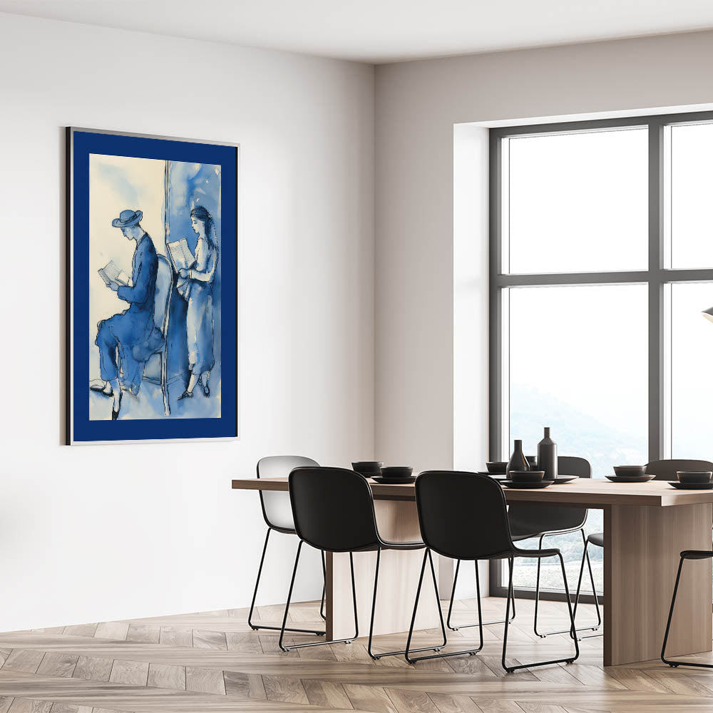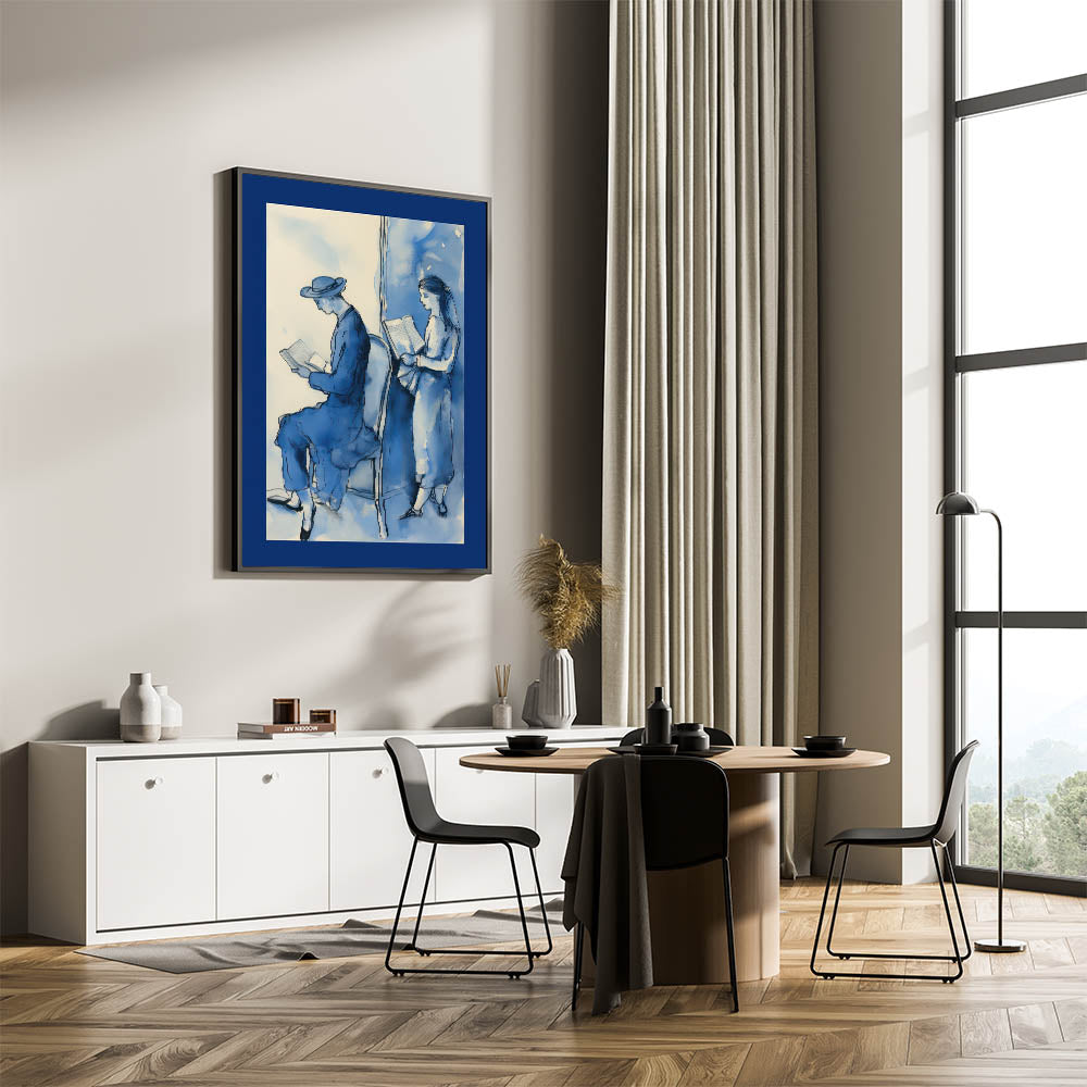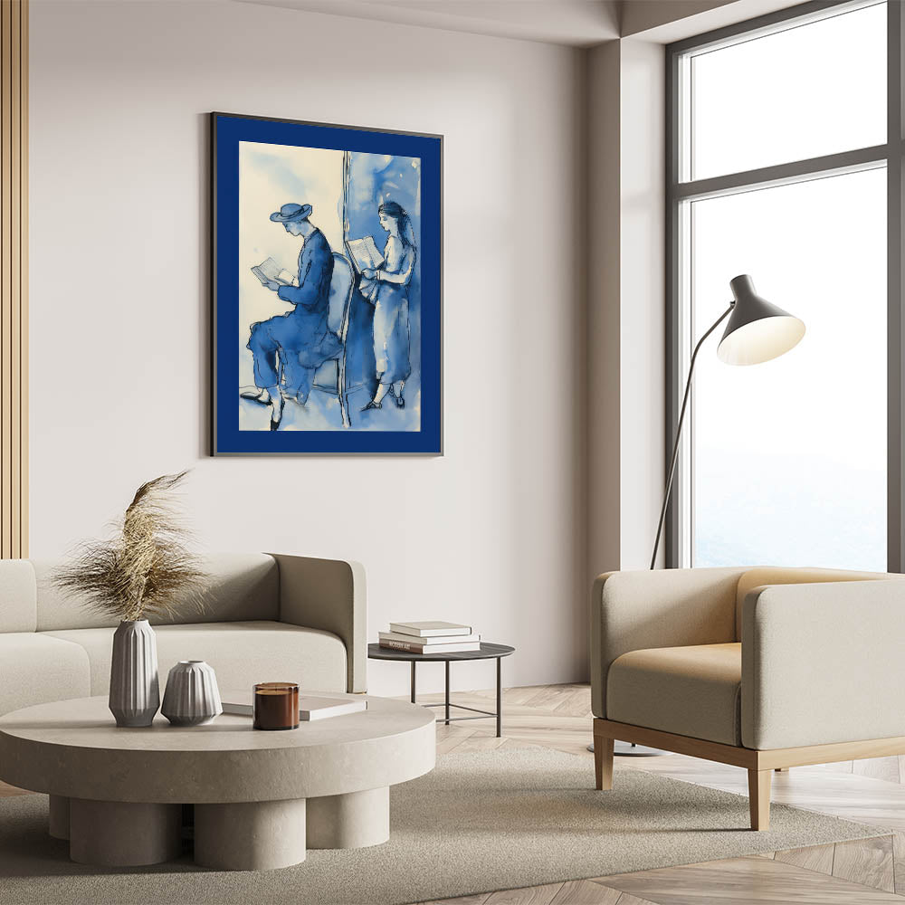 - Tranquil Reading Scene: Features two figures engrossed in reading, portrayed in deep blue tones that create a peaceful yet vibrant atmosphere.