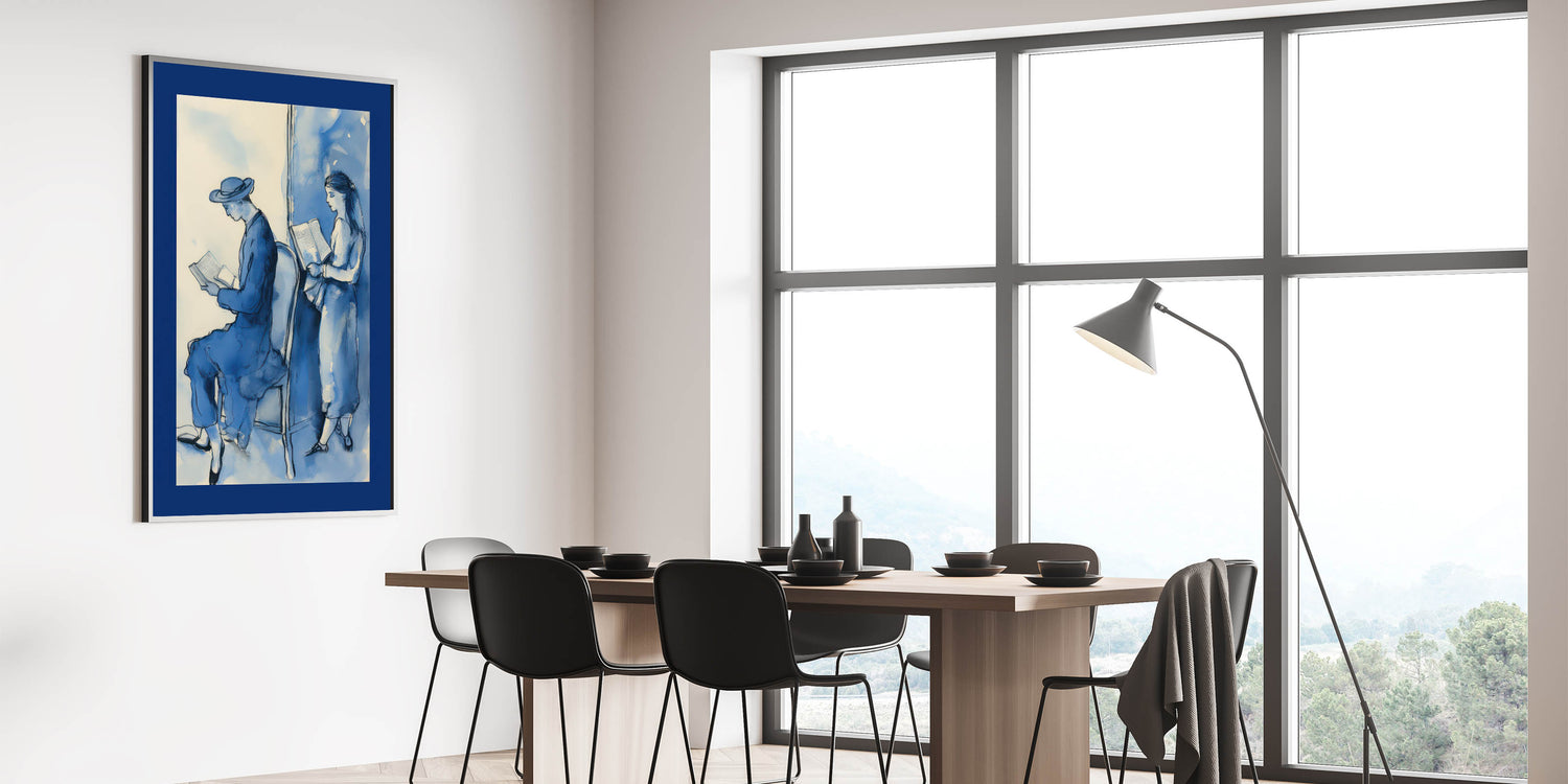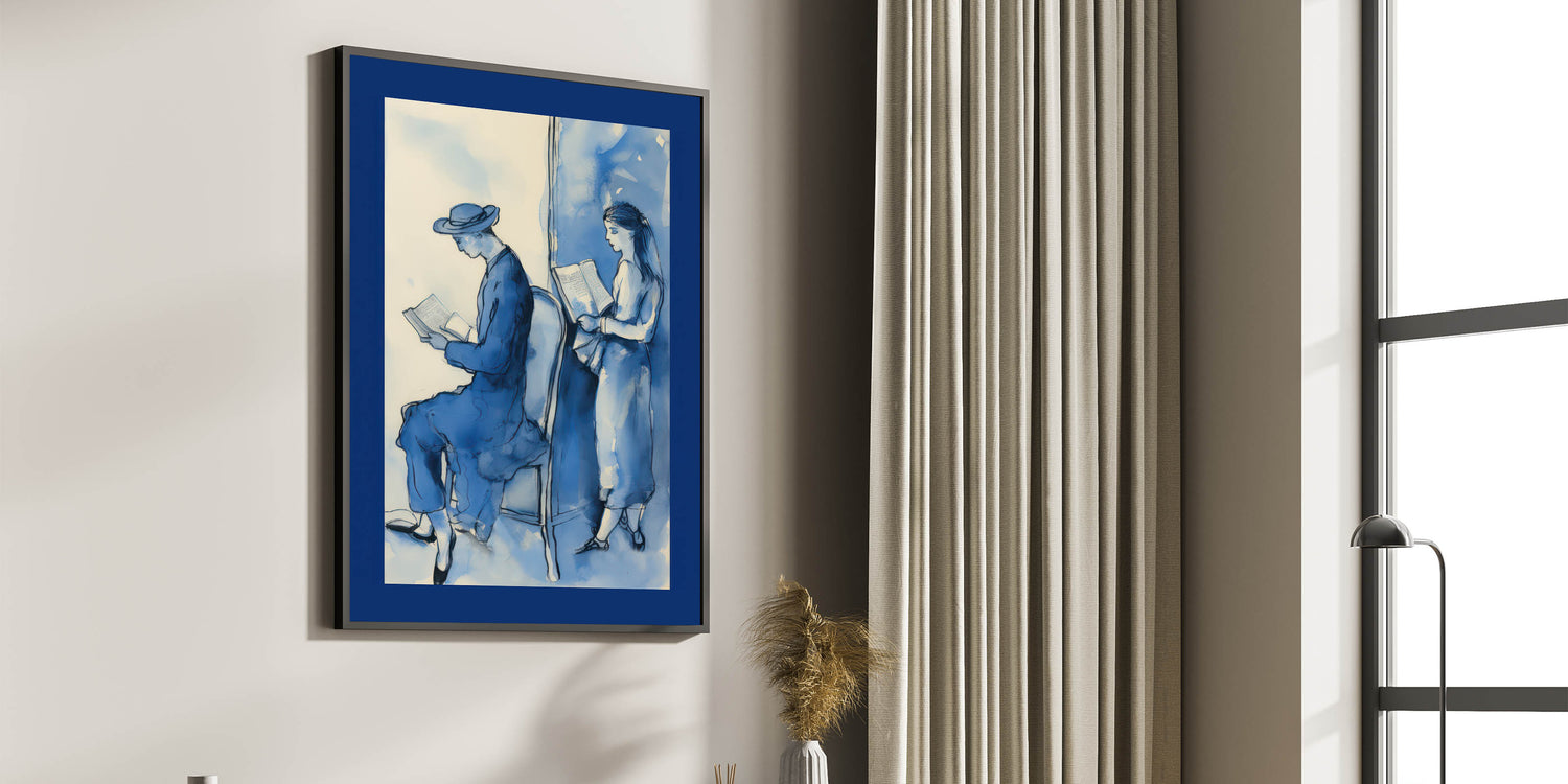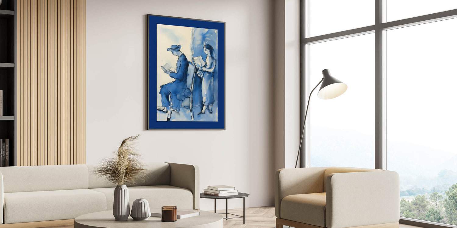 - Tranquil Reading Scene: Features two figures engrossed in reading, portrayed in deep blue tones that create a peaceful yet vibrant atmosphere.