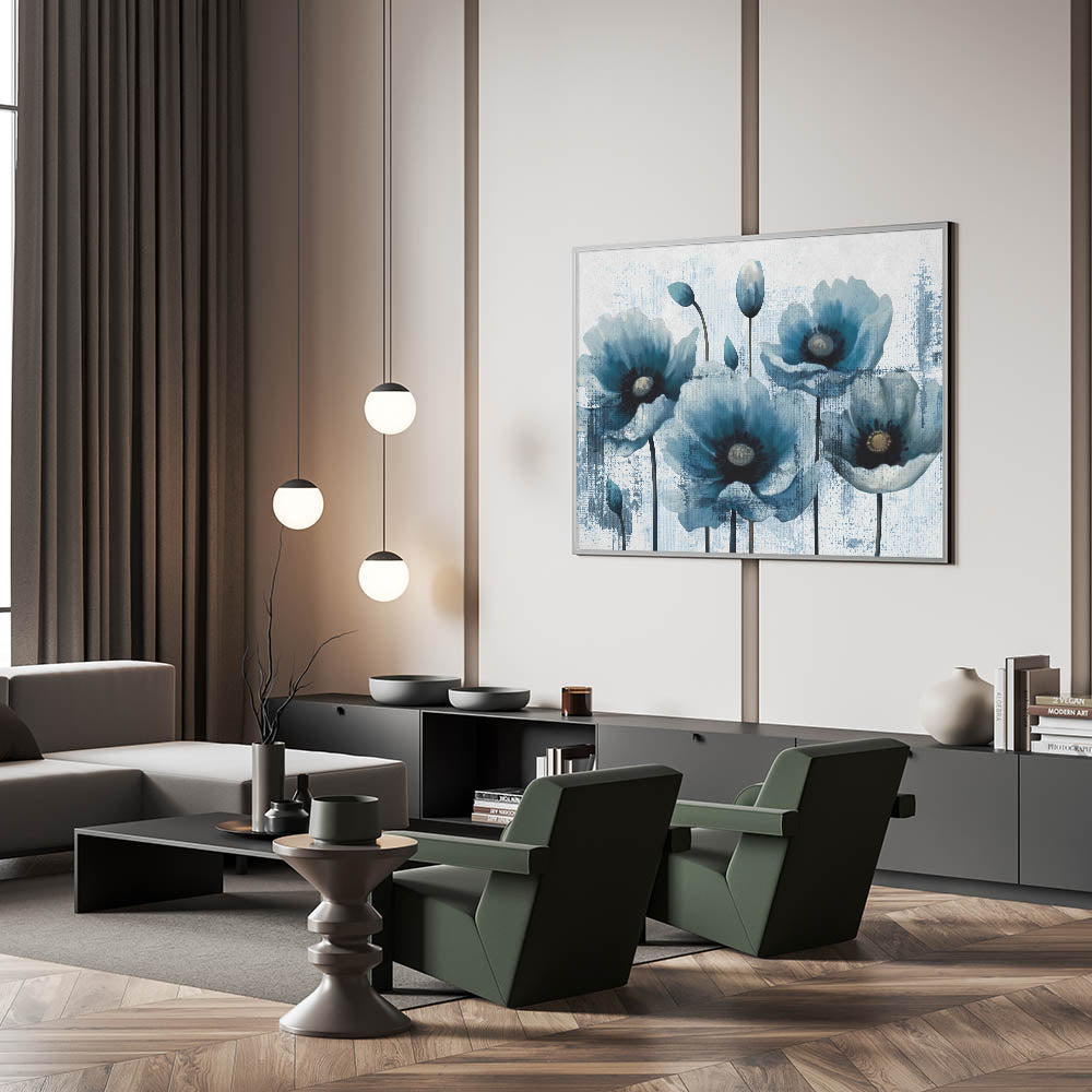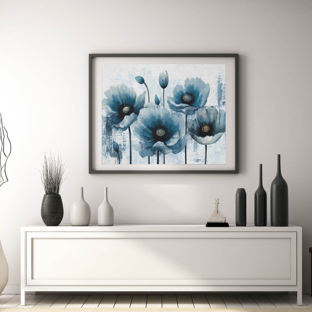 Infuse your space with the calming elegance of this blue floral abstract art. Featuring a stunning arrangement of poppy flowers in rich shades of blue, this artwork captures the delicate beauty of nature with a contemporary twist. The textured background adds depth and contrast, making the vibrant blue flowers stand out, creating a serene yet striking focal point for any room.