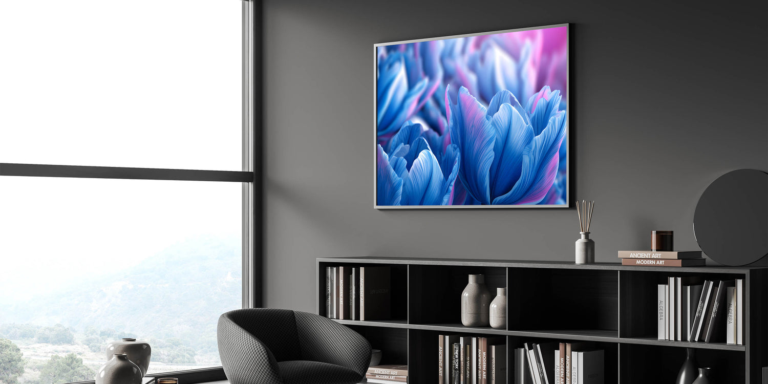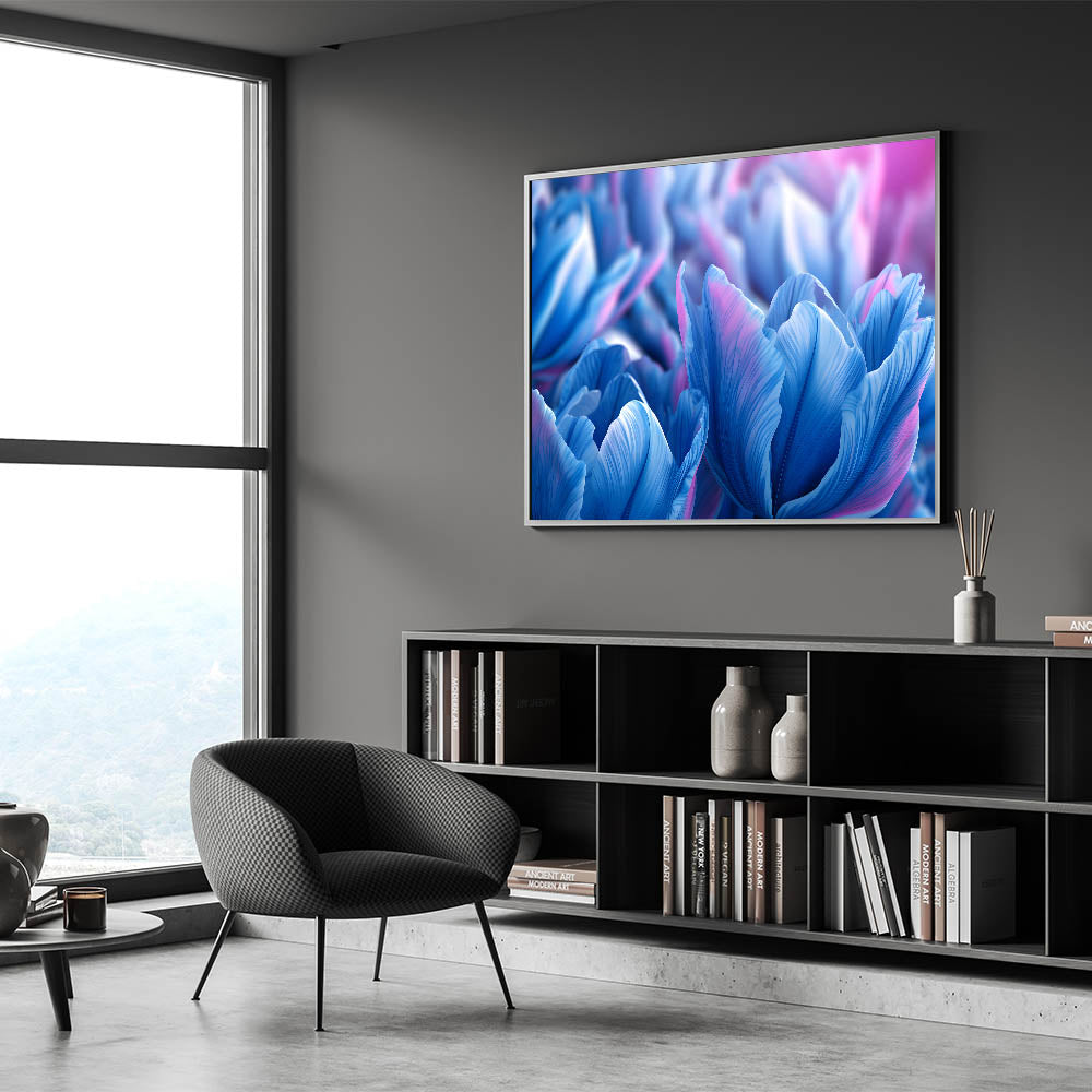 Add a calming and vibrant touch to your space with this stunning blue floral wall art. The nature-inspired design captures the delicate details of blooming petals in shades of blue and pink, bringing an air of tranquility to any room. Available in various high-quality formats, including stretched canvas, acrylic glass, and framed prints, this botanical artwork is ideal for enhancing your interior design.
