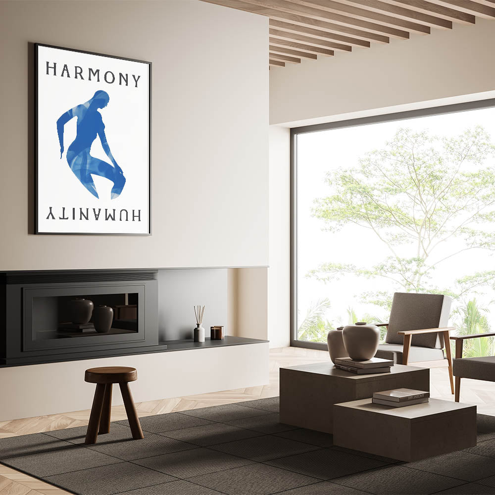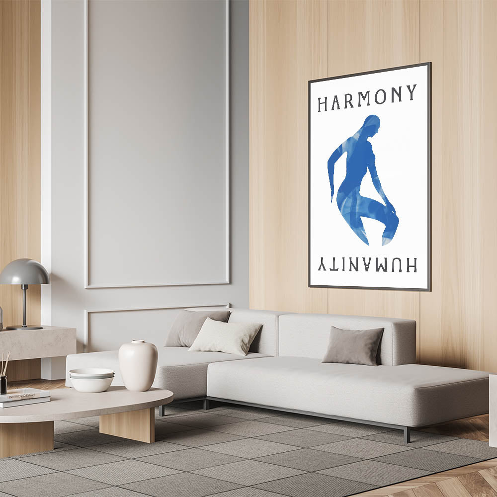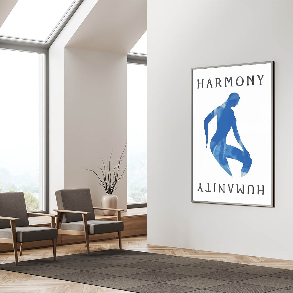 Introducing our Blue Harmony Silhouette, a striking piece that embodies simplicity and contemporary design. This abstract artwork features a serene blue silhouette with the words "Harmony" and "Humanity" on a neutral background, creating a captivating visual effect perfect for modern interiors.